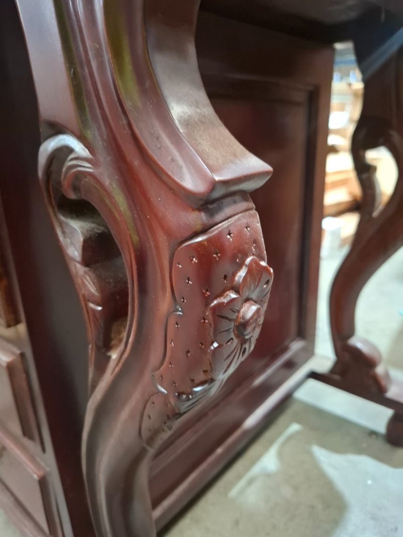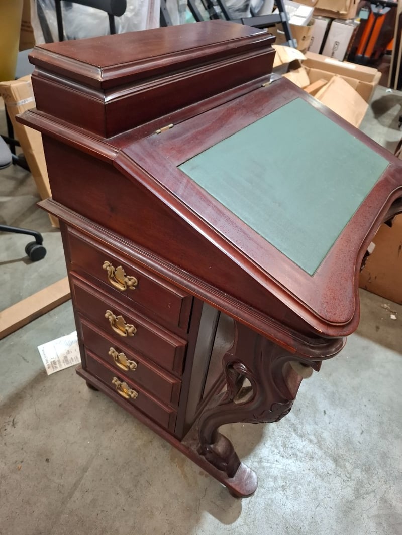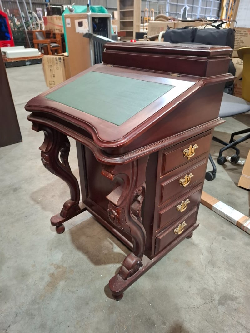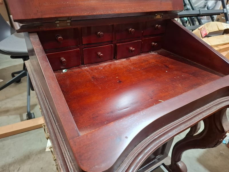 Victorian style writing desk, cherry timber finish, 8 out side drawers, 8 inside drawers