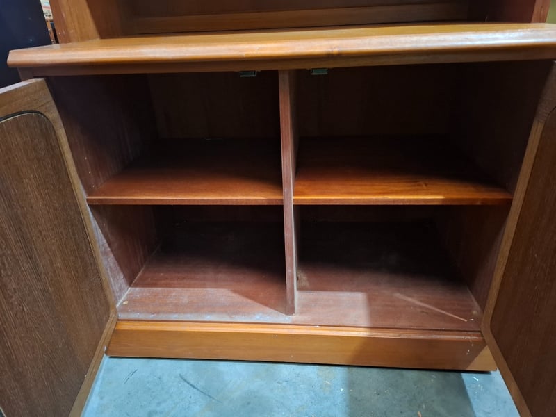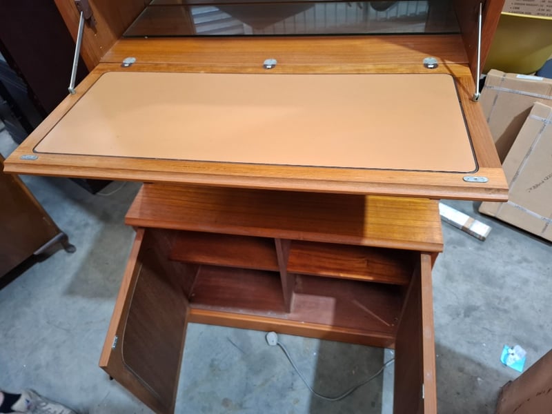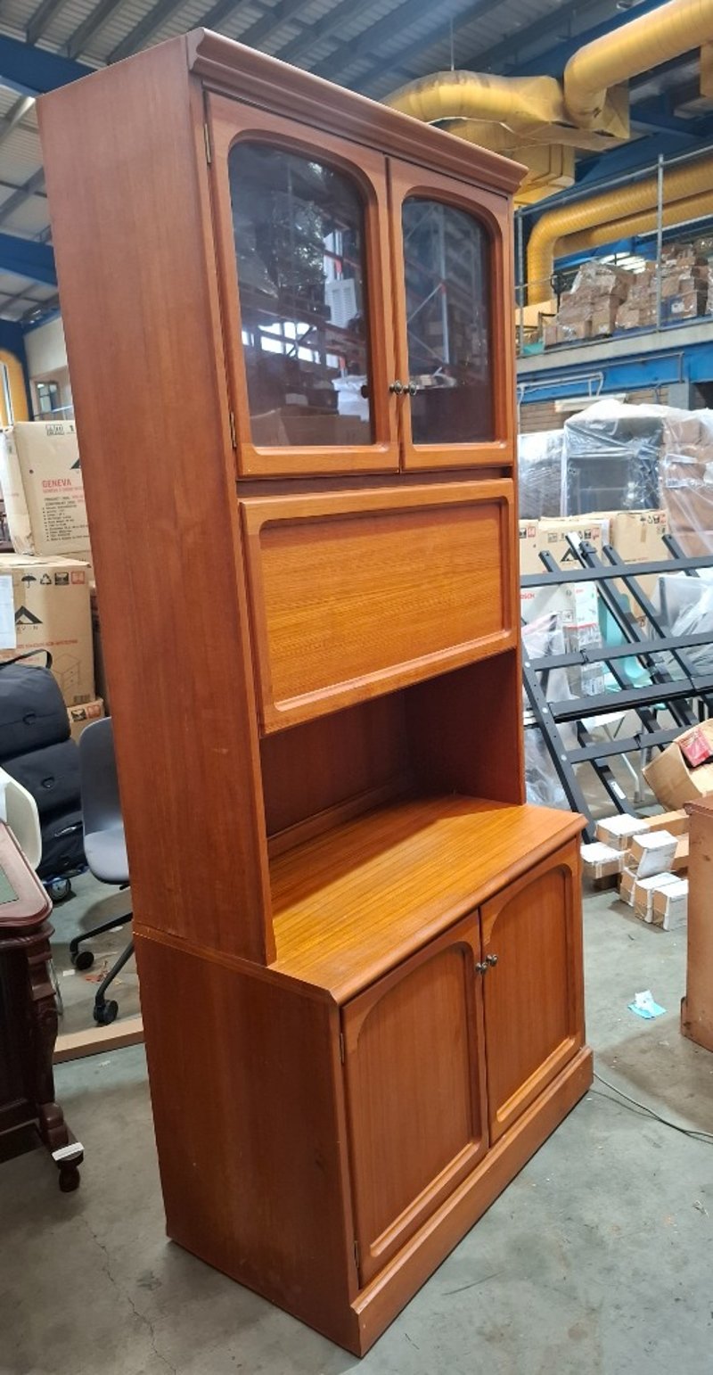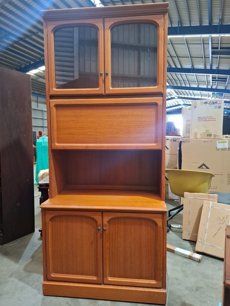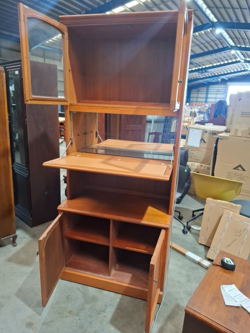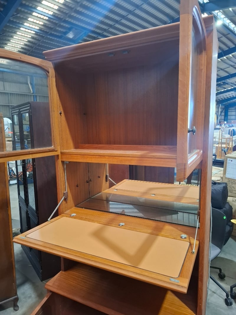 Natural finish timber cabinet , 2 glass doors, Extendible desk with mirror and light, 2 doorDimensions: 91cmW x 51cmD x 211cmHNote: Cleanning required, scratches