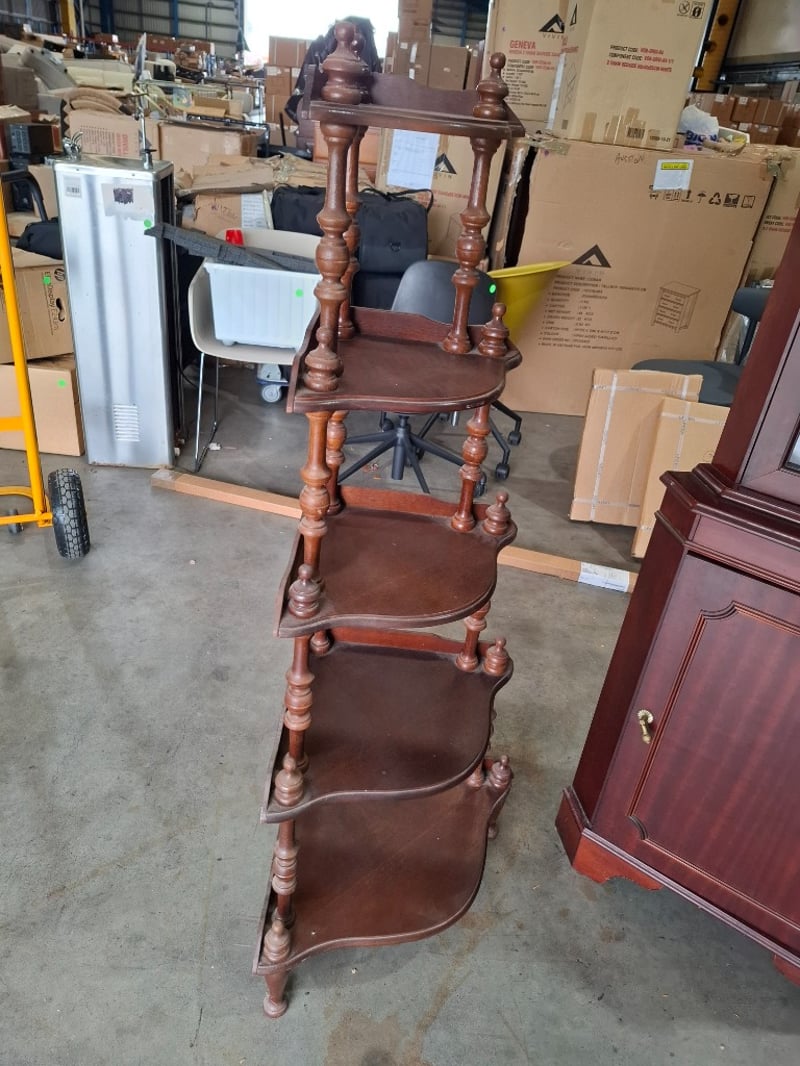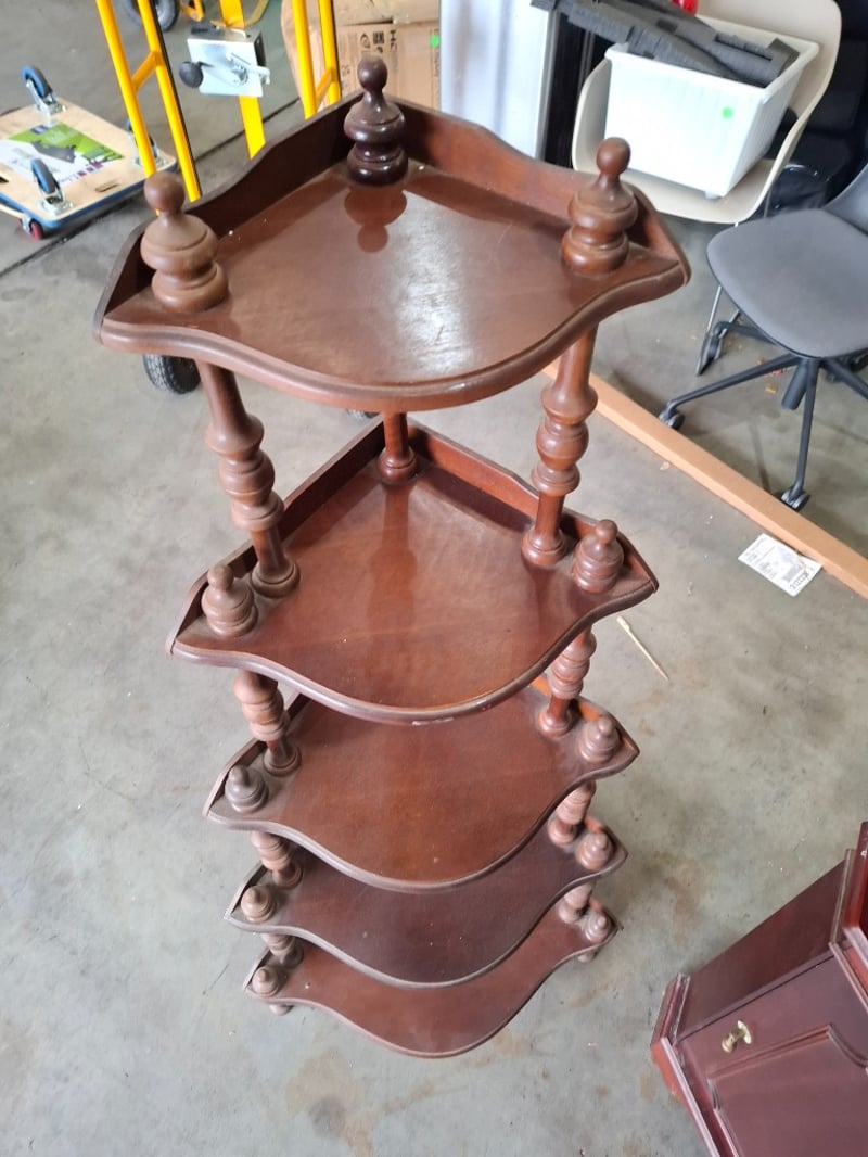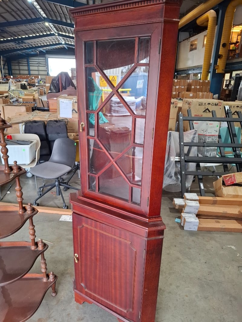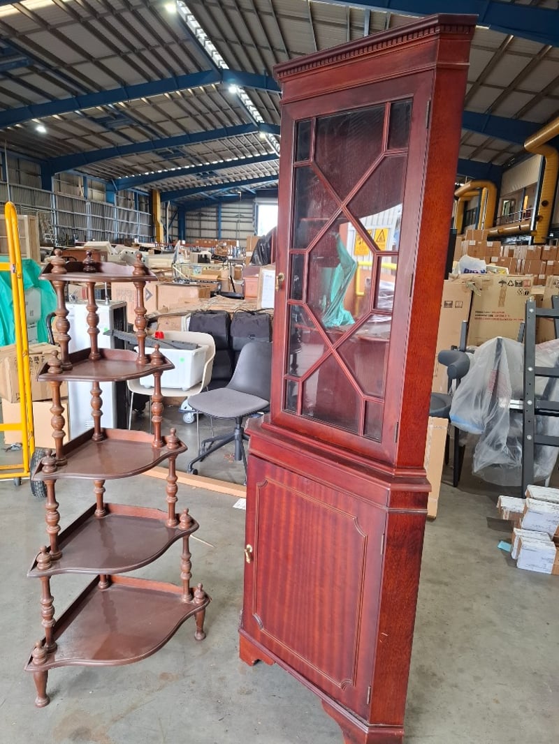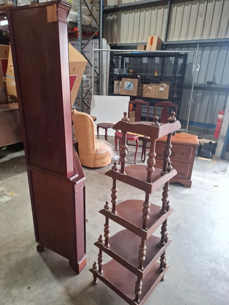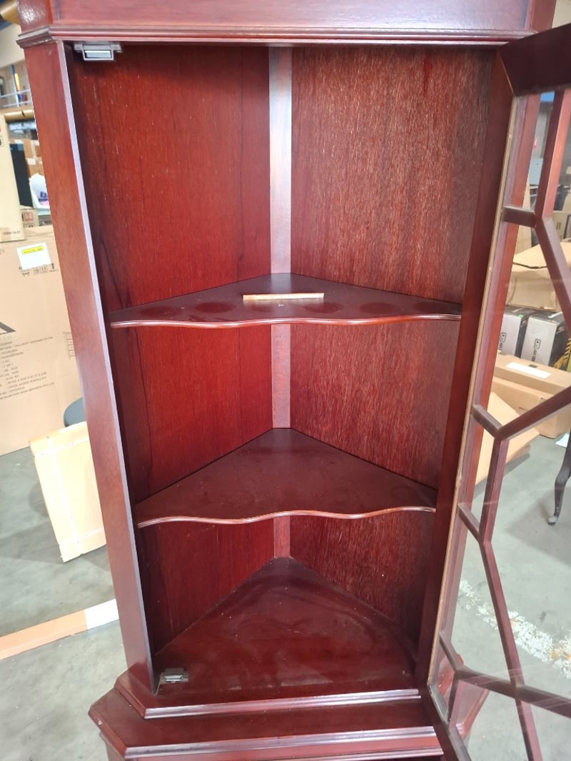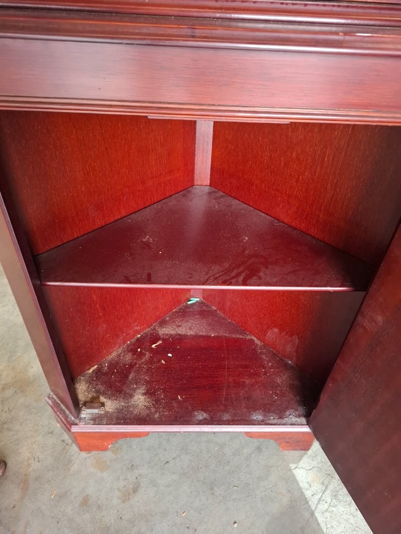 1x corner timber cabinet cherry finish, glass door, 1 door. 1 x corner dark timber shelve 5 tiers. Dimensions:66 cmW x 40cmD x 180cmH.48W cmx 50 cmD x 133cmHNote: Cleanning required, scratches, marks