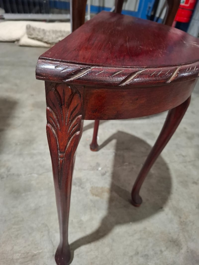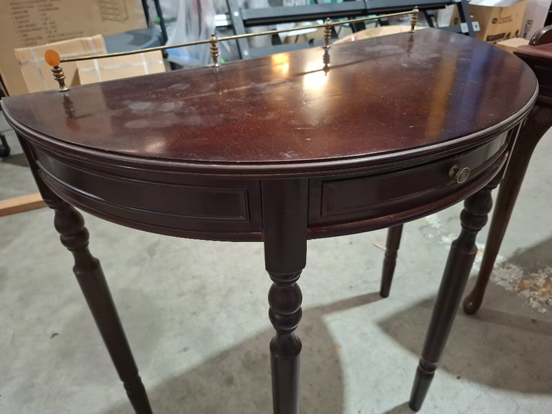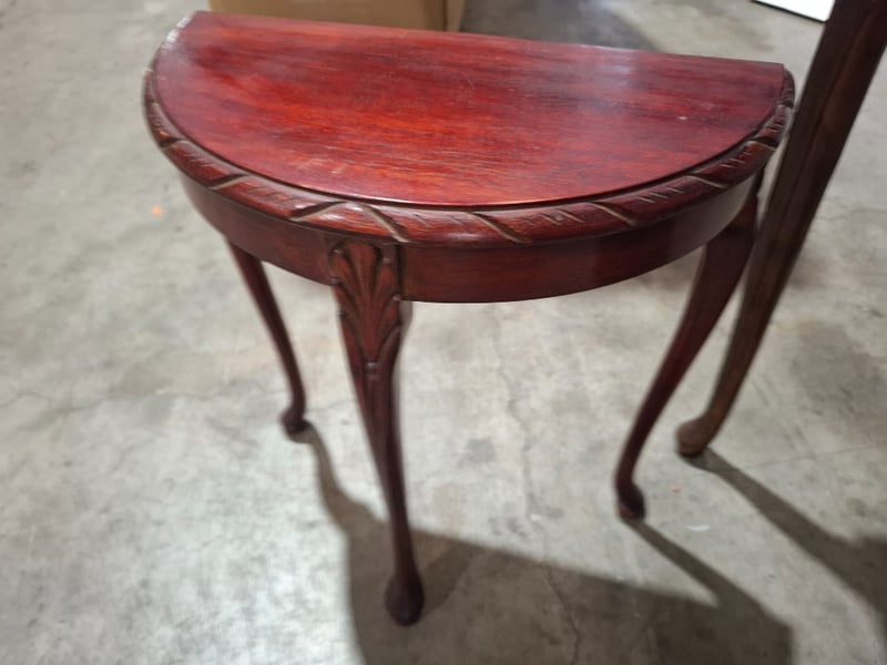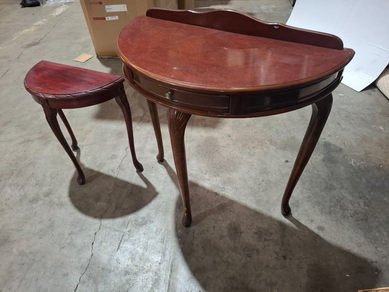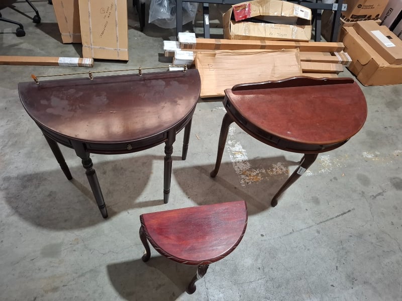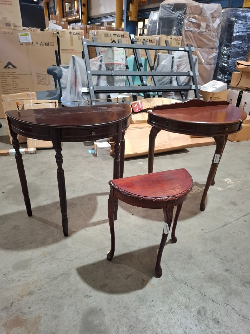 3 x semi circle timber cherry finish tables Dimensions:45-75 cmW x 23-38cmD x 51-73 cmH Note: minor scuffs