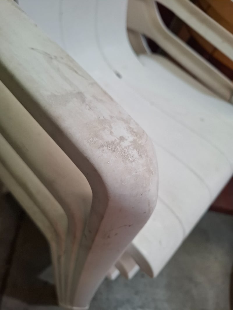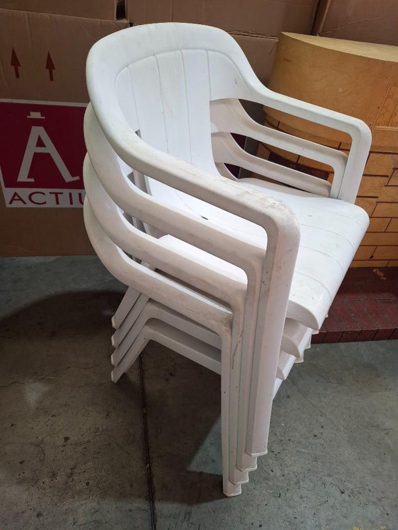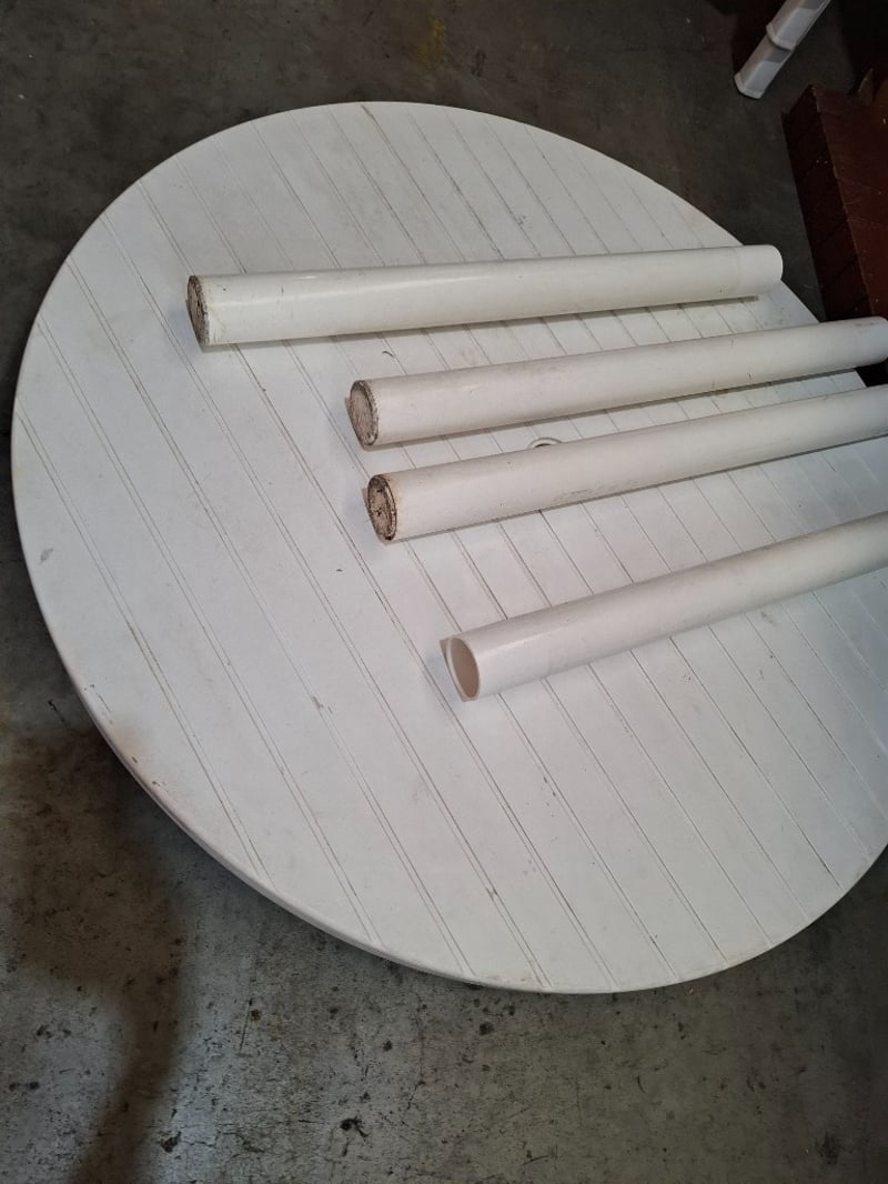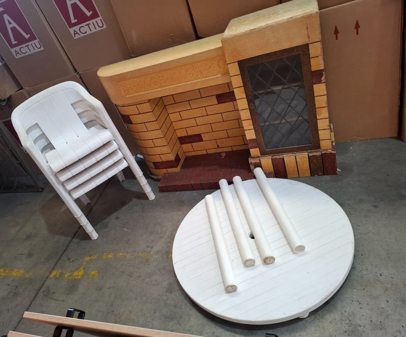 Decorative house prop, round plastic table and 4 white plastic chairs