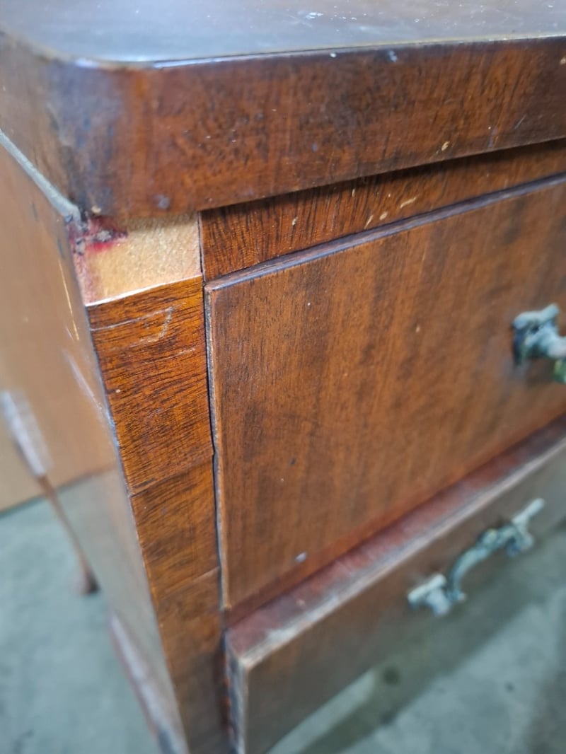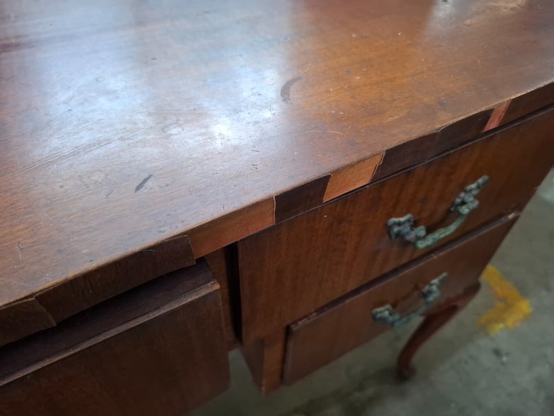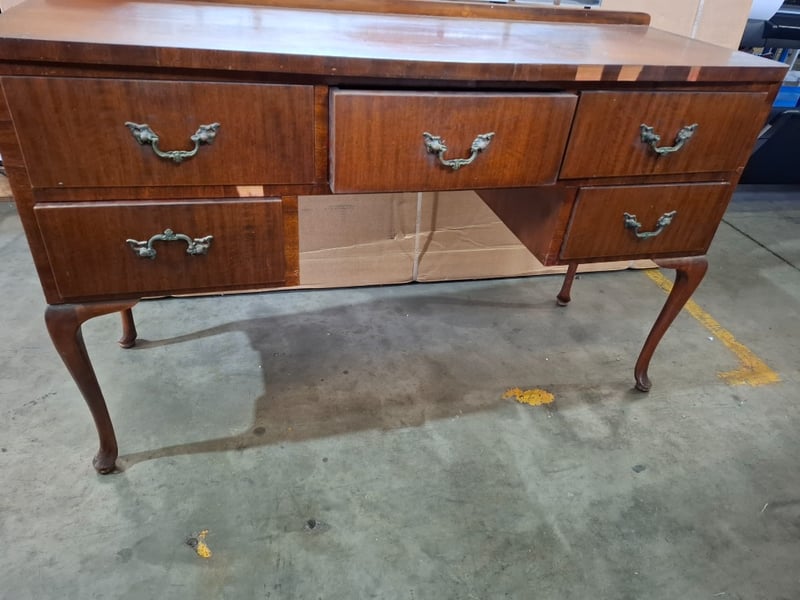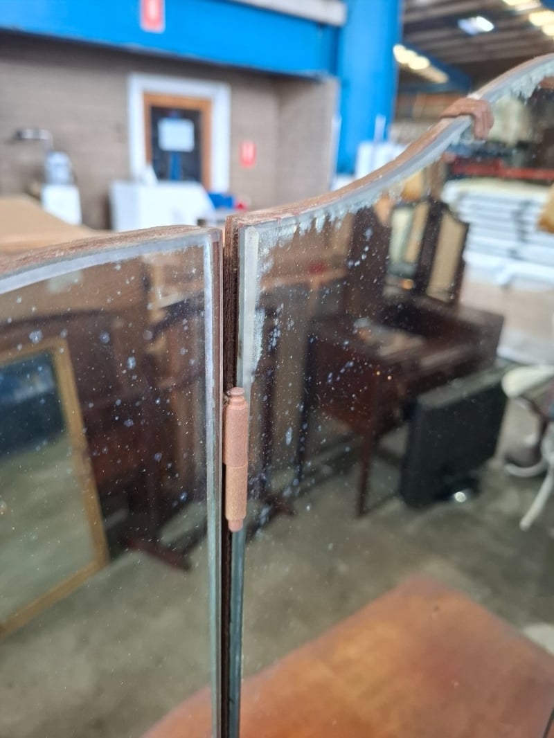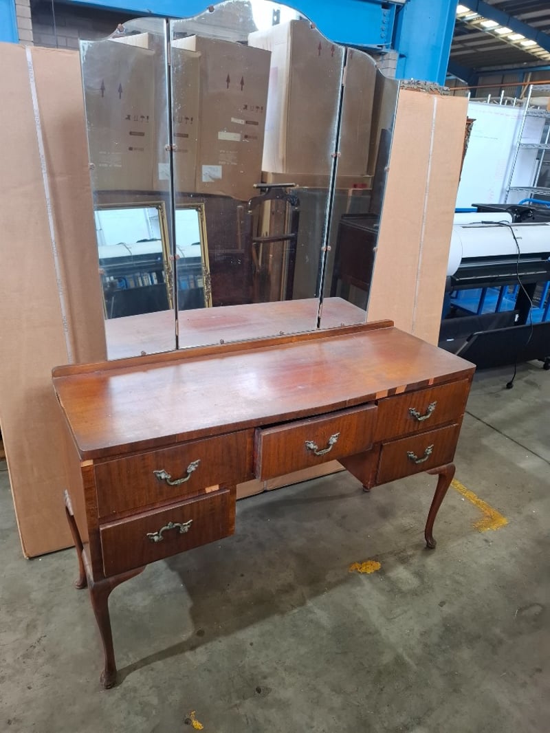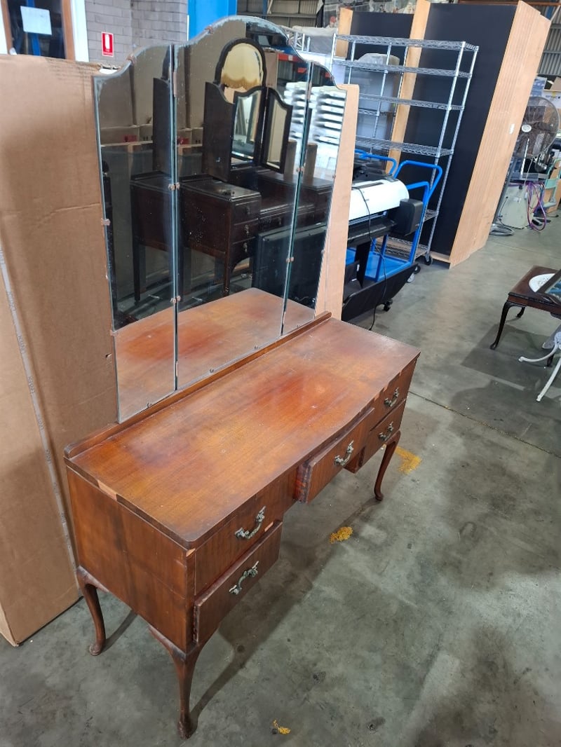 Old natural timber Vanity, 3 mirrors, 5 drawers Dimensions: 122cmW x 42cmD x 170cmH Note: Scuffs and marks, Inspection recommend