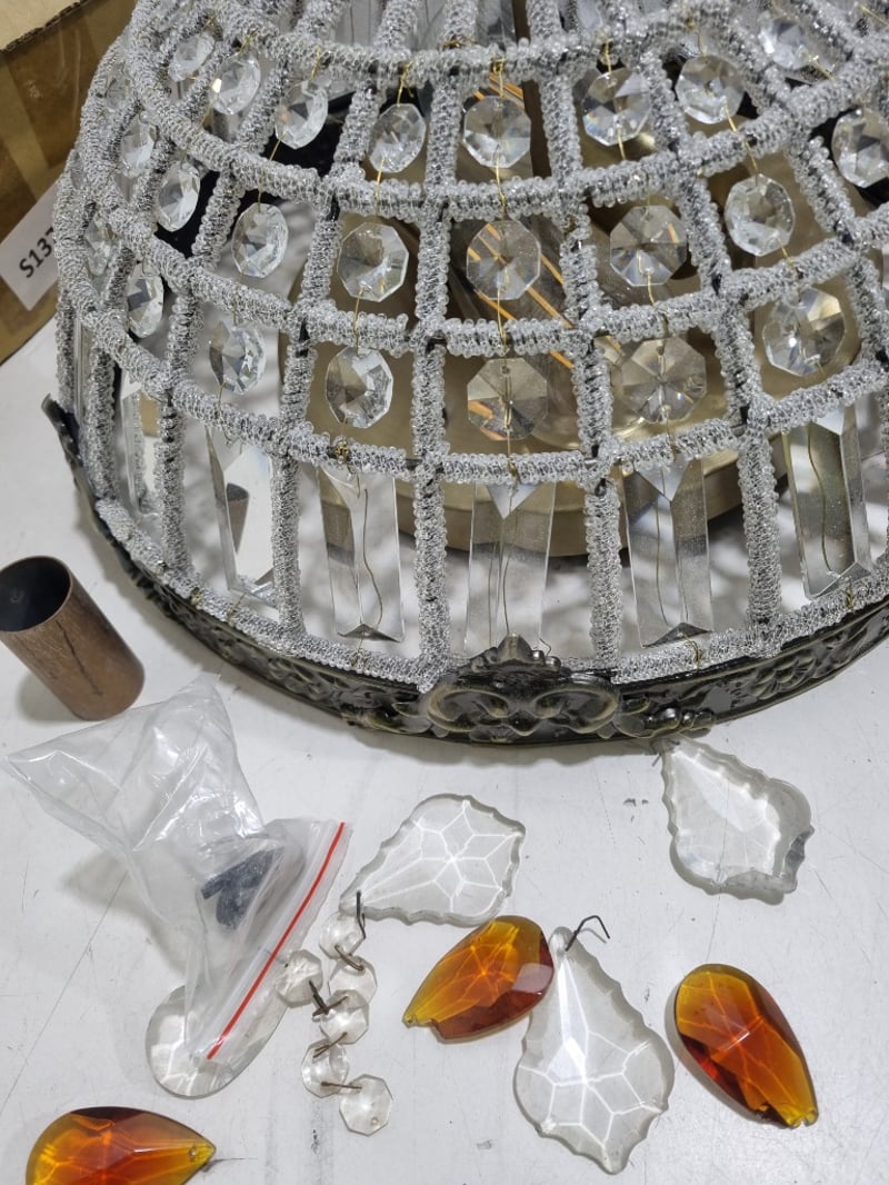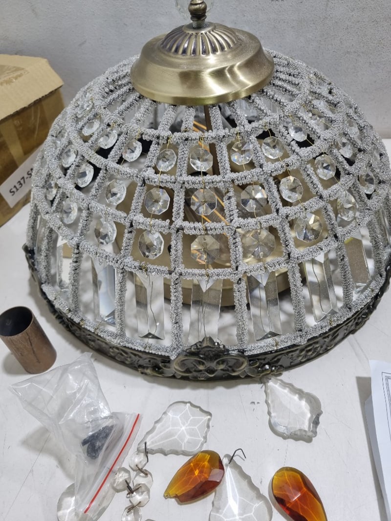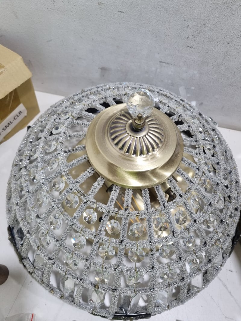 Ornate ceiling pendant light fixture featuring a spherical crystal-embellished shade with geometric lattice framework and beaded detailing.