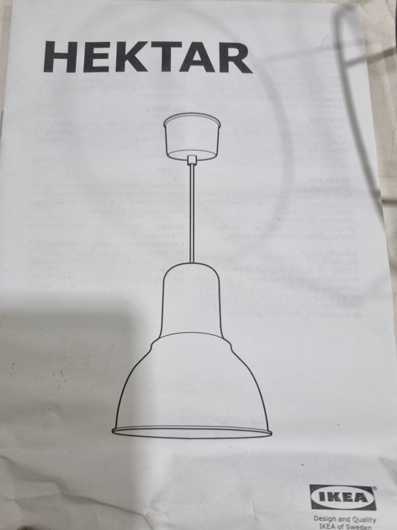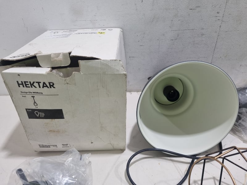 IKEA HEKTAR pendant light fixture, design by Ola Wihlborg, Celadon dome shade with integrated socket assembly, brass-finished decorative lamp base with crystal detail, metal cage guard, wooden mounting bracket, wiring harness, and original packaging. Includes technical documentation and assembly. Complete with all original components and hardware.