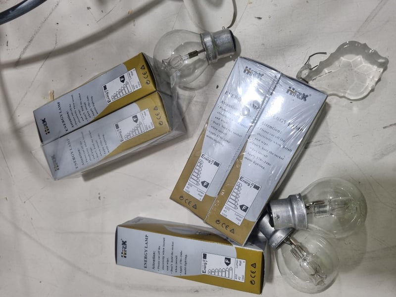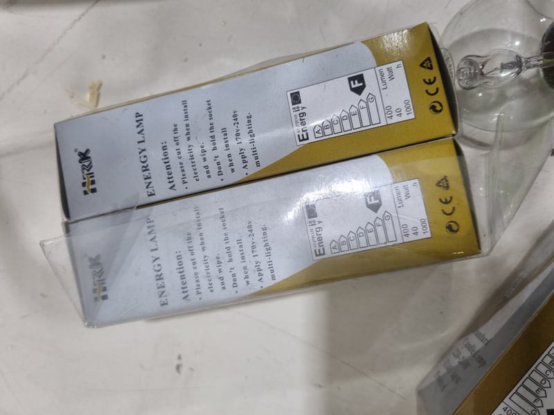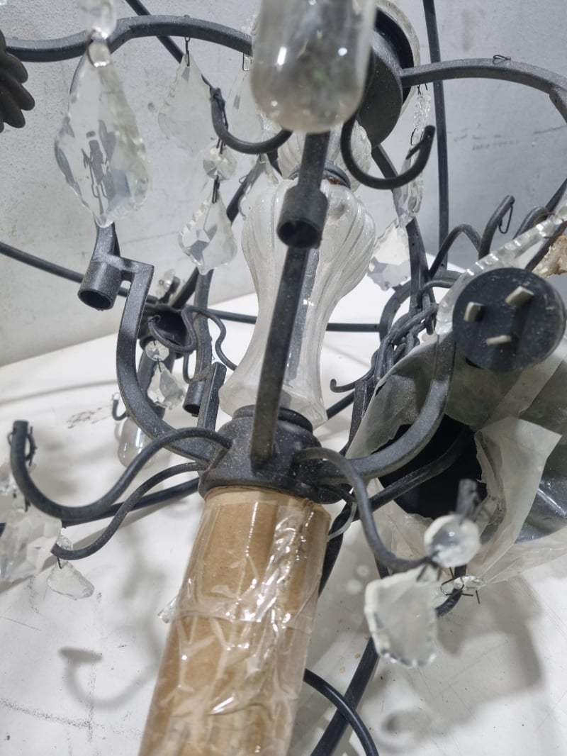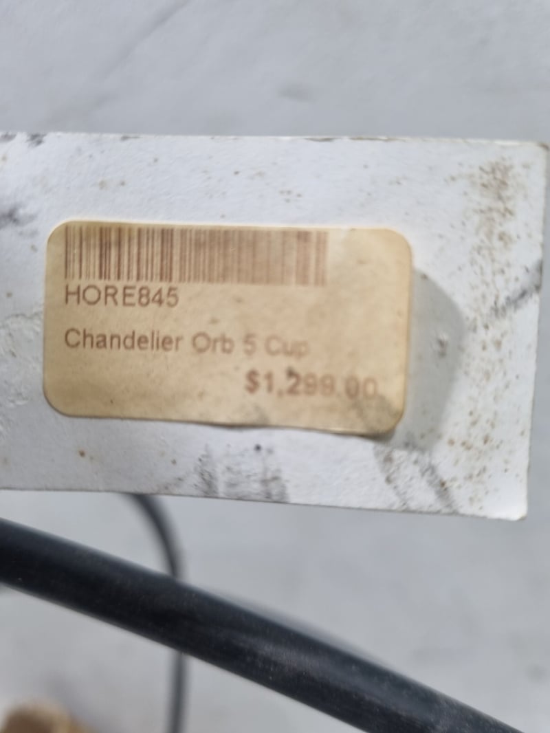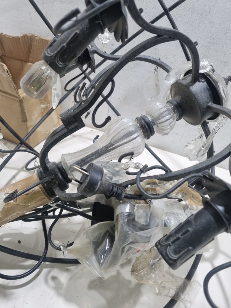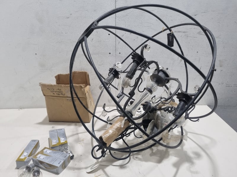 Chandelier, The fixture includes multiple FIRK brand energy-saving lamp modules (yellow and white packaging visible) rated for standard European sockets. The black metal frame forms an intricate geometric cage-like design "Chandelier Orb 5 Cup" (model HORE845). Originally priced at $1,299.00. Note: untested,signs of wear
