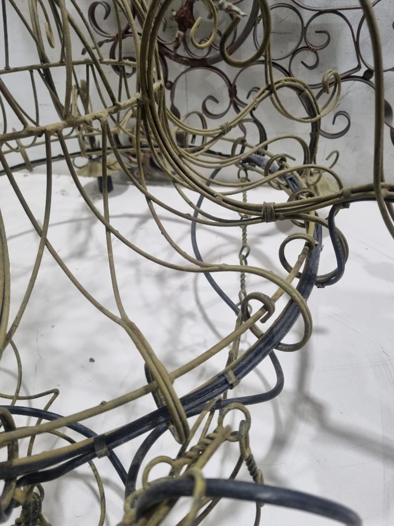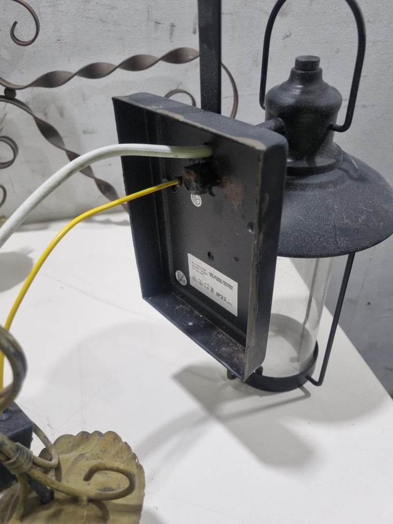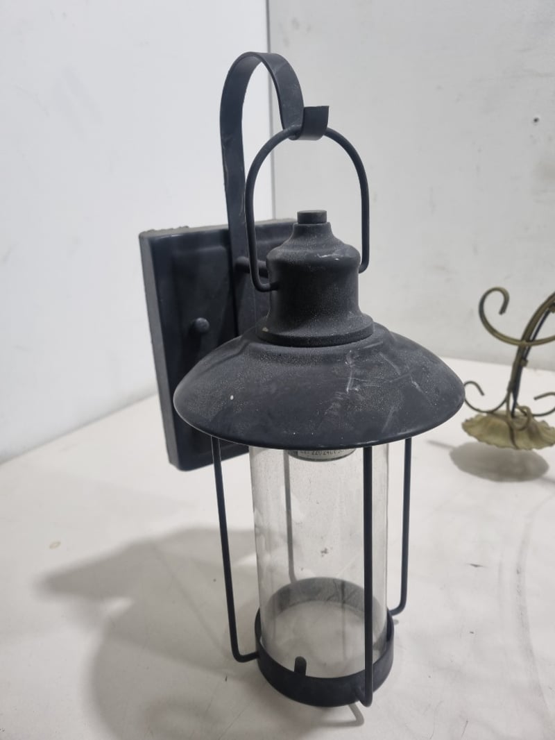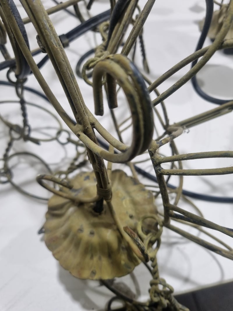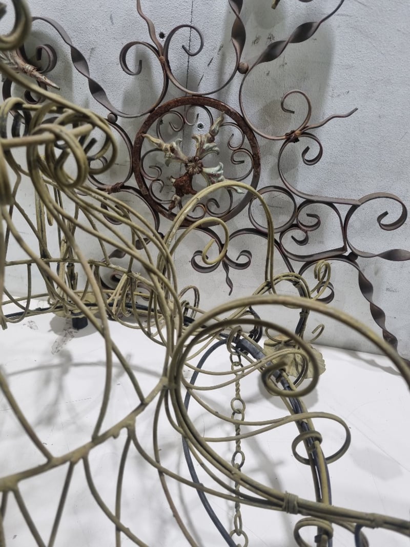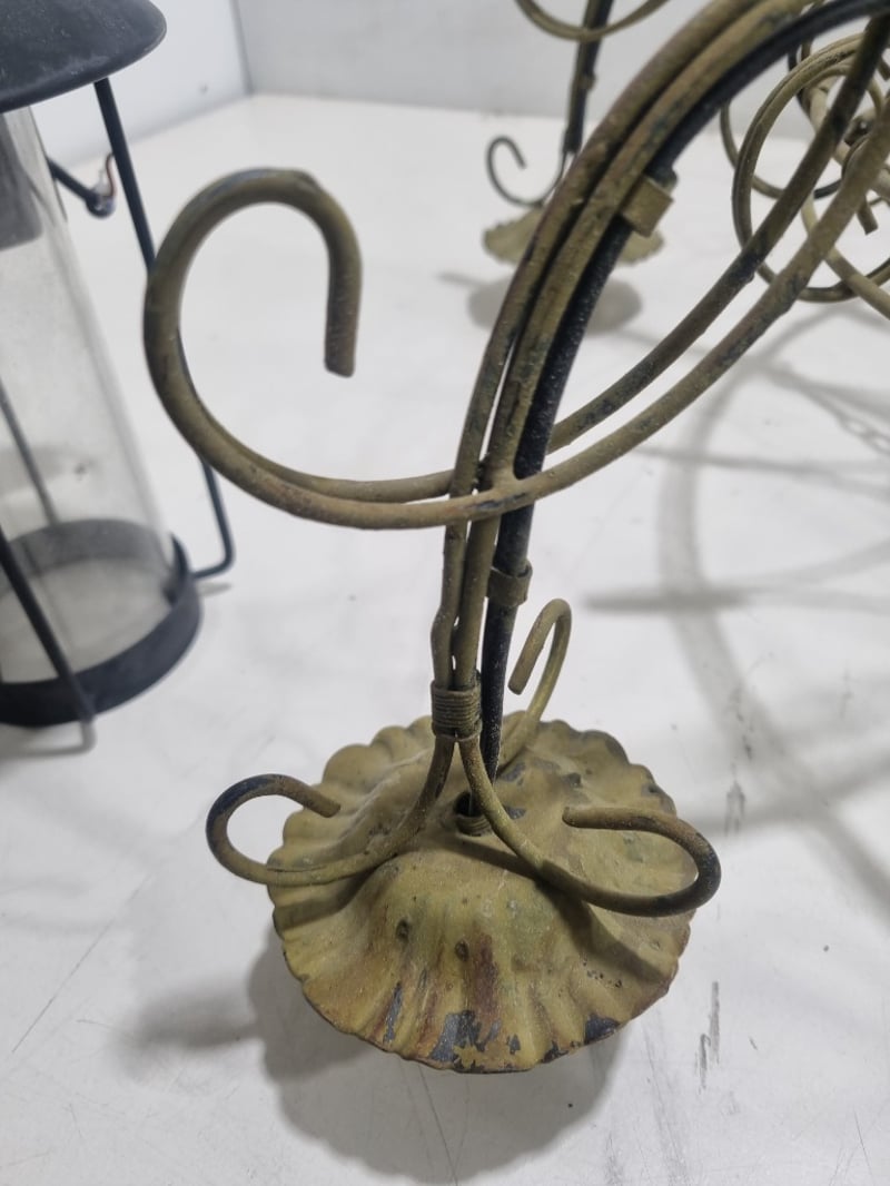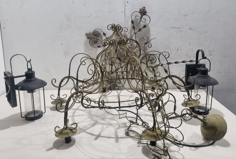 Ornate wrought iron chandelier featuring an elaborate scrollwork design with multiple decorative brass-finished arms extending from a central dome structure. The fixture comprises approximately 6-8 curved candelabra-style arms with delicate spiral embellishments and leaf-motif candle cups in aged brass patina. Each arm terminates in a cylindrical glass-enclosed lantern with black metal hood and carrying handle. The central dome showcases intricate ironwork with scrolled flourishes and decorative finials. Includes matching wall-mounted single-lantern sconce with black powder-coated finish. Note: untested, signs of wear