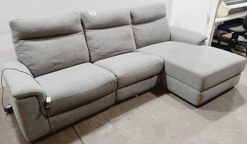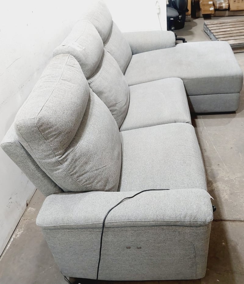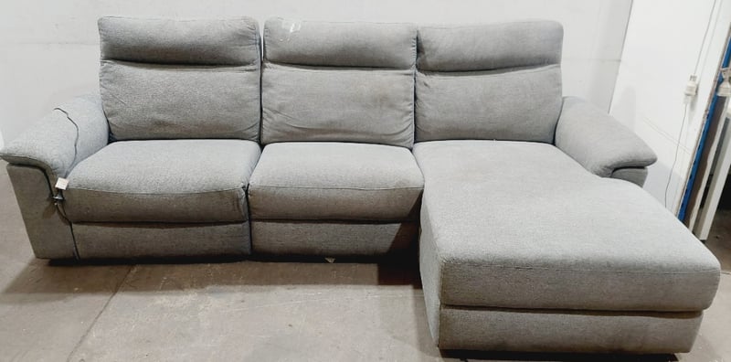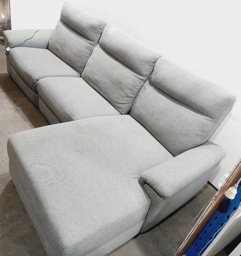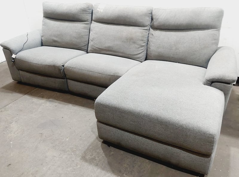Three-seater recliner sofa with a chaise, upholstered in a light grey fabric.