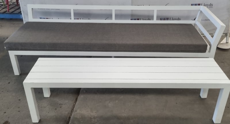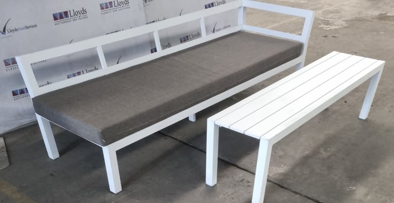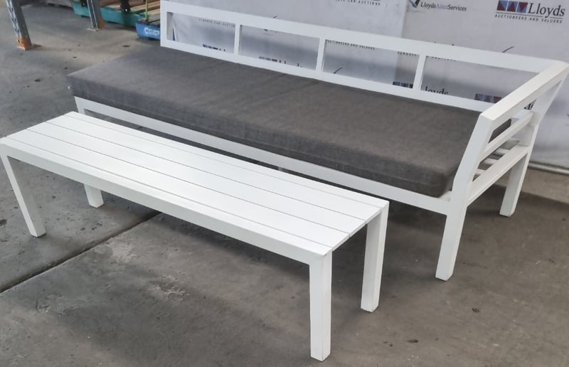 Outdoor Furniture, includes 3 seater,upholstered grey seater,outdoor benchSold as lot Note: signs of wear, no back cushions included