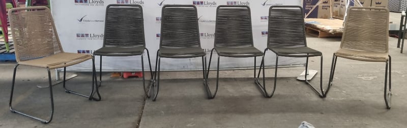 Contemporary styled chairs, assorted colours, woven rope for wicker effect