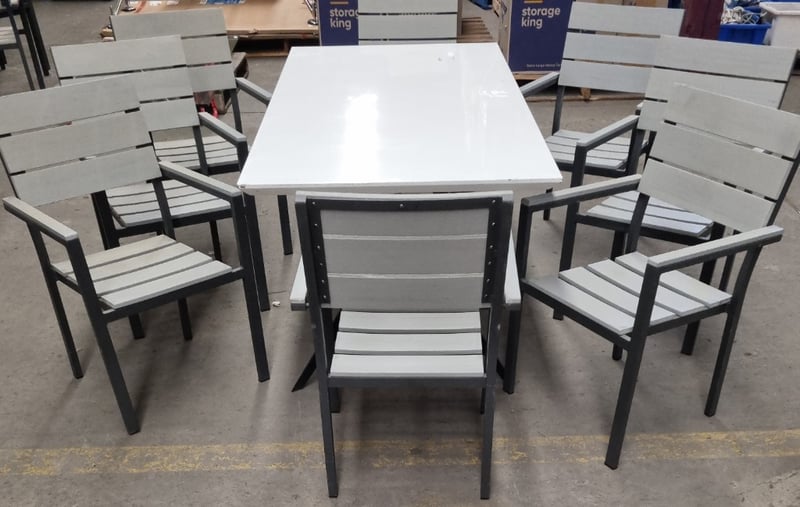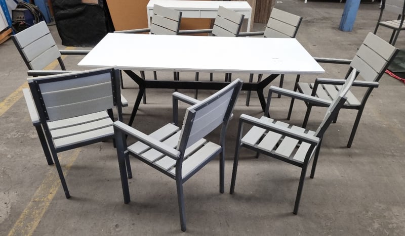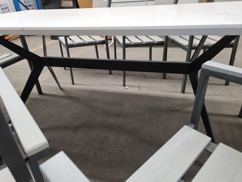 Modern outdoor dining suite featuring a white composite-top rectangular table with black aluminum X-frame base, chairs feature black aluminum frame construction, horizontal slat seating and backrest. Sold as lot Note: signs of wear