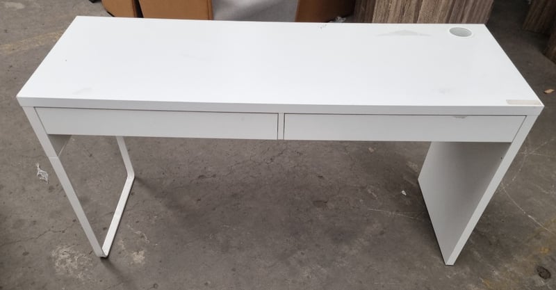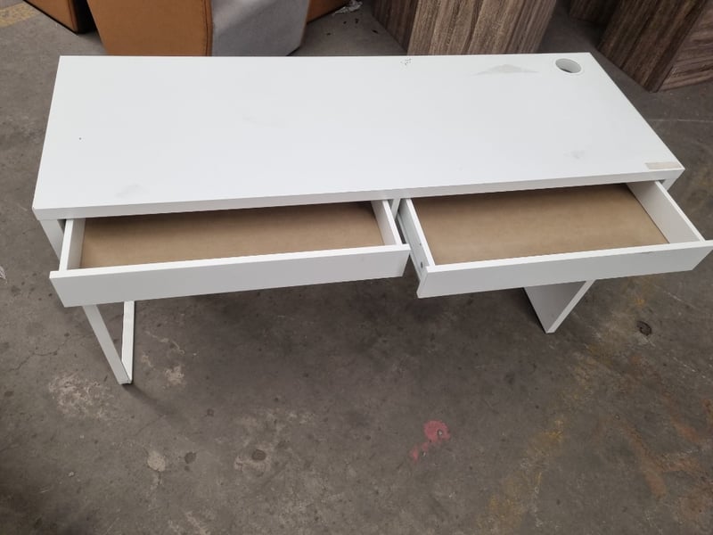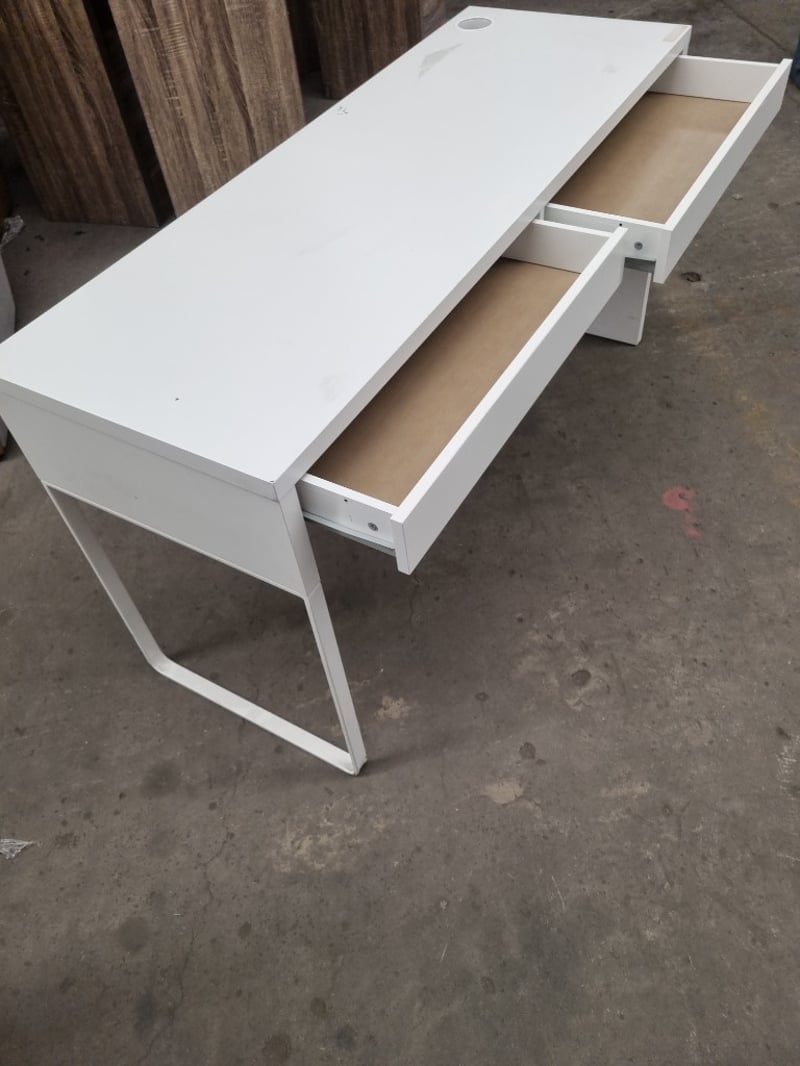 White laminate desk featuring a clean, minimalist design with two shallow drawers.