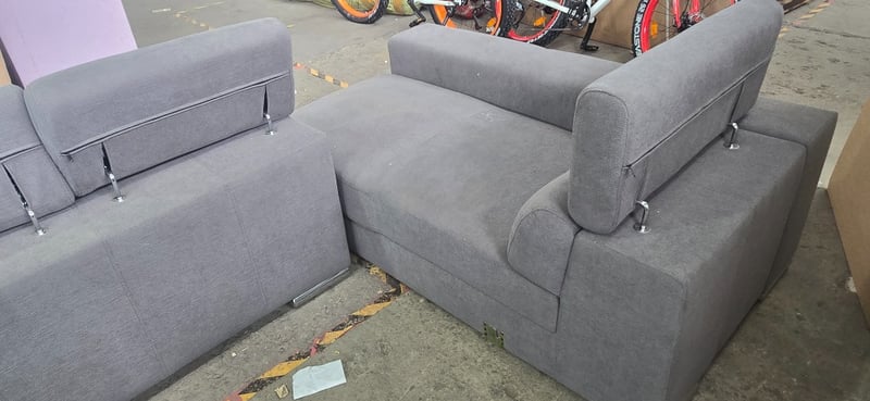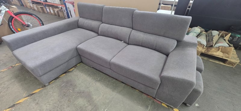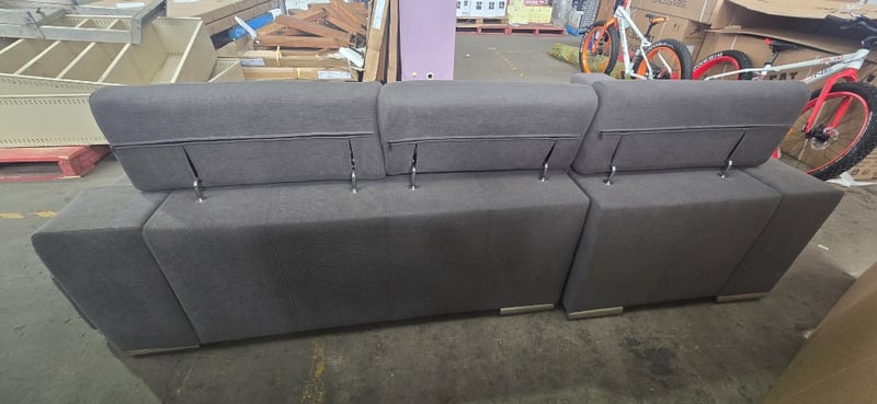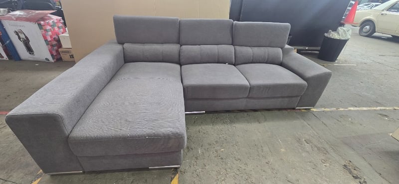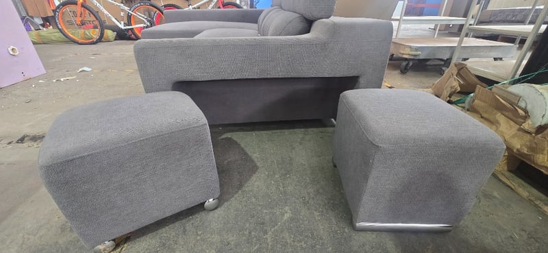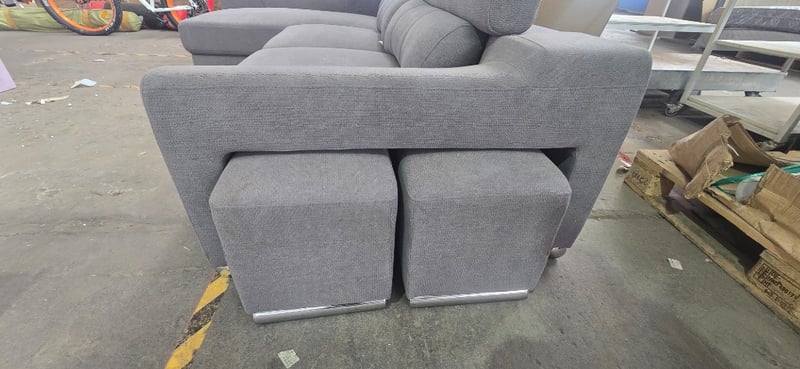 Lounge, 3 seater gray fabric Lounge with chase and two foot stalls that slide into side of couch