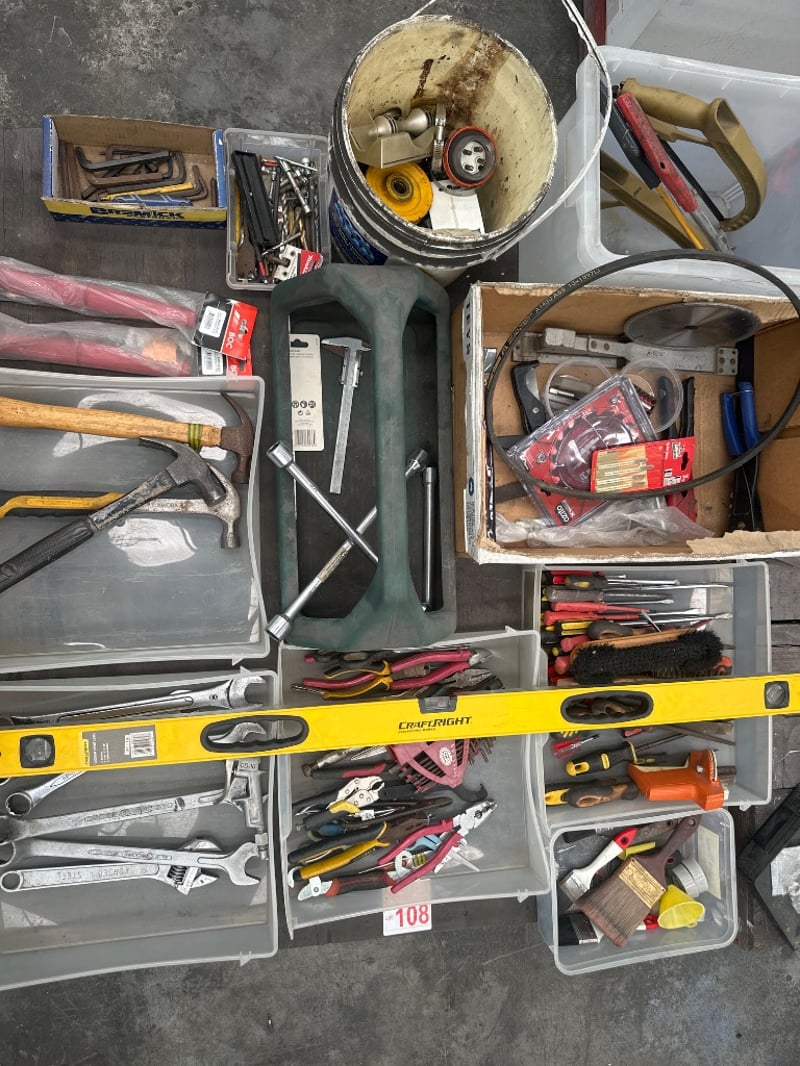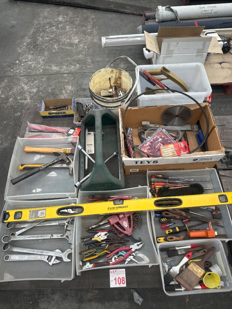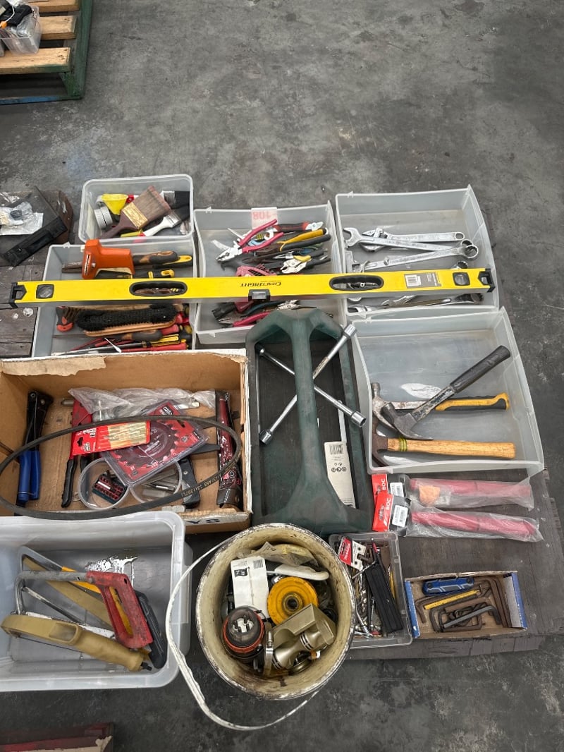 Pallet Of Various Items And Tools, Including Hammers, Screwdrivers And More