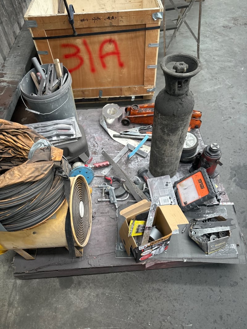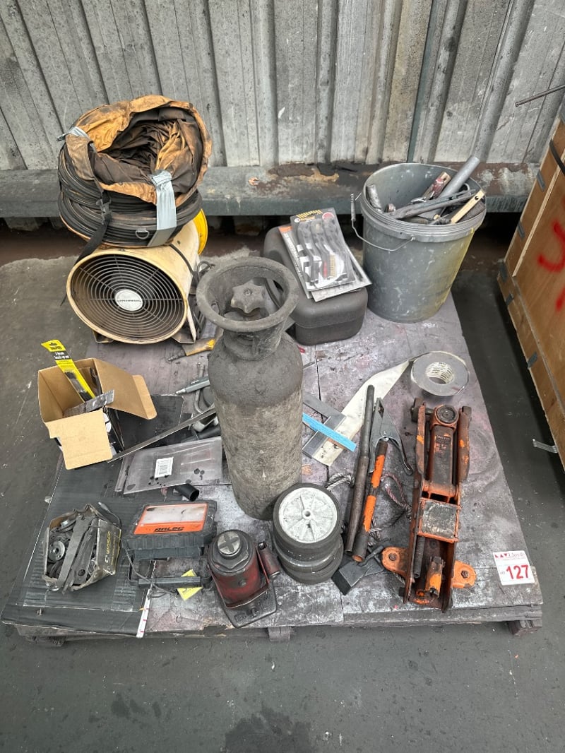Pallet Of Mixed Items Including Industrial Fan,Jacks And More SOLD AS LOT