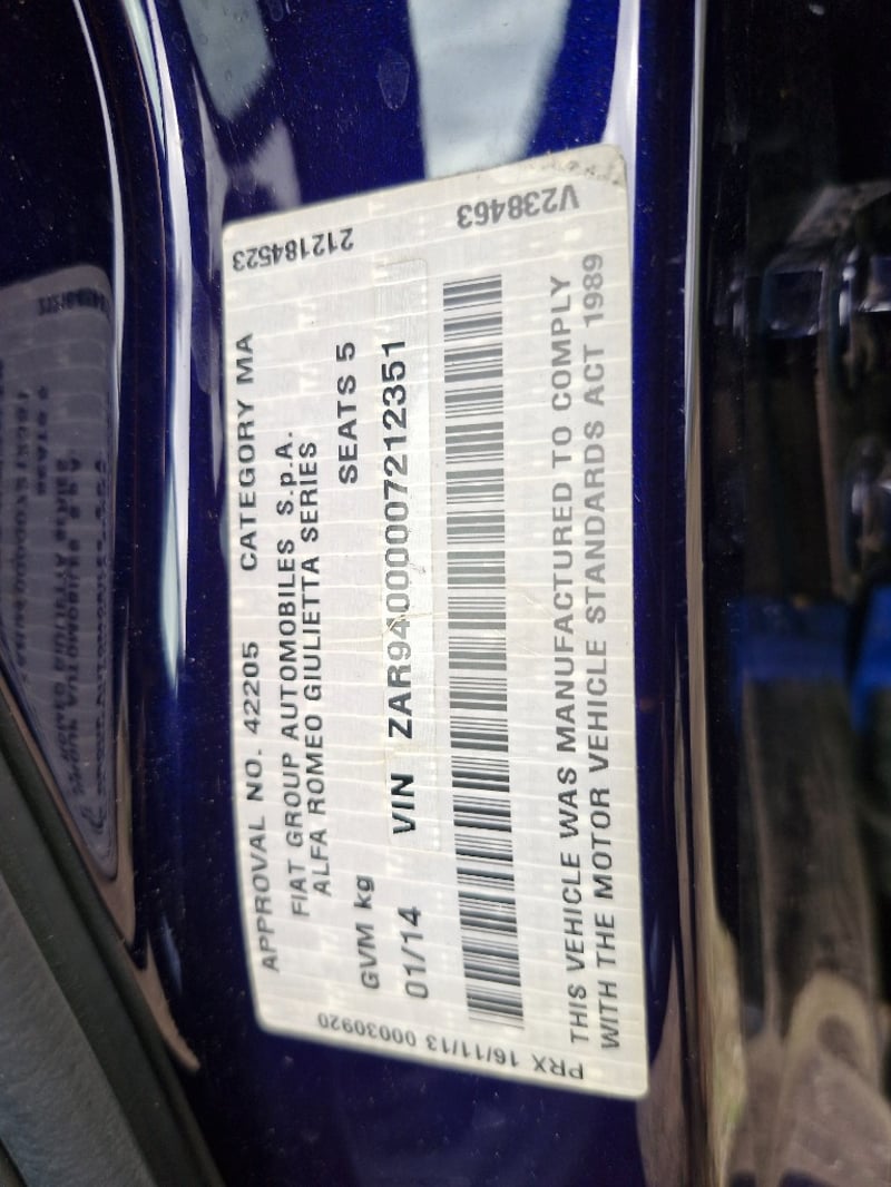 2013 Alfa Romeo Giulietta Year: 2013 Make: Alpha Romeo Model: Giulietta VIN: ZAR94000007212351 Odometer Indicating: 172,169kms Engine type, Inline 4 Cylinder Diesel Books: Yes Note: Marks and Scatches, Srstches to rearrange passengerdoor and wheel arch, interior door handle missing passenger door.