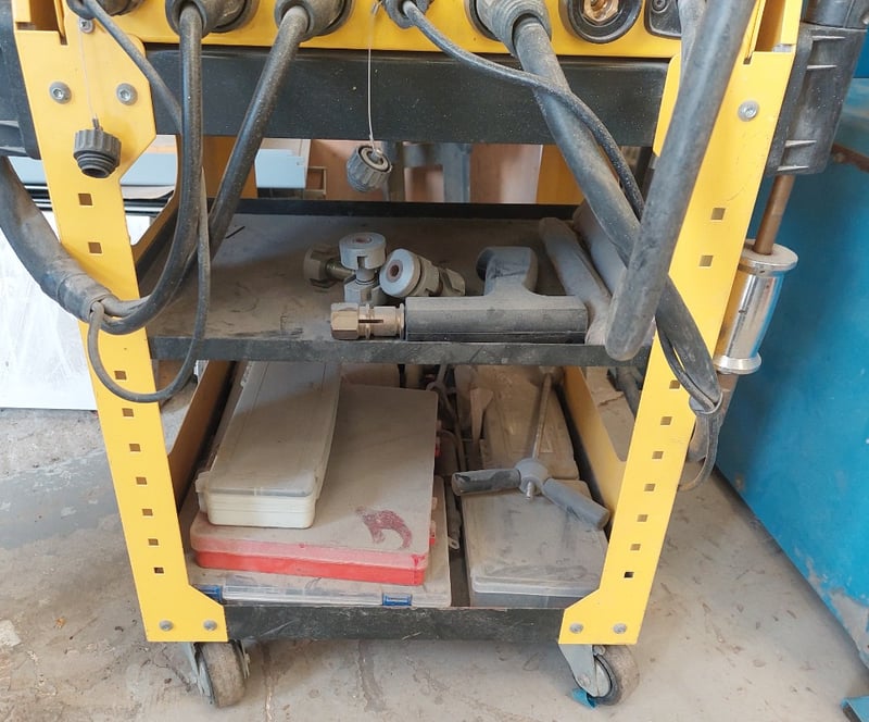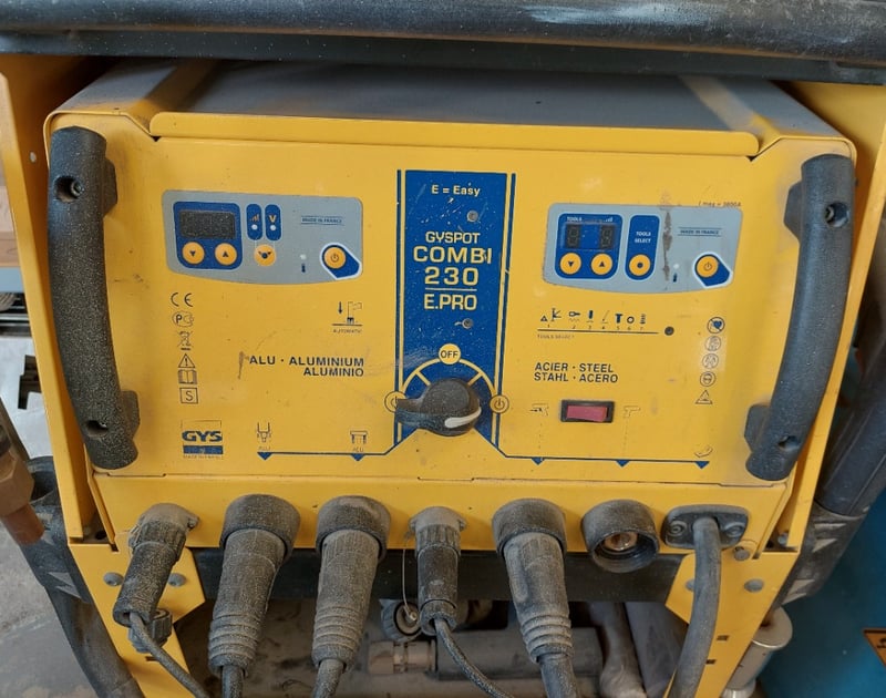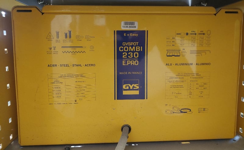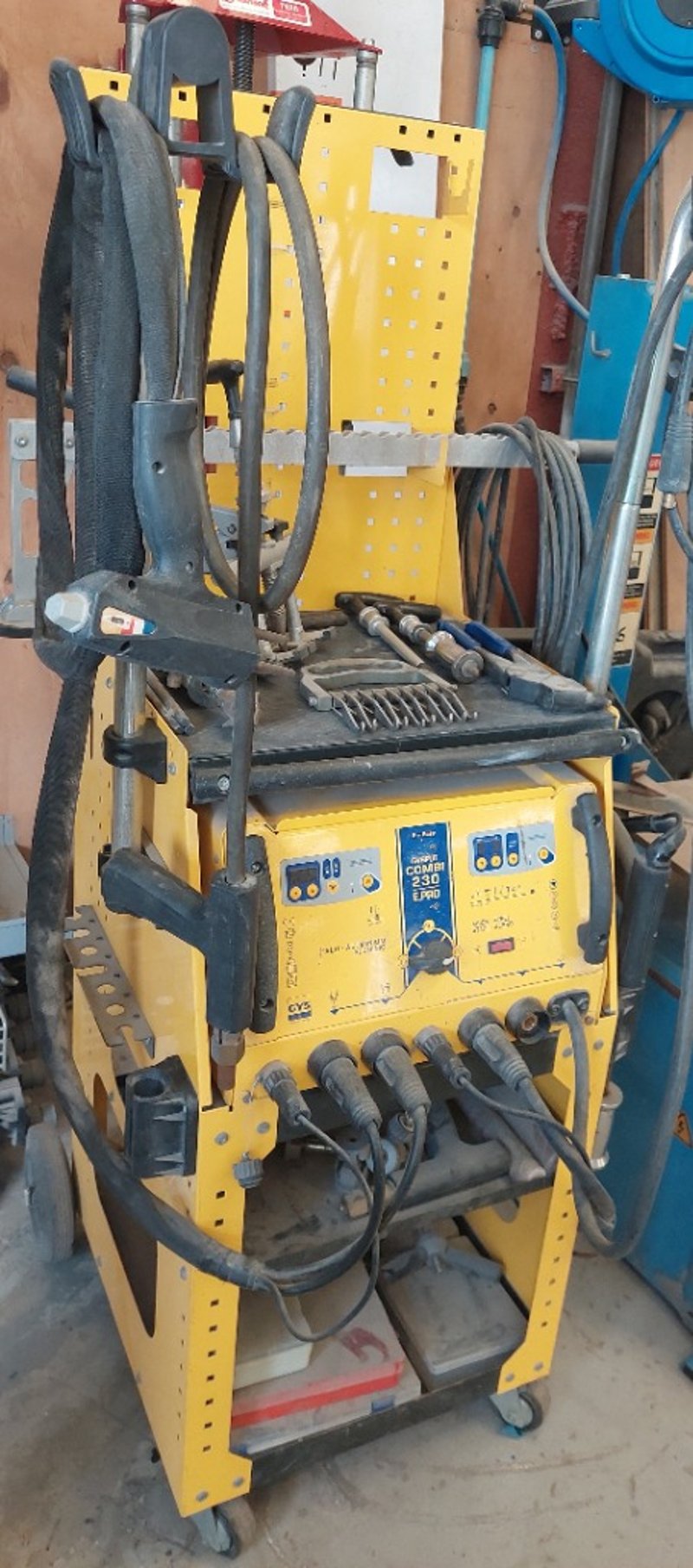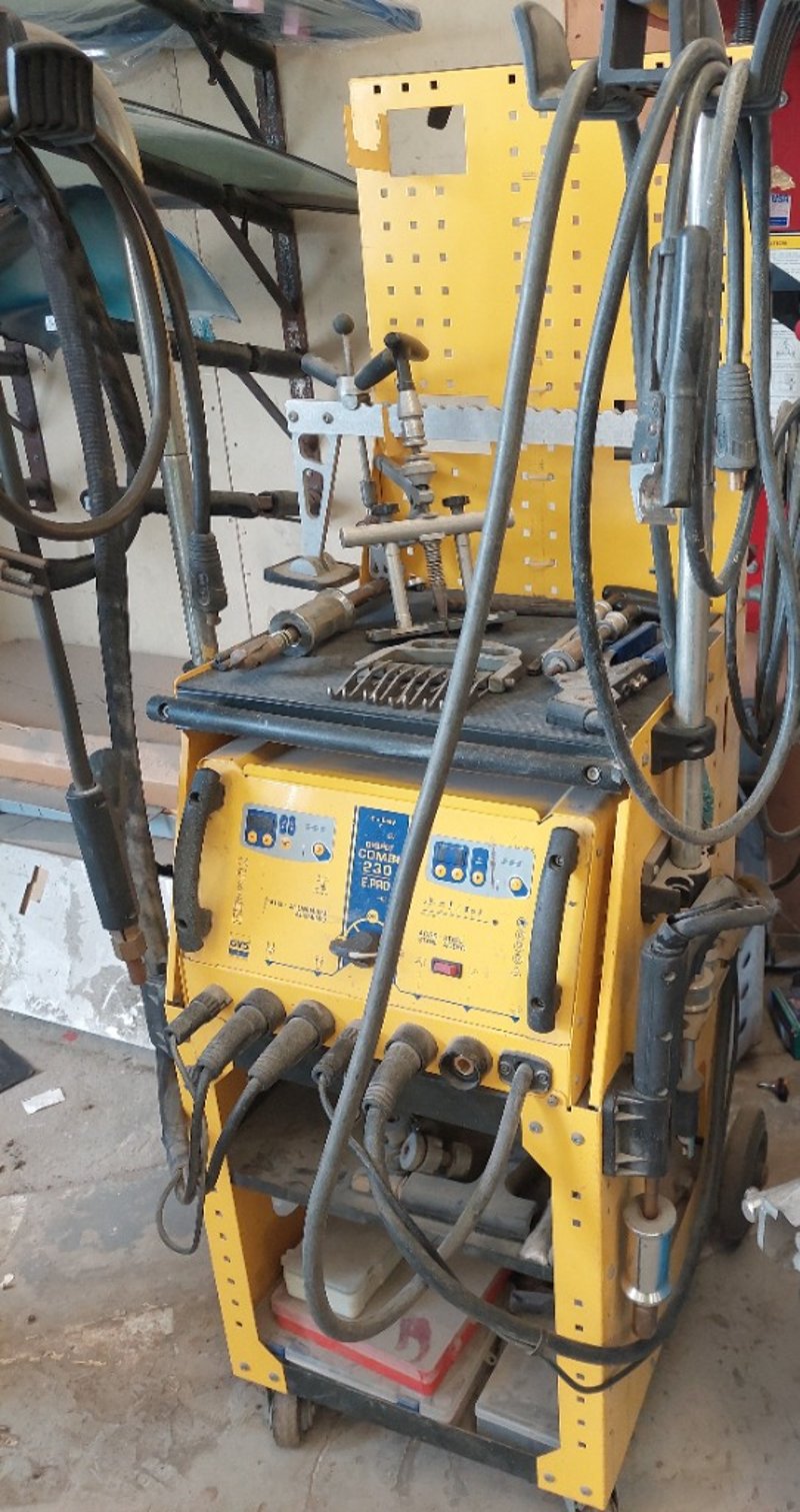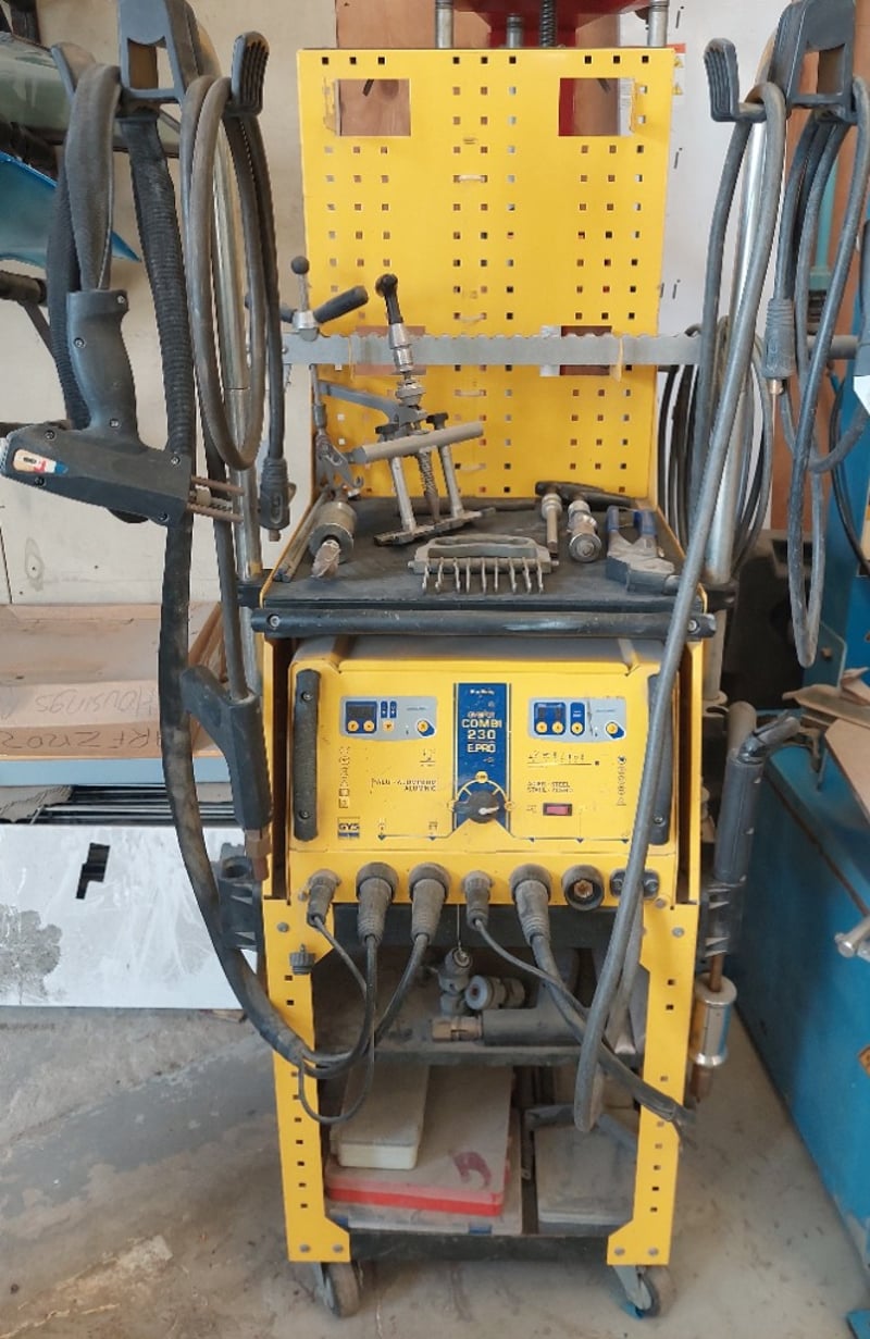 Steel & Aluminium Dent Puller - GYS Gyspot Combi 230 E.PRO, dual LED digital controls, 3.8kVA, mobile cabinet, DOM: 2013, S/N: 13.05.000459 comes with 2x multi-function guns and cables, inertia hammer, torch with brass 3-pin coupling and cable, spotter accessories boxes, slide hammer, 9-tooth claw, 6-tooth claw, Manuspot dent pulling kit and leveling lever