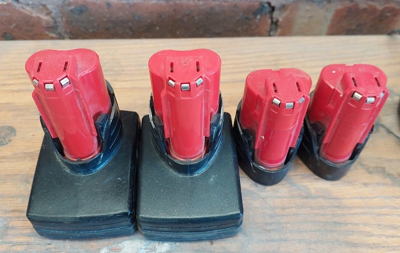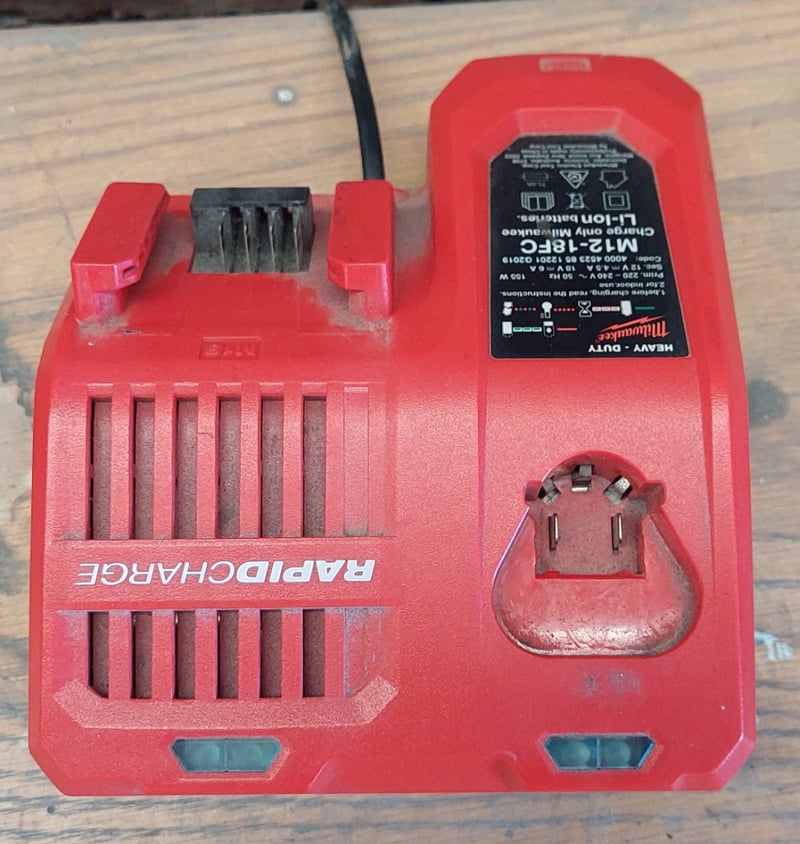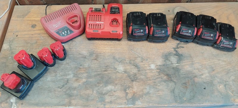 Assorted Milwaukee power tool equipment, including Milwaukee M18 REDLITHIUM-ION power tool batteriesMilwaukee M12-18FC Rapid Charger designed for both M12 and M18 Lithium-Ion batteries. Milwaukee C12C 12V Lithium-Ion Battery ChargerMilwaukee M12 REDLITHIUM lithium-ion battery packsSold as a lot.Note: items are untested, signs of wear.
