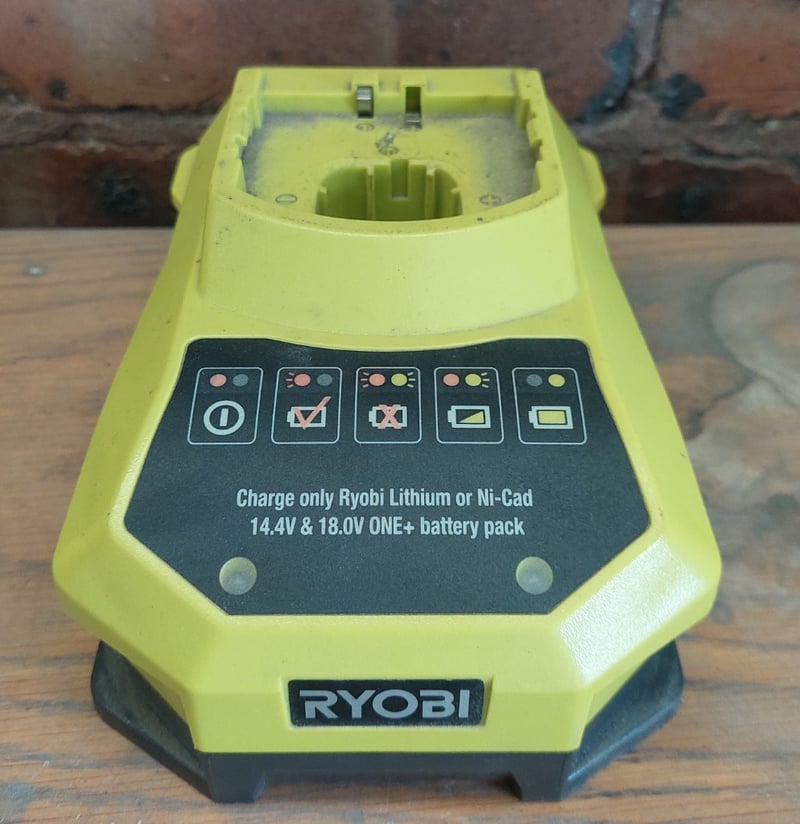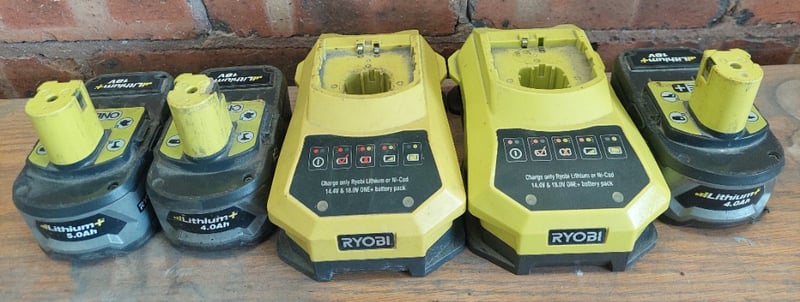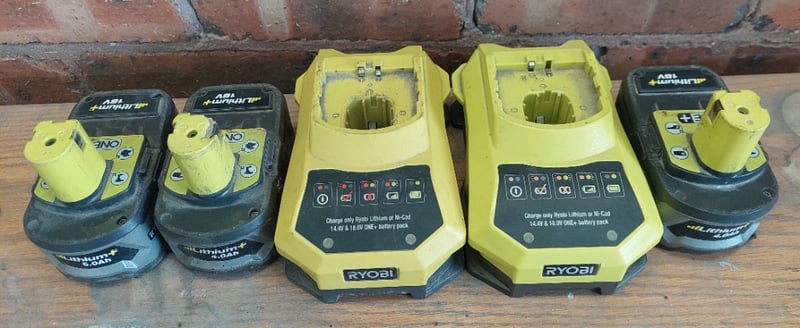 Assorted Ryobi BCL14181H 18V ONE+ Chargers and compatible Lithium+ battery packs.