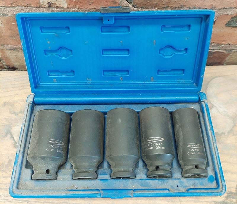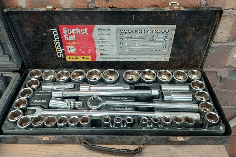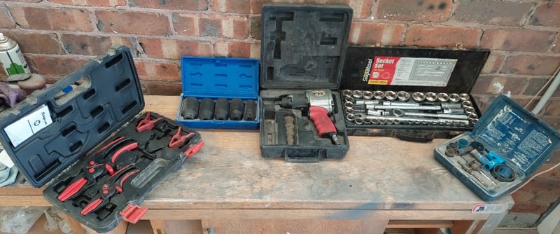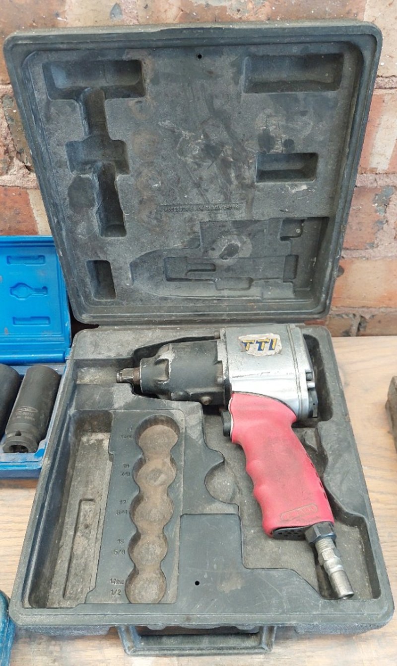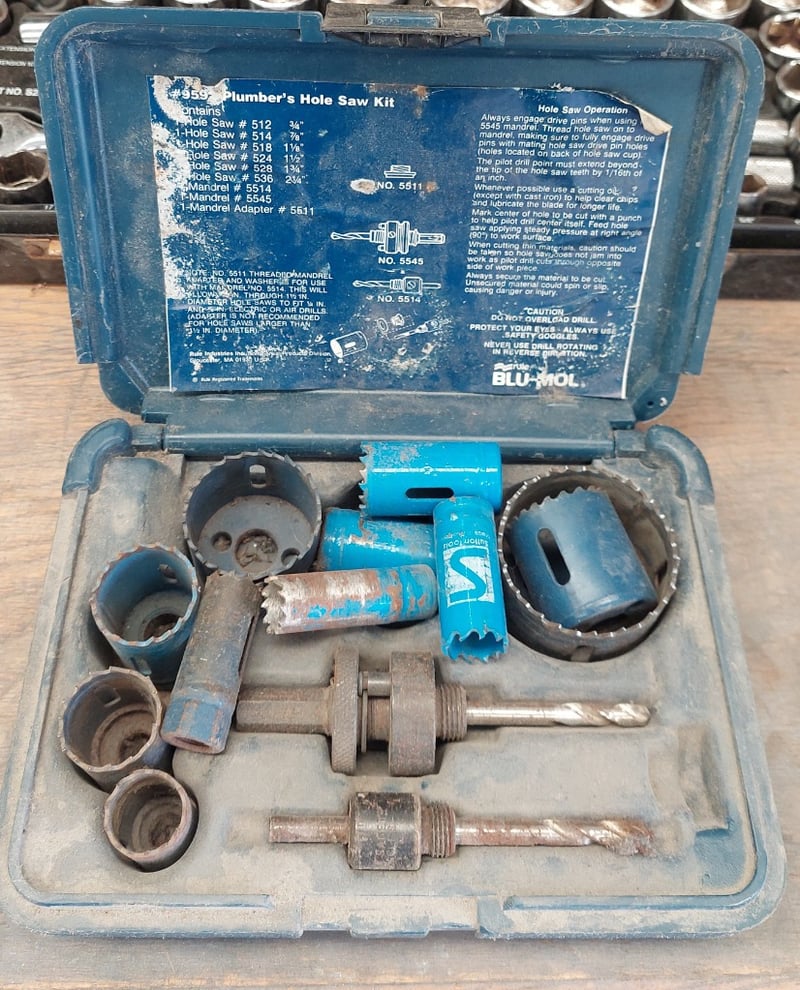 Assorted tools, includingBlu-Mol No. 82 #959 Plumber's Hole Saw KitSupatool 50 Piece 1/2" Drive Socket SetPneumatic air impact wrenchBlue-Point ITC5027A hub nut impact socket setSnap-on LCSS600 6-Piece Line Clamp & Stopper SetSold as a lot.Note: items are untested, signs of wear.