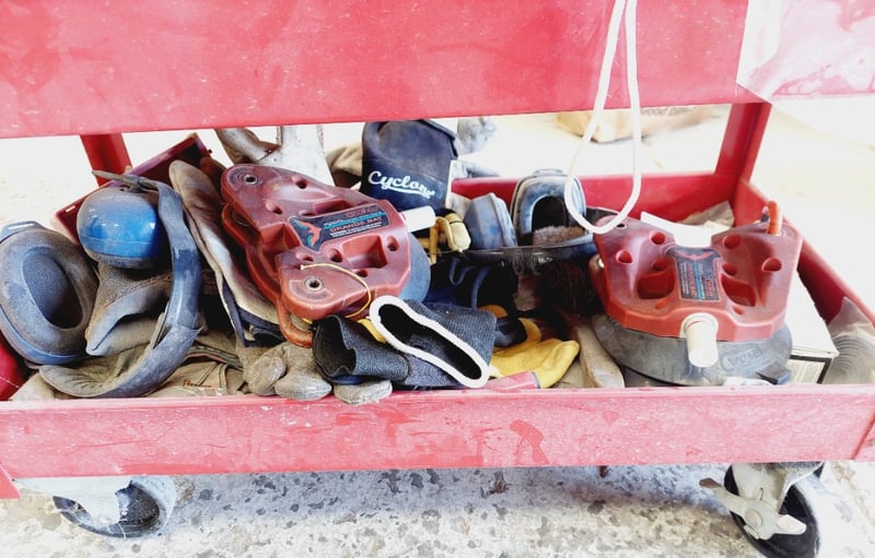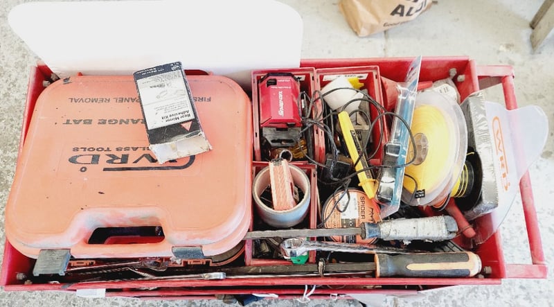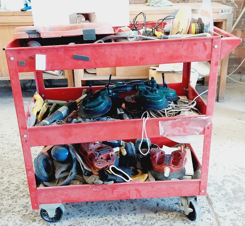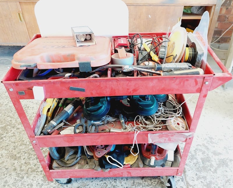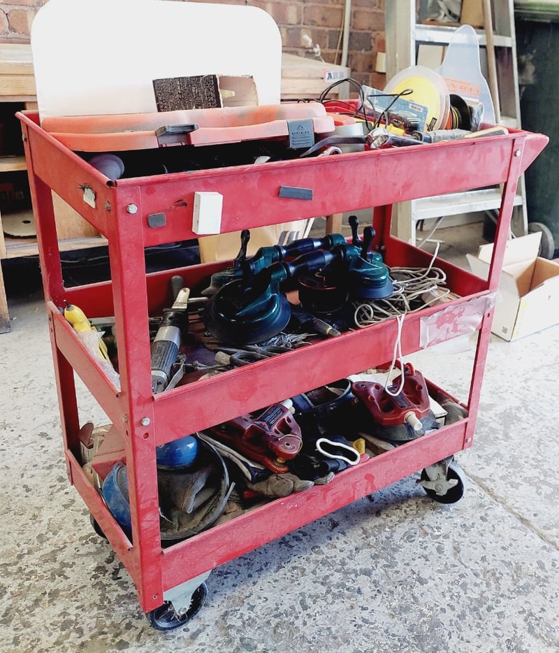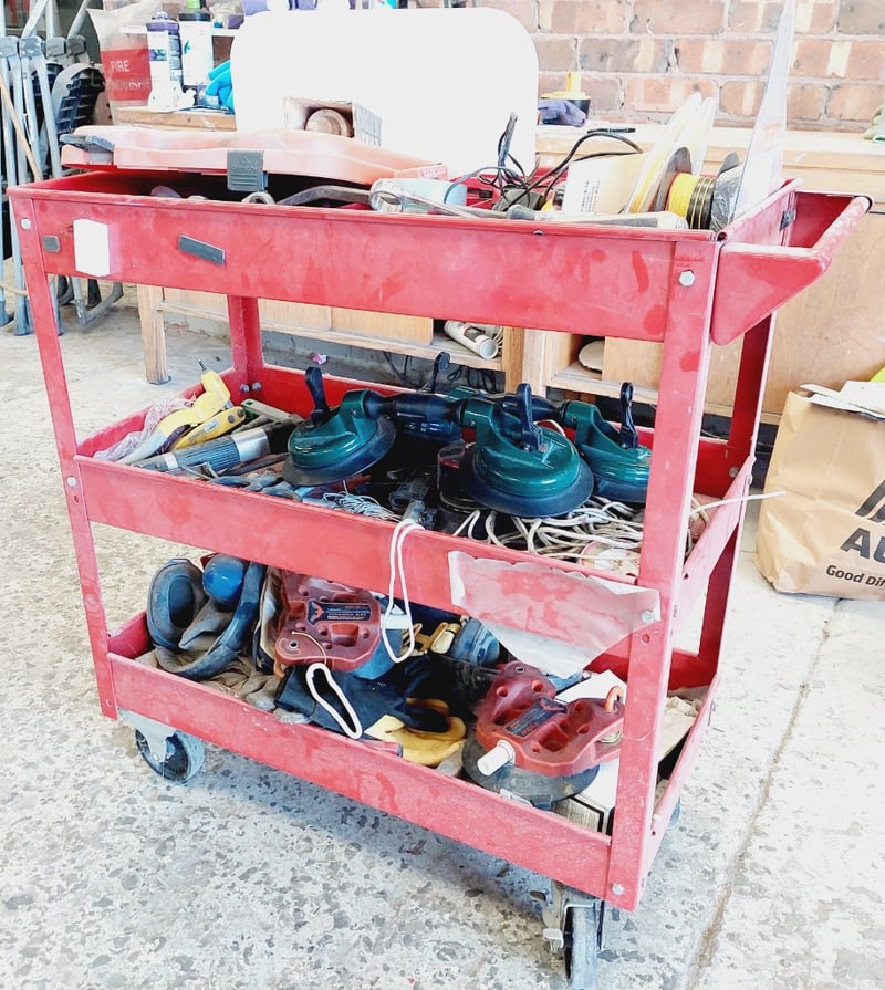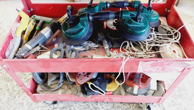 Three-shelf metal utility cart including hand tools, green and black vacuum suction cup lifters, PPE and more...
