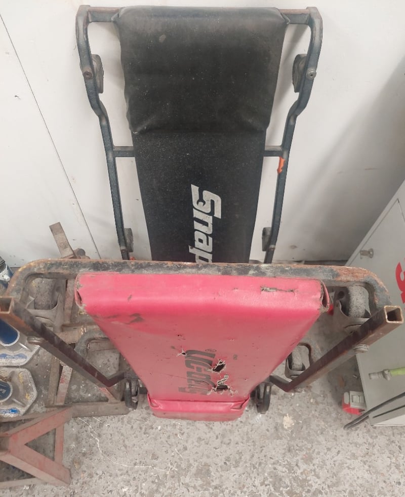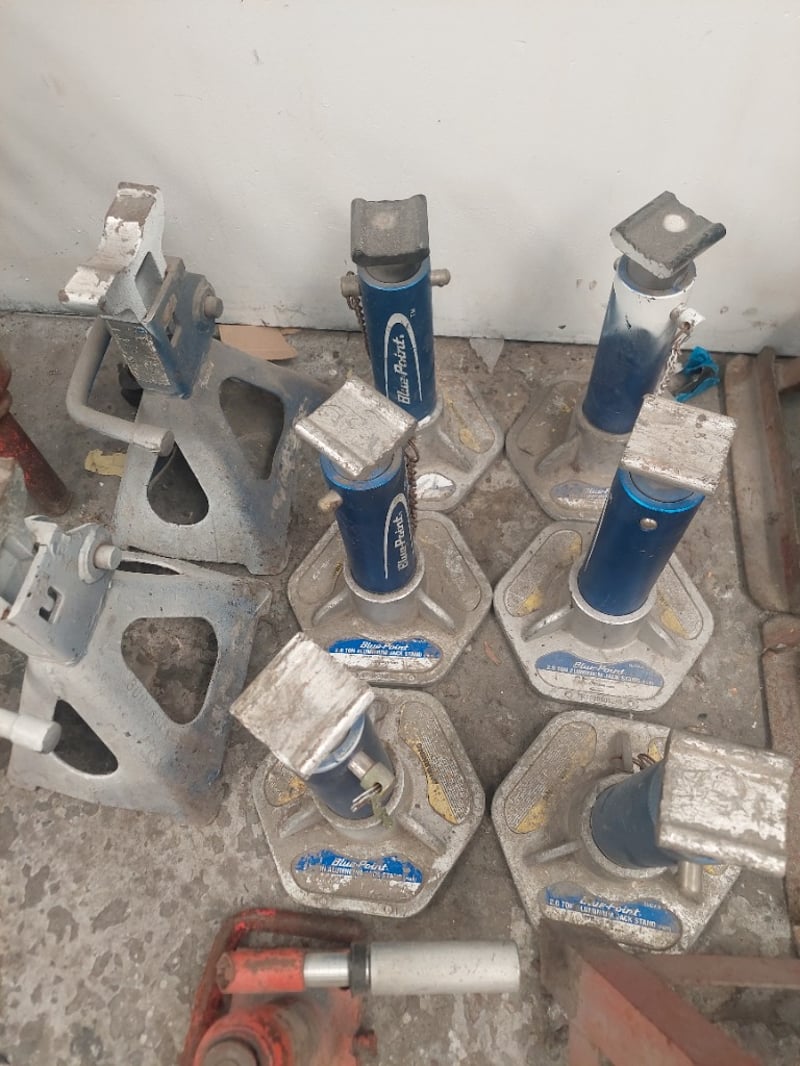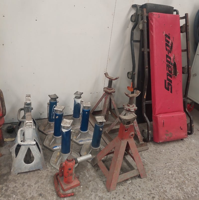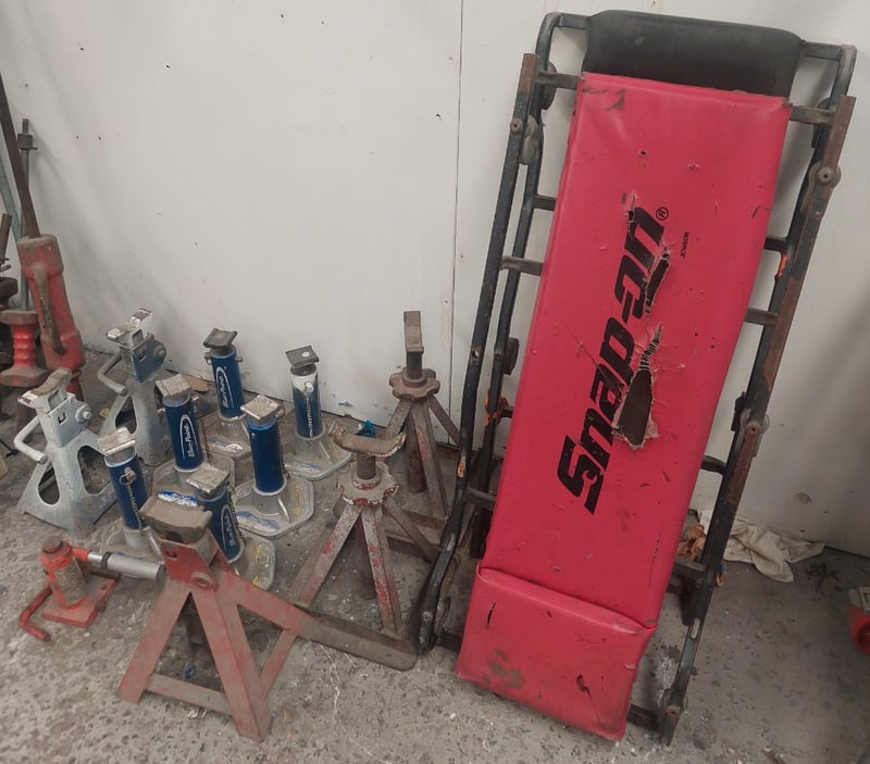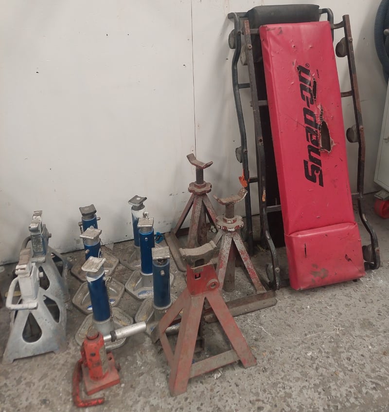 Assorted lot includes, Snap-on mechanic's creepers and various automotive lifting equipment, including heavy-duty hydraulic bottle jacks and jack stands.Sold as lot.Notes: items untested and signs of wear.