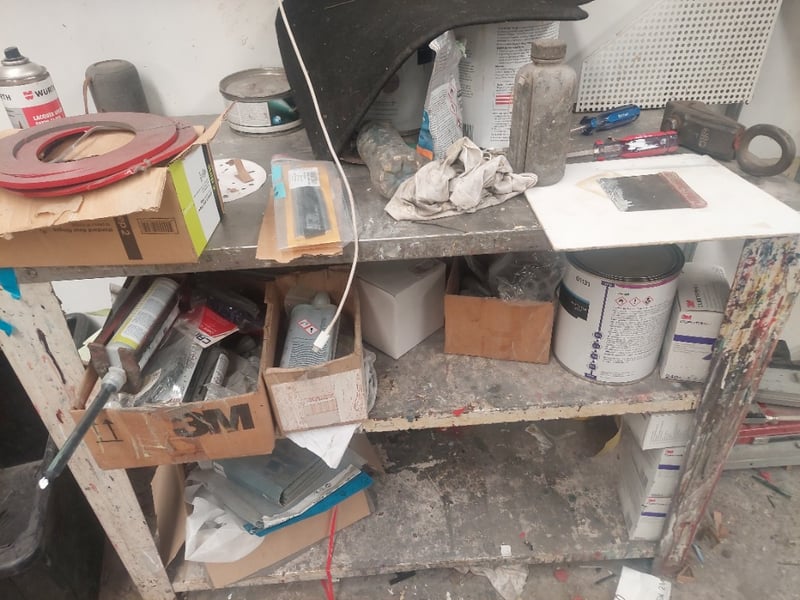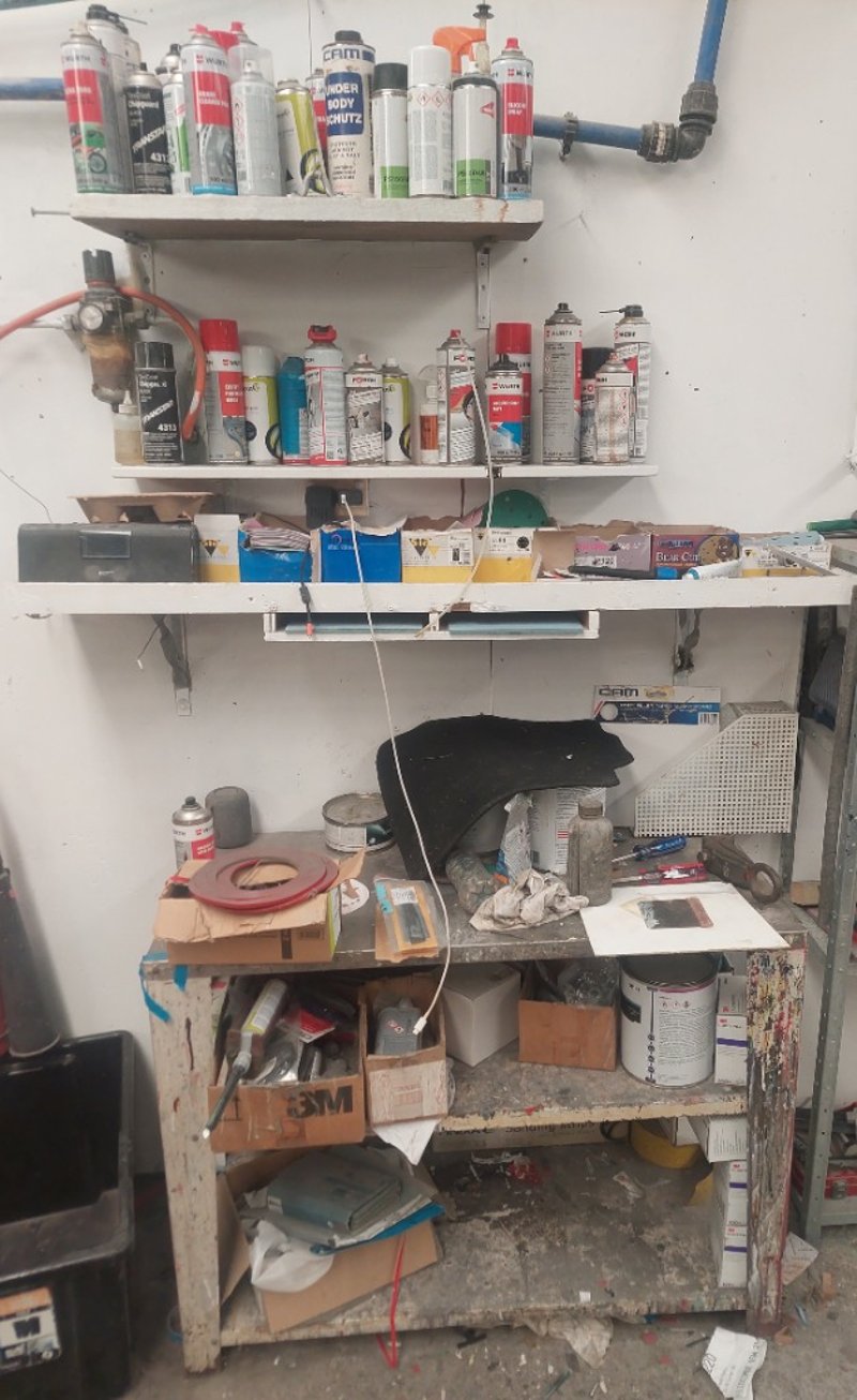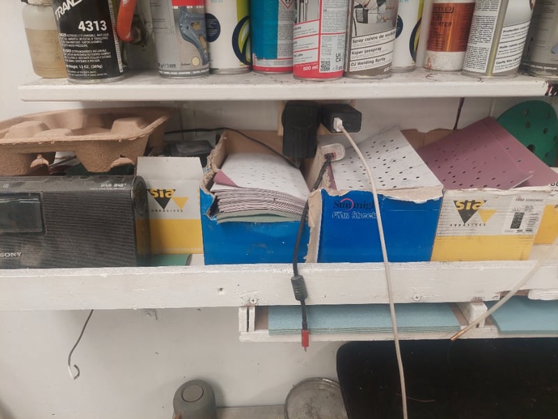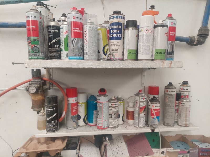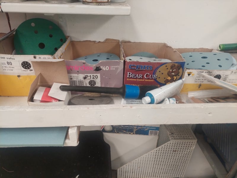 Assorted lot includes, shelving, Various types of sandpaper and spray cans.
