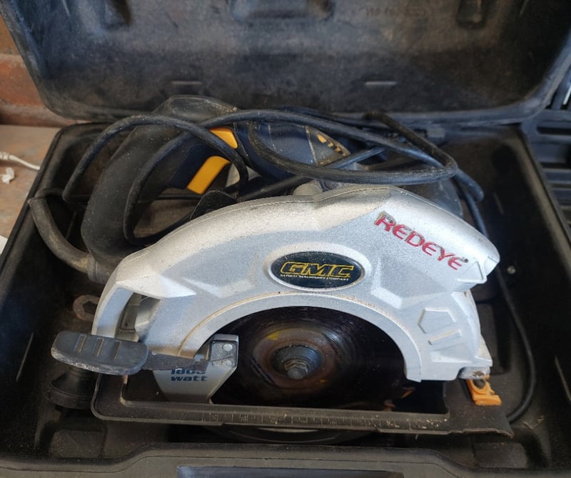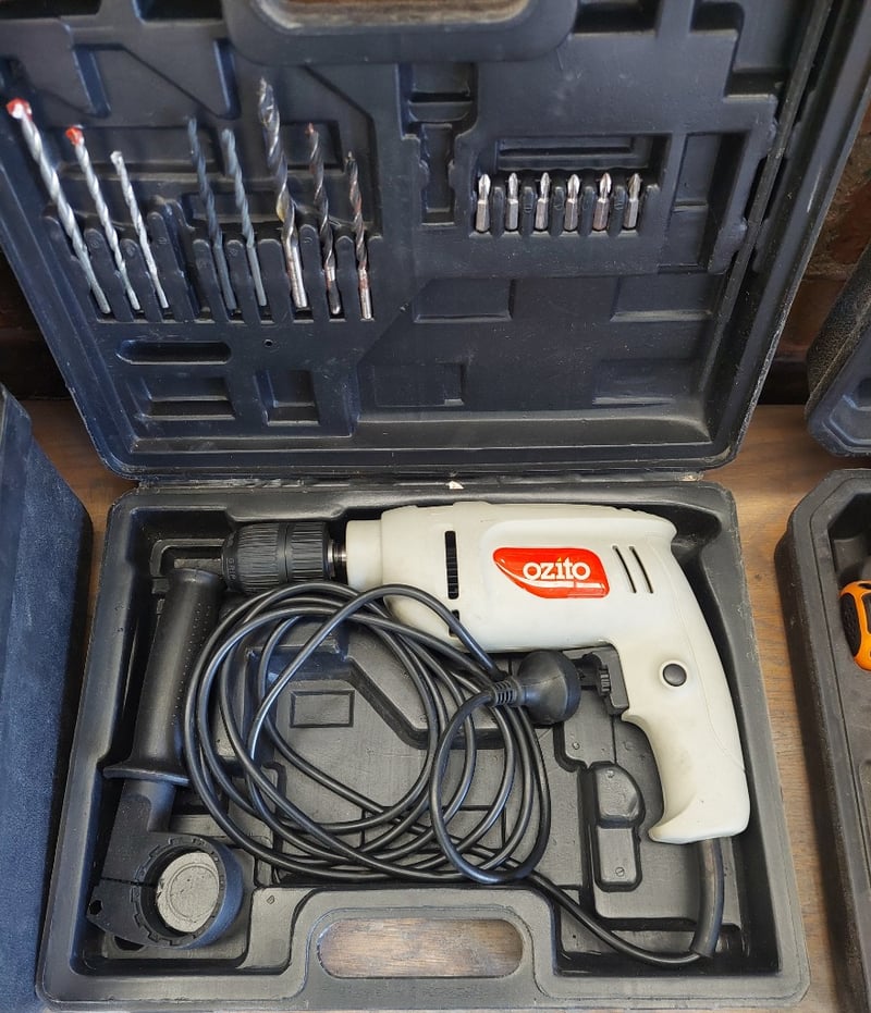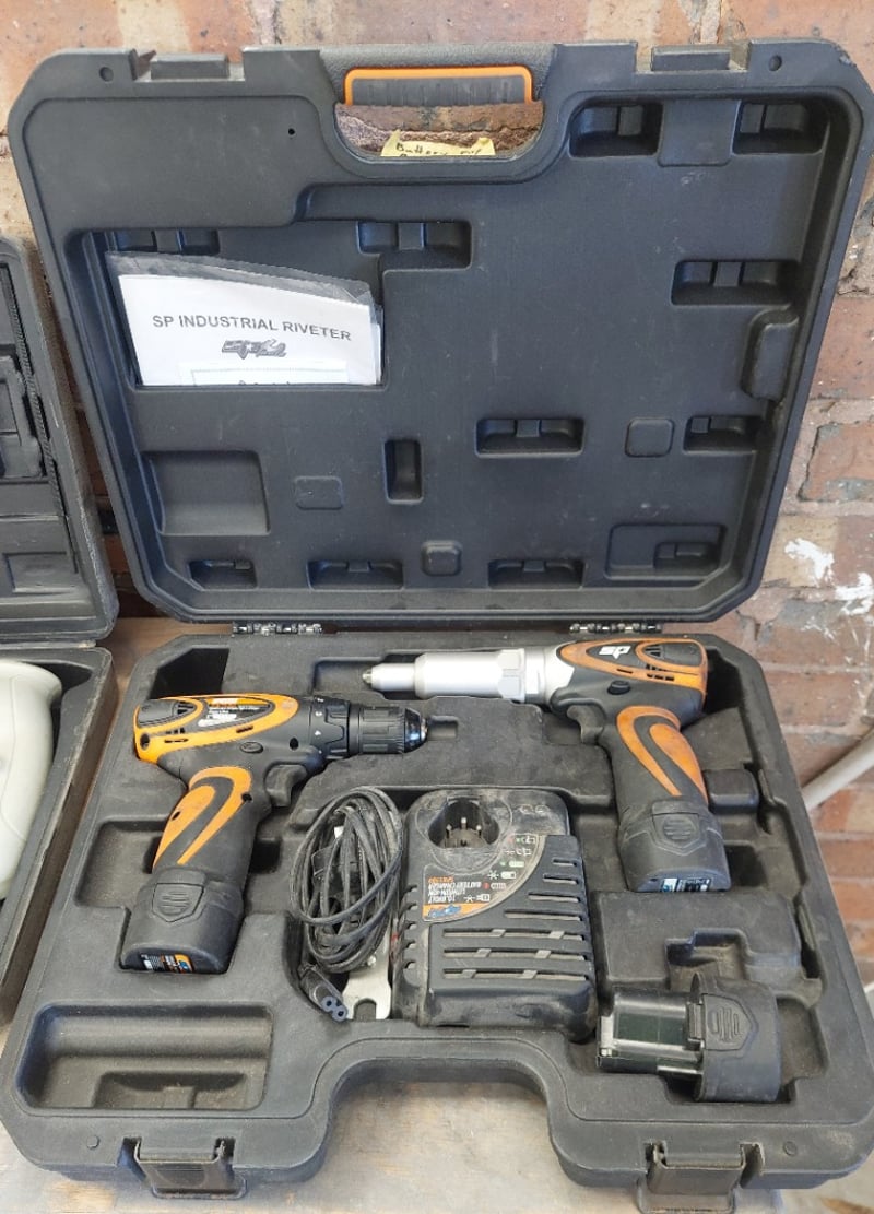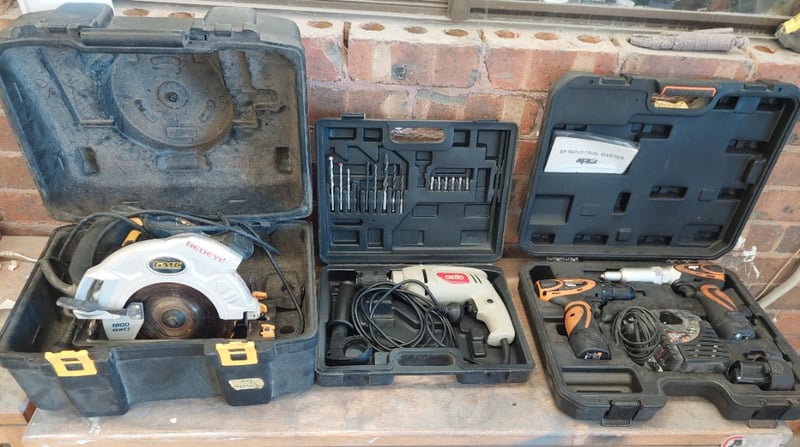 Assorted tools including, Ozito 710W Hammer Drill, GMC LS5000 1800W Circular Saw, SP Tools 12V Li-ion cordless riveter.
