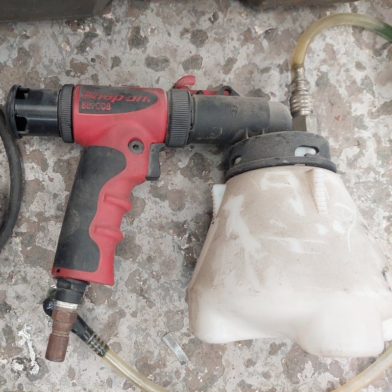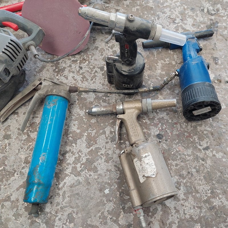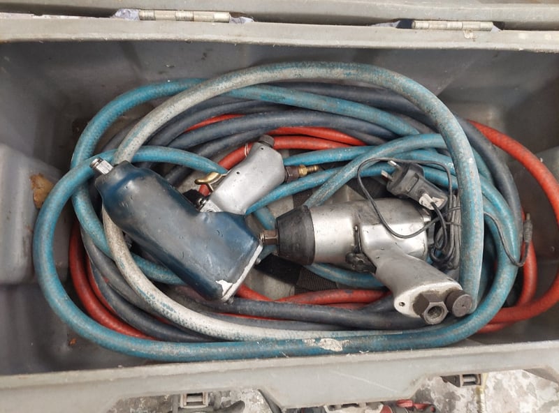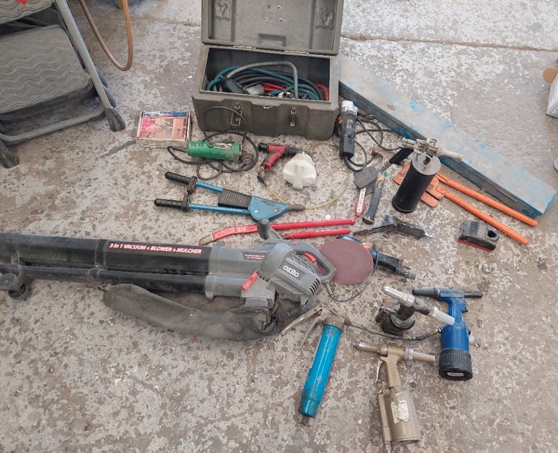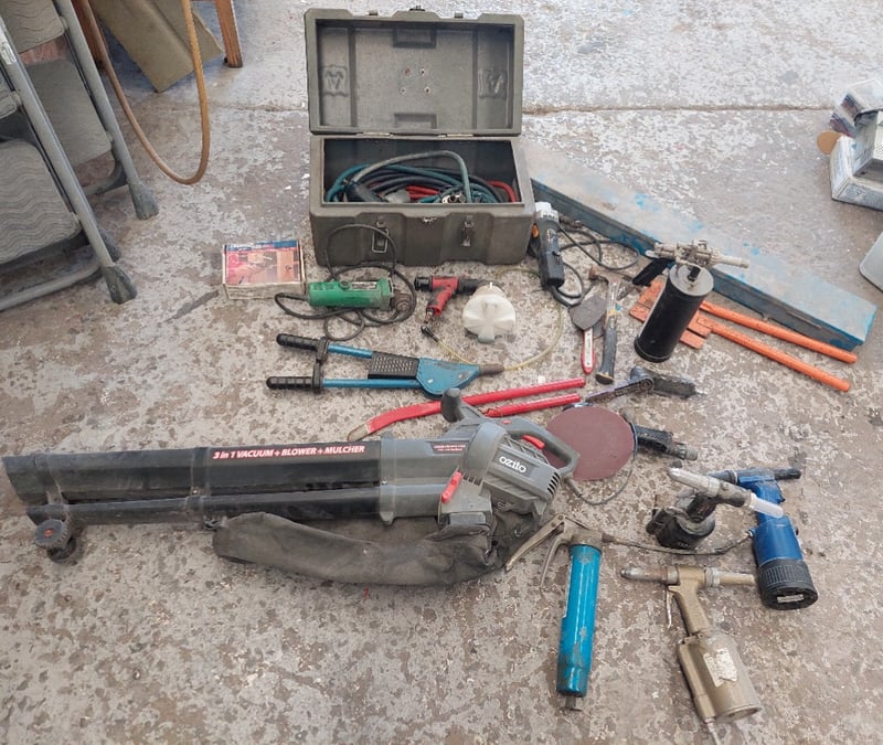 Assorted tools including, pneumatic air impact wrenches, Snap-on Vacuum Brake Bleeder, Hitachi G10SD1 disc grinder, pneumatic air belt sander, Ozito 2400W 3-in-1 Blower Vacuum Mulcher and more....