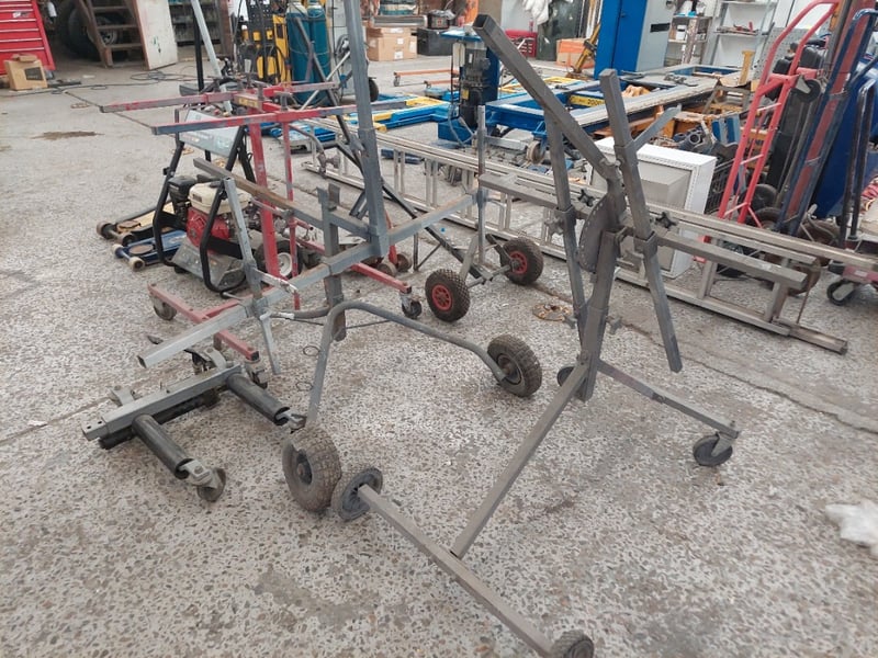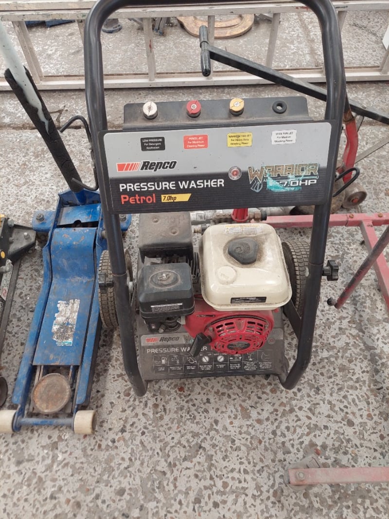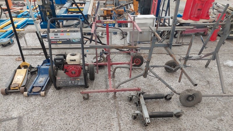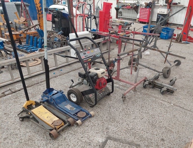 Assorted lot, includes paint stands, pressure washer, car jacks and more...Sold as lot.Notes: items untested and signs of wear.