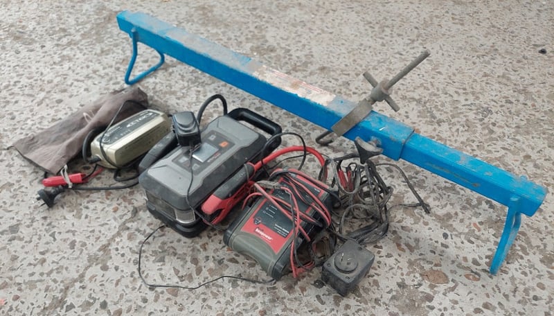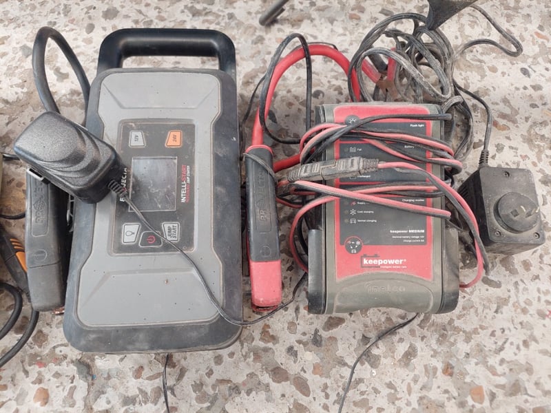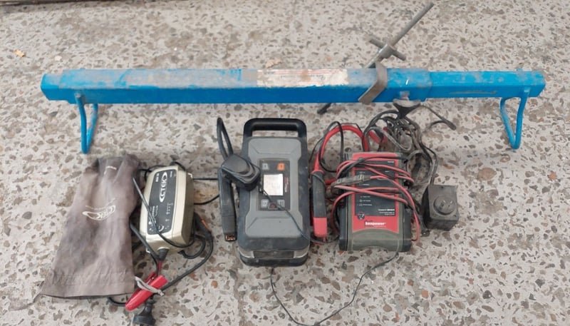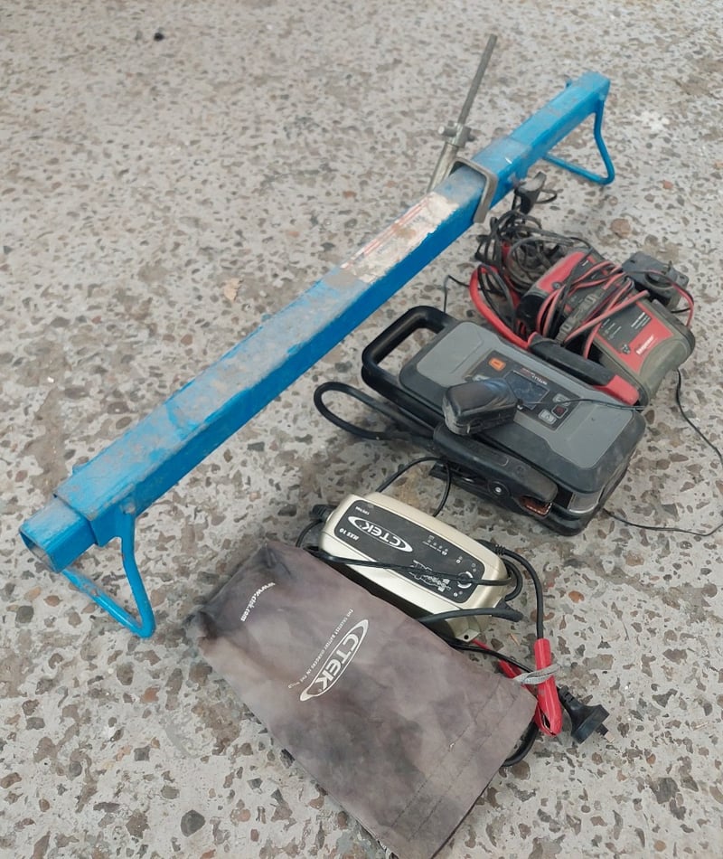 Assorted lot includes engine support bar and various brands of jump starters.
