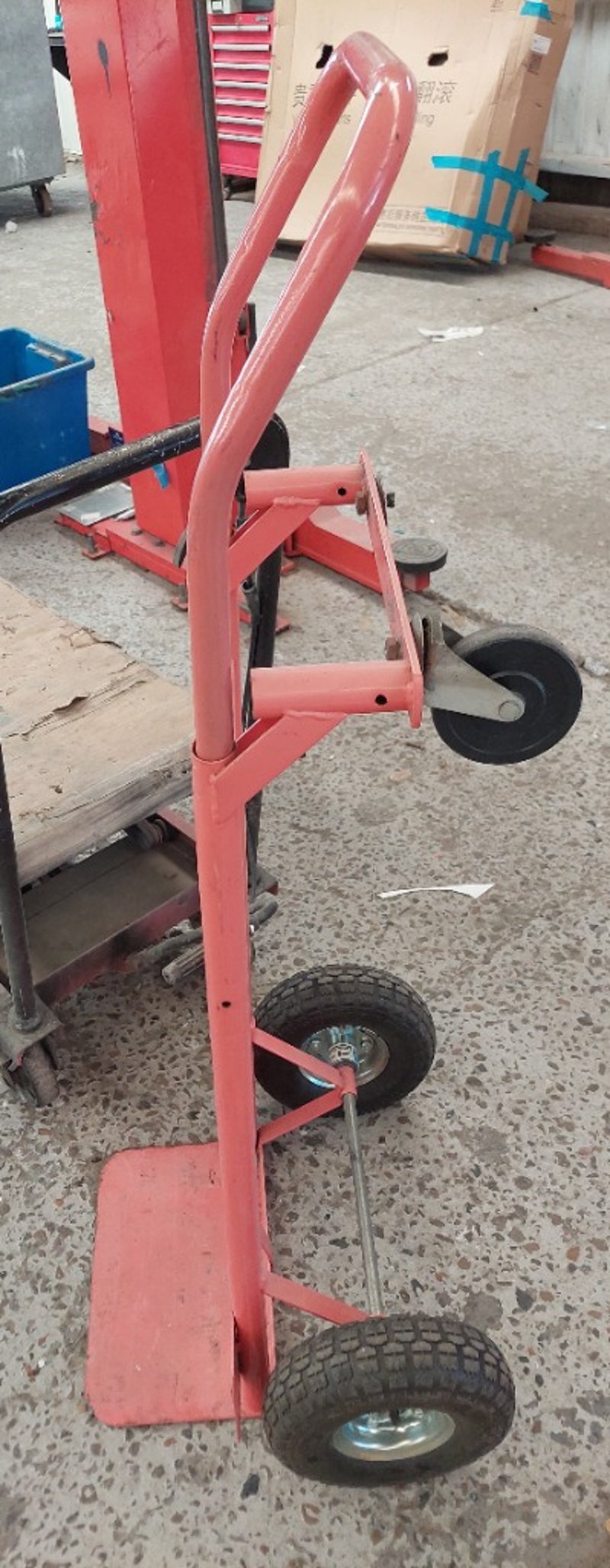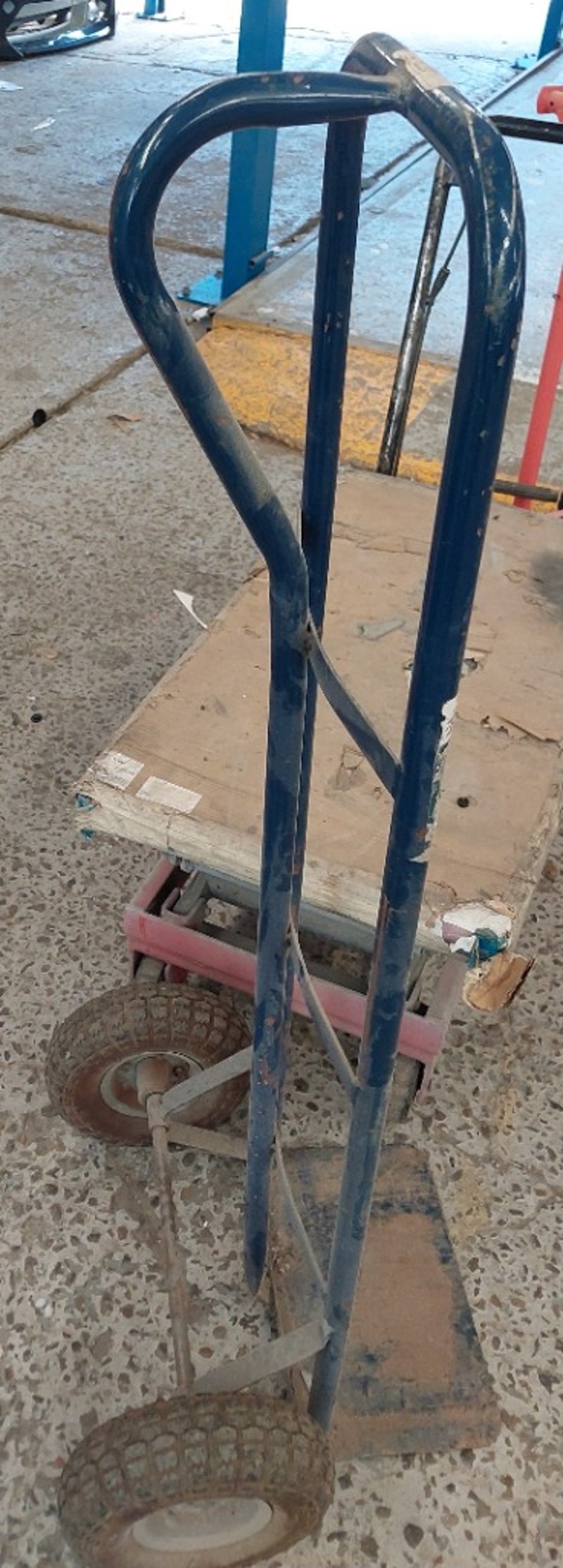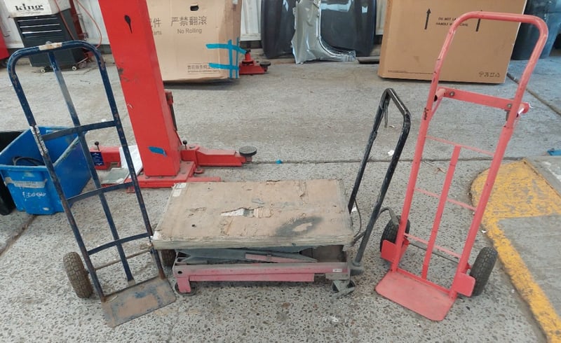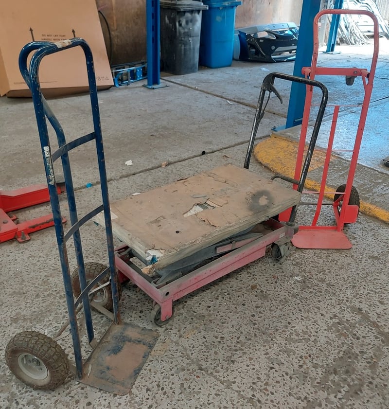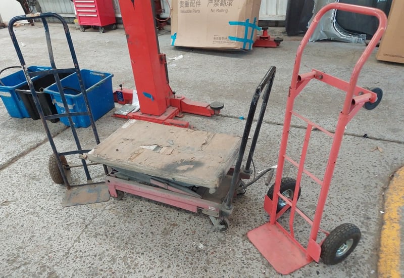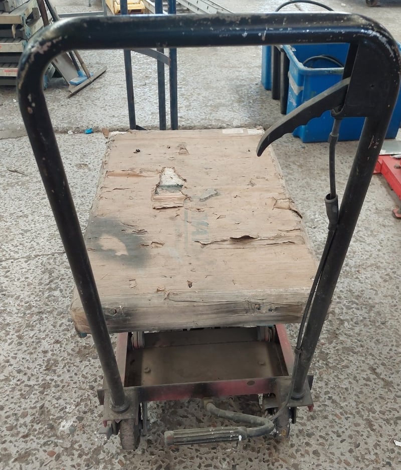 Assorted lot includes, manual hydraulic scissor lift trolley and industrial hand trolleys.Sold as lot.Notes: items untested and signs of wear.