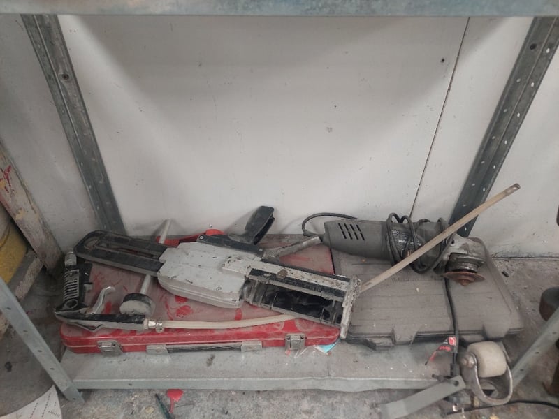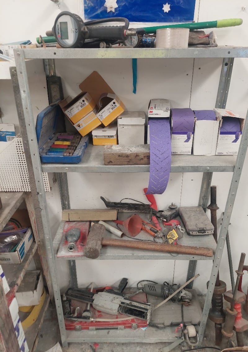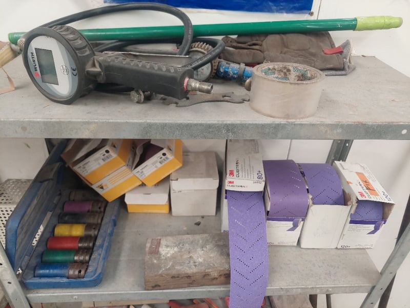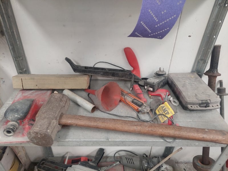 Assorted lot including steel shelf various types of sandpaper, tools and toolboxes.Sold as lot. Notes: items untested and signs of wear.