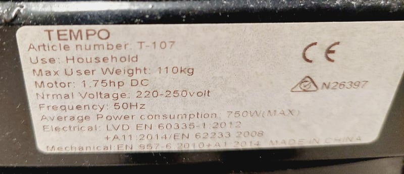 Tempo T107 Treadmill.Note: item is untested, signs of wear.