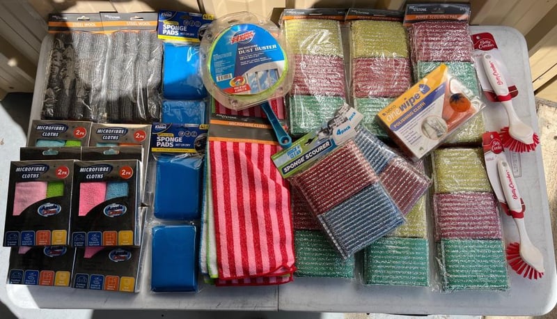 Carton of Cleaning Products including Sabco Envo Cloth, Scourers, Brushes, Wonderscrubbers, Microfibre Cloths and more Brand New SOLD AS 1 LOT