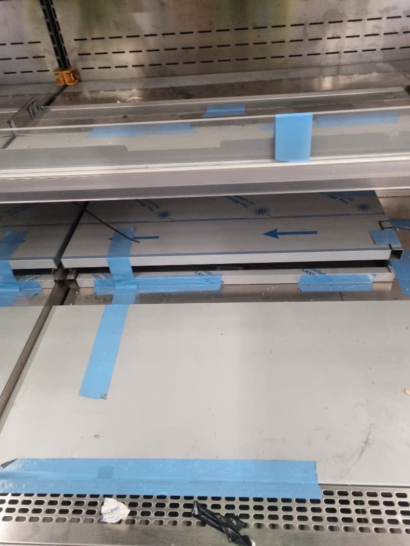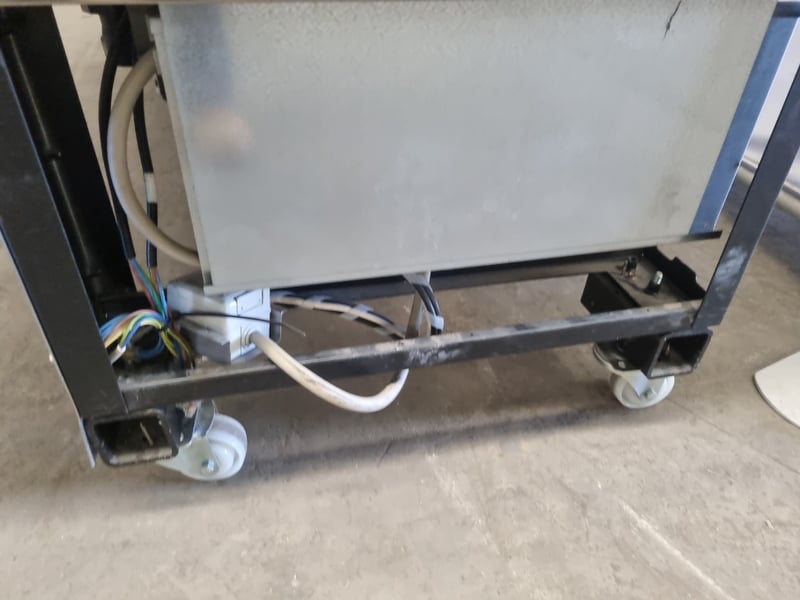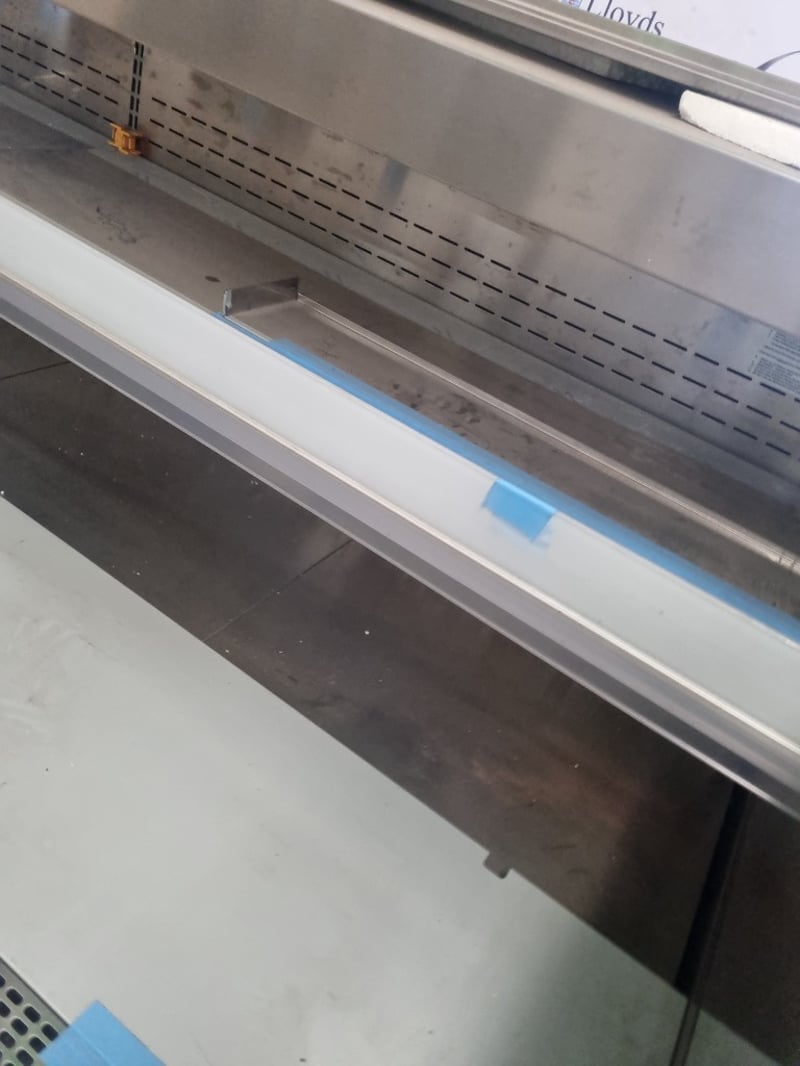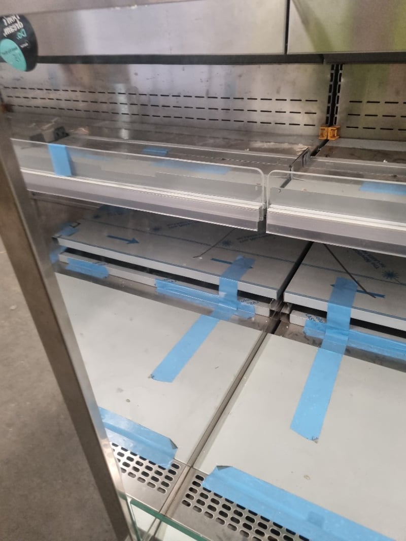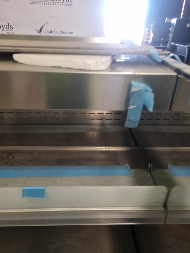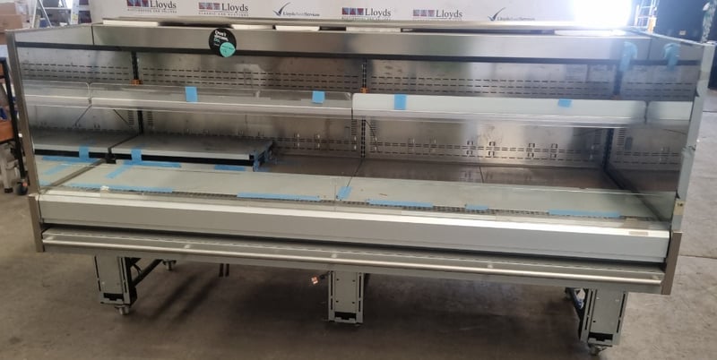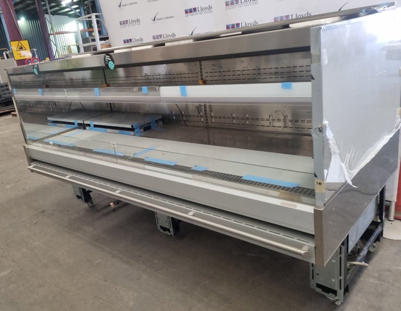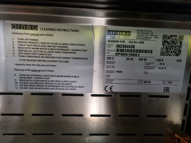 Arneg refrigerated open display case model GLASGOW H135 (CLS 244 23050), Commercial-grade chilled display unit features stainless steel construction with multiple glass shelves and perforated backing panels. Dimensions accommodate standard commercial kitchen integration. Internal components feature removable display plates and grids for flexible product presentation. Cast wheels at base provide mobility.
