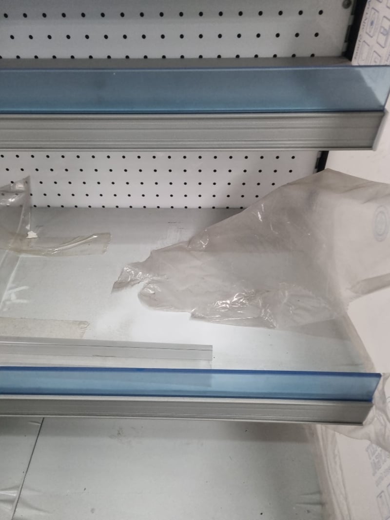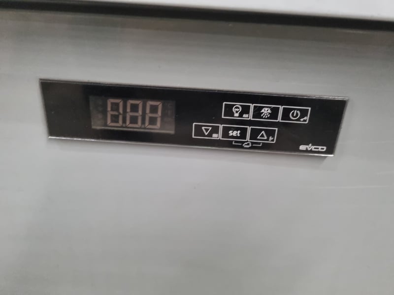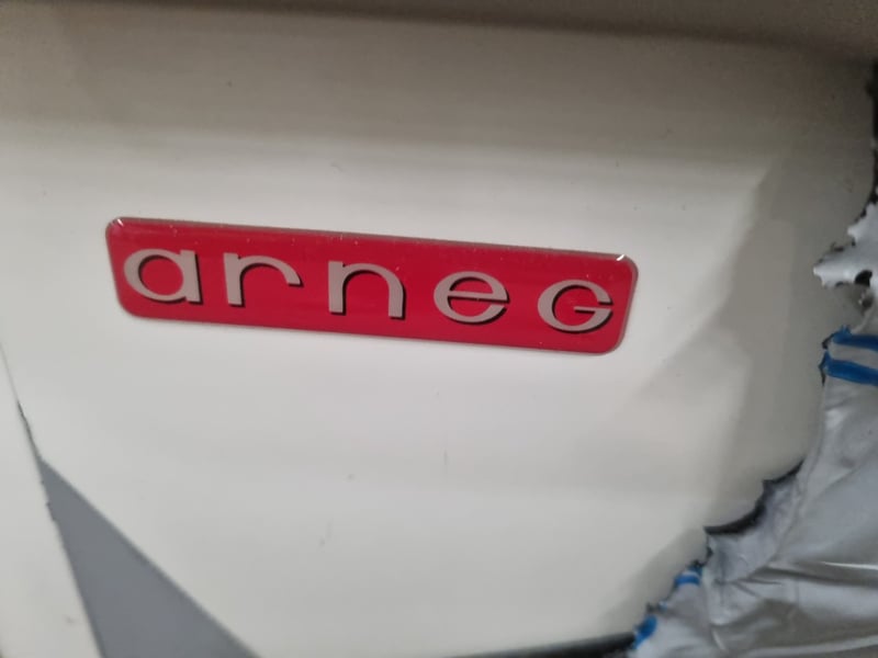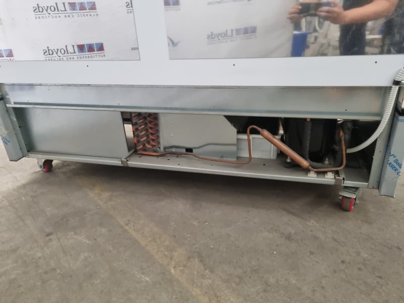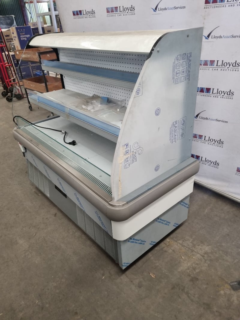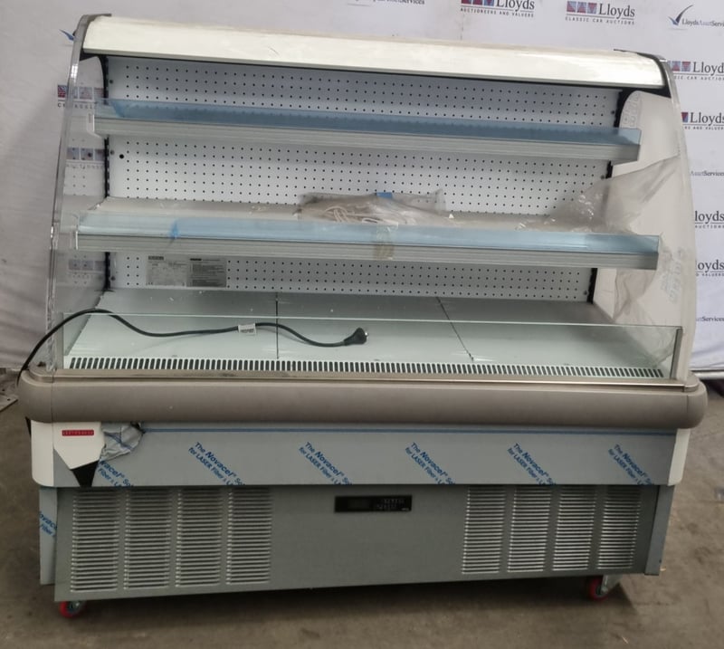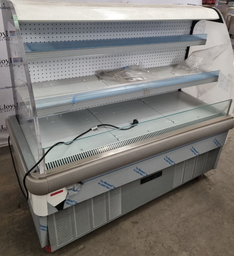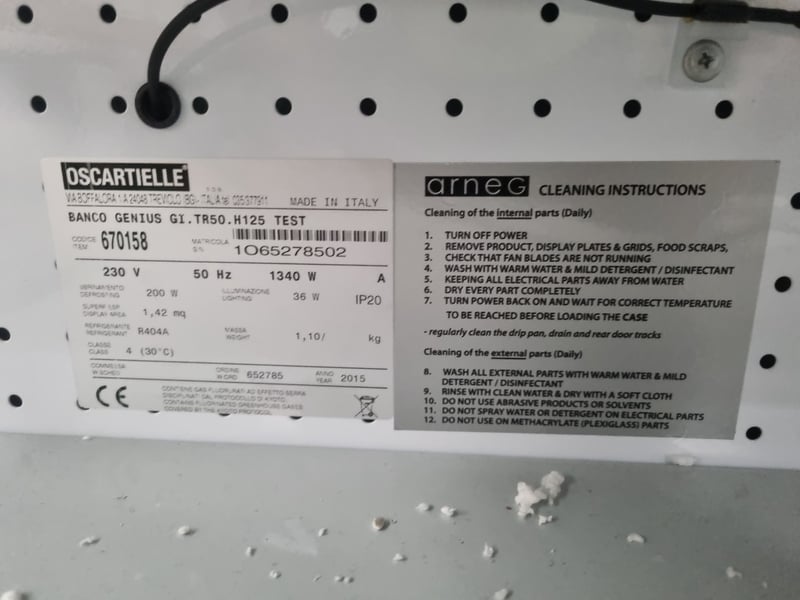 Oscartielle Banco Genius G1.TR50.H125 refrigerated display case by Arneg. White finish with curved glass front and three adjustable shelves with perforated backing. Features electronic temperature control (Evco controller displaying 8°C digital readout), curved glass canopy, and blue trim accent bands. Equipped with night blinds, internal lighting, and remote refrigeration system. Includes instruction manual (multilingual)Dims: 158 x 69 x 144cm Note: untested,signs of wear