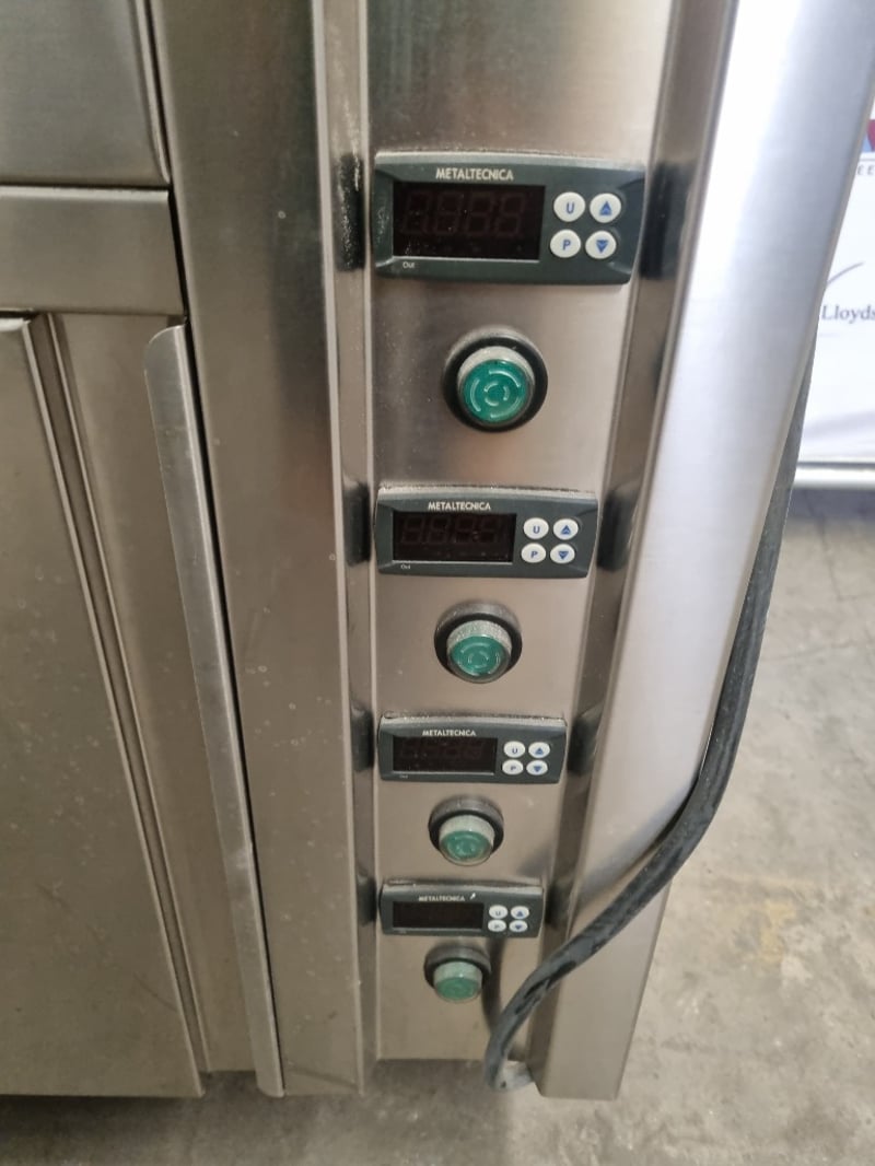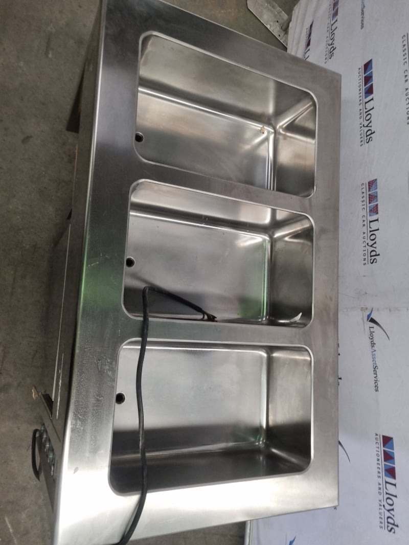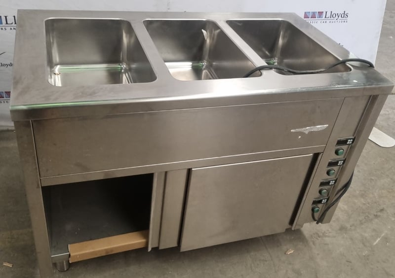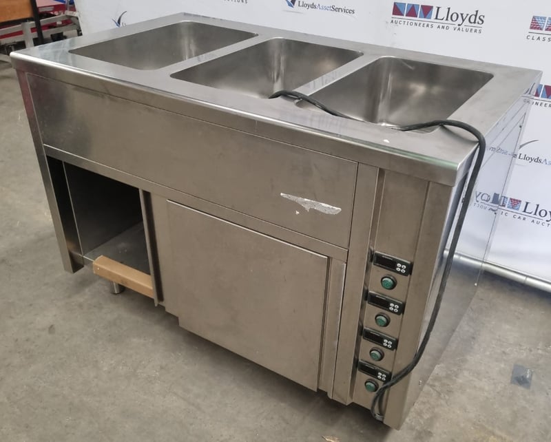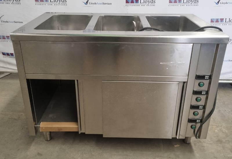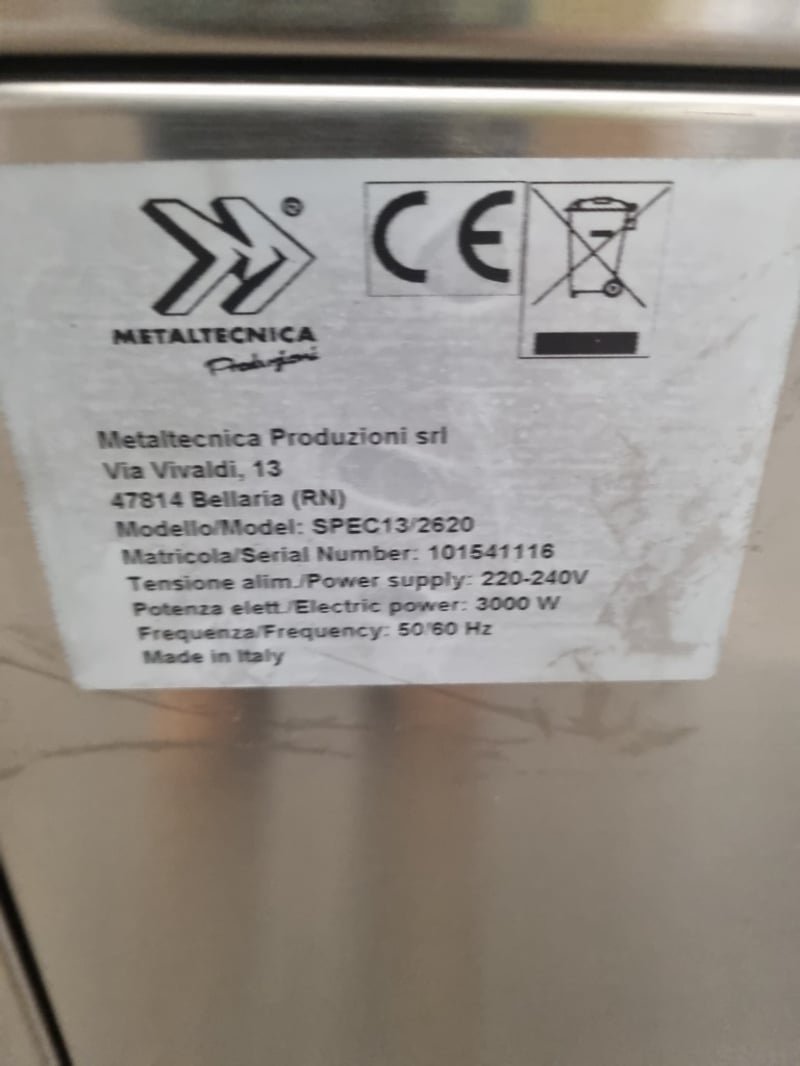 Metaltecnica SPEC13/2620 commercial bain-marie serving unit featuring three integral stainless steel rectangular wells with drip trays, designed for professional catering applications. The unit comprises a lower storage compartment with double doors and an open shelf section, complemented by an upper warming section with three independently controlled heating elements (Metaltecnica controllers with digital displays). Model reference SPEC13/2620, Serial Number 101541116.