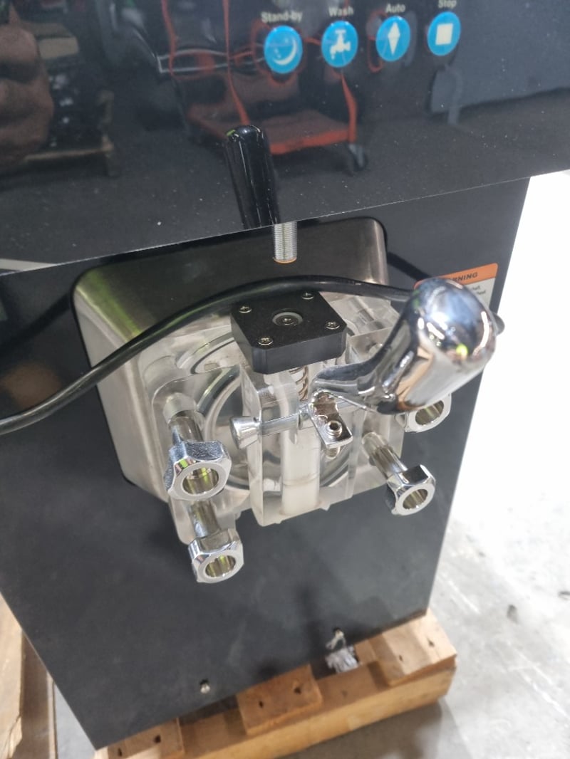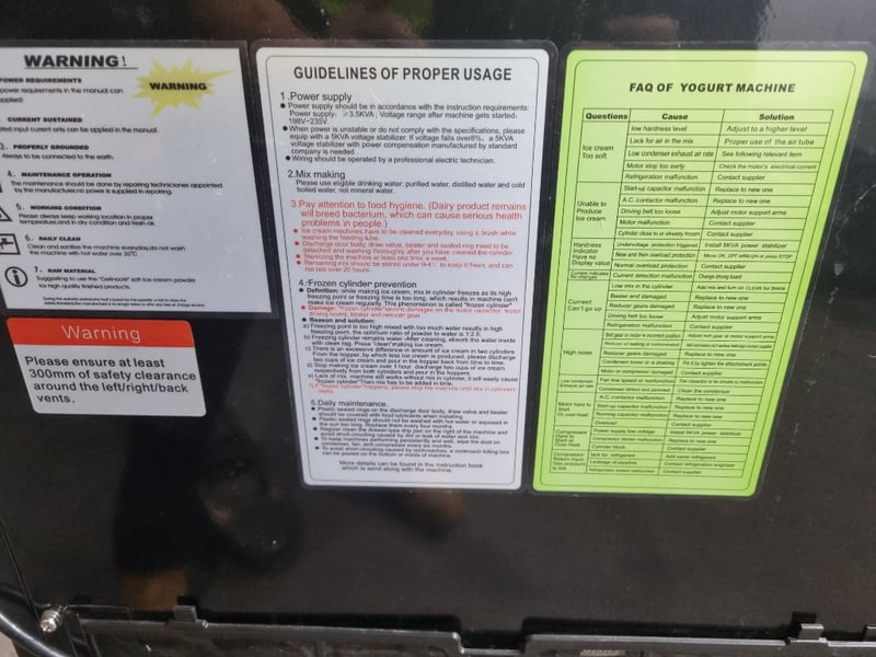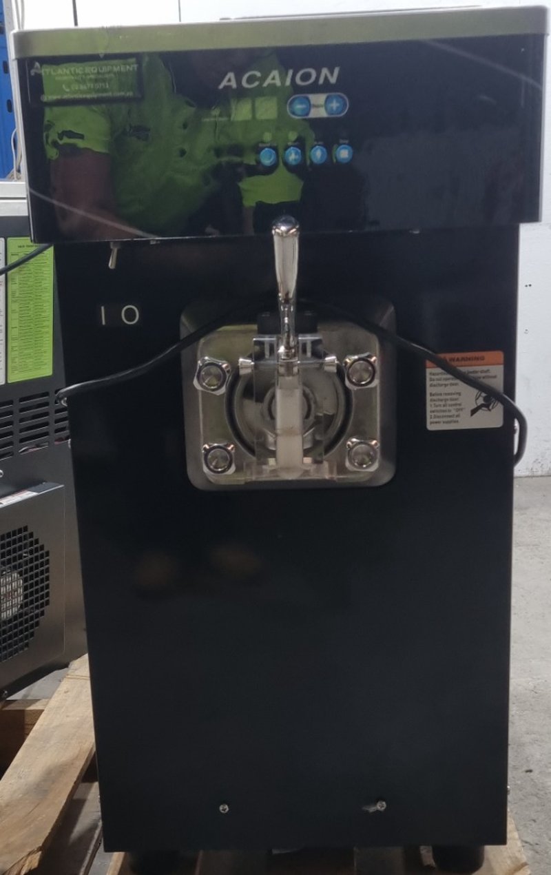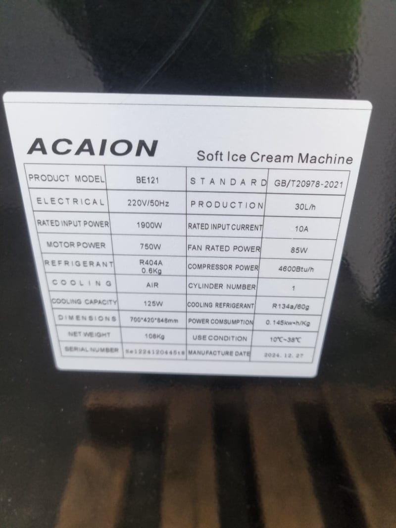 ACAION Model BE121 commercial soft ice cream machine, manufactured 12/2024. Three-flavour capacity with single cylinder design. Features air-cooled system with R404A refrigerant (0.6kg charge) and R134a/60g supplementary cooling. Equipped with 220V/50Hz electrical supply (1900W rated input, 10A current), 750W motor power, and 85W fan rated power. Production capacity 30L/hour. Stainless steel serving nozzles with chrome-plated dispensing handles. Control panel with eight illuminated function buttons (Standby, Wash, Auto, and additional operational modes). Mesh-grille sides for air circulation. Machine dimensions 760mm (H) x 420mm (W) x 848mm (D). Includes comprehensive operational guidelines and troubleshooting FAQ documentation affixed to exterior.