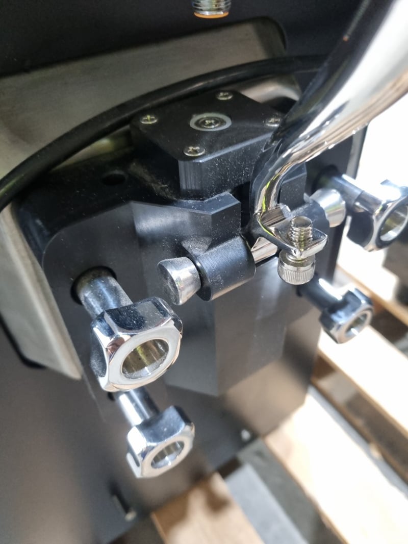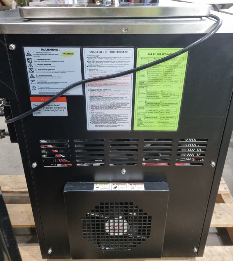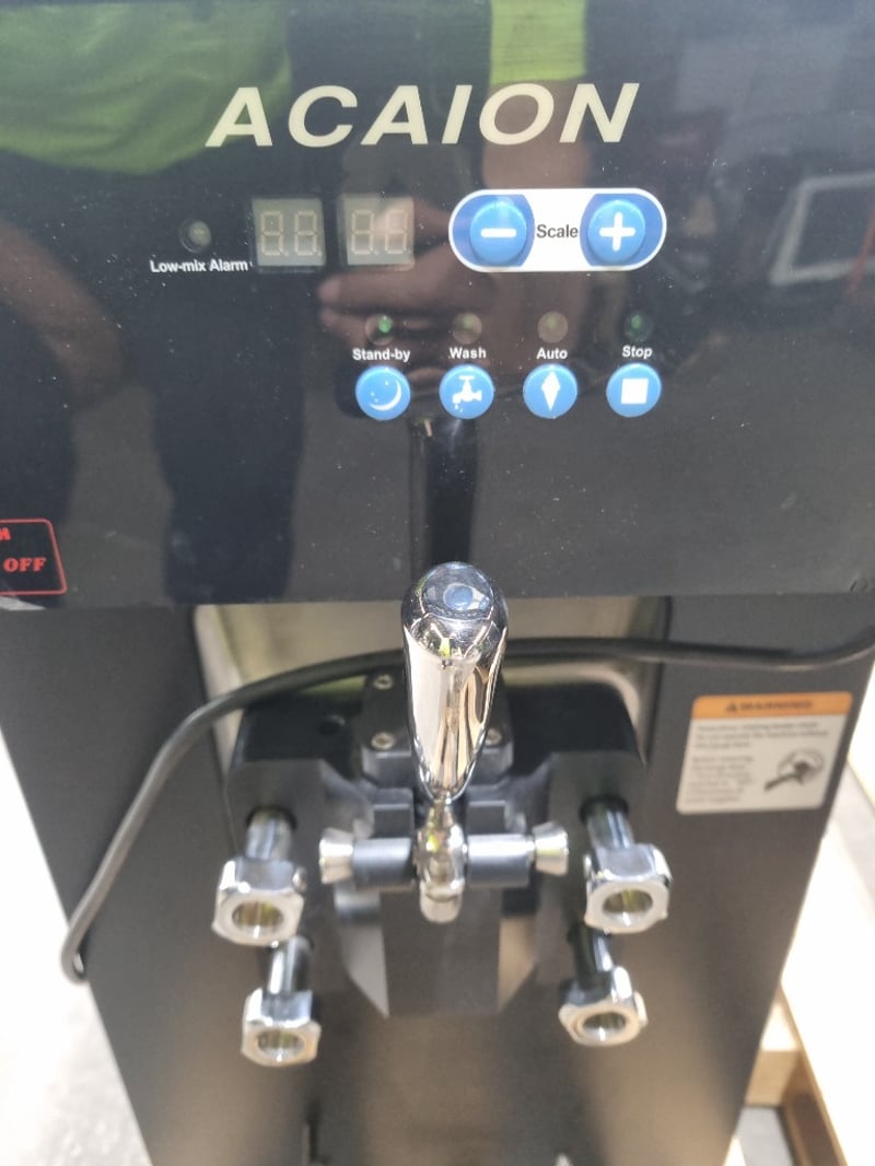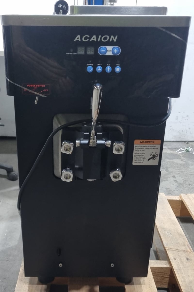 Acaion commercial soft-serve ice cream machine in black stainless steel finish. Features digital display with low-mix alarm, multiple operational modes including Stand-by, Wash, Auto, and Stop functions. Two-lever dispensing system with chrome handles and four stainless steel product cylinders with illuminated nozzles. Equipped with refrigeration unit, compressor system, and internal cooling mechanism visible through ventilation panels. Includes cleaning kit with sanitising solution and replacement components. Control panel displays time settings and operational parameters. Note: untested,signs of wear