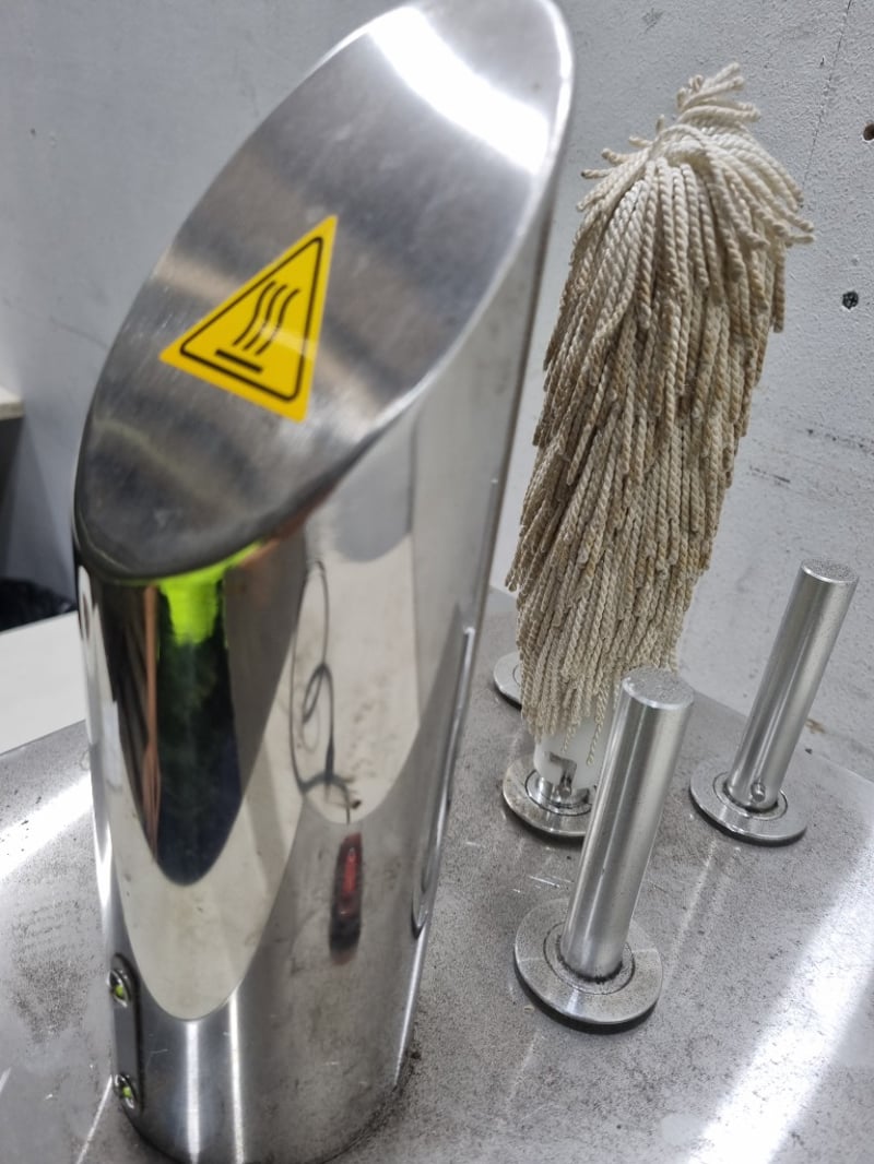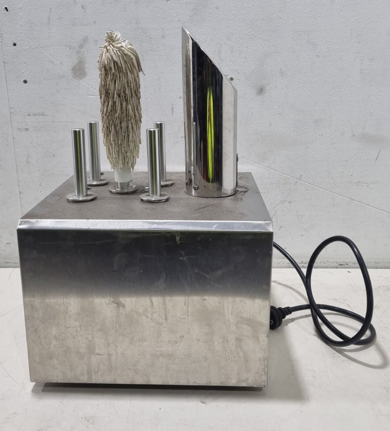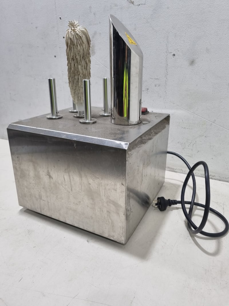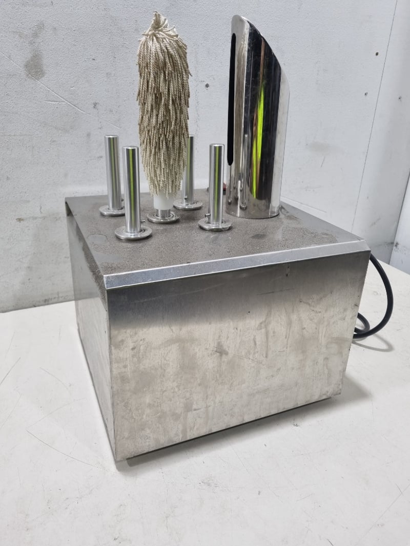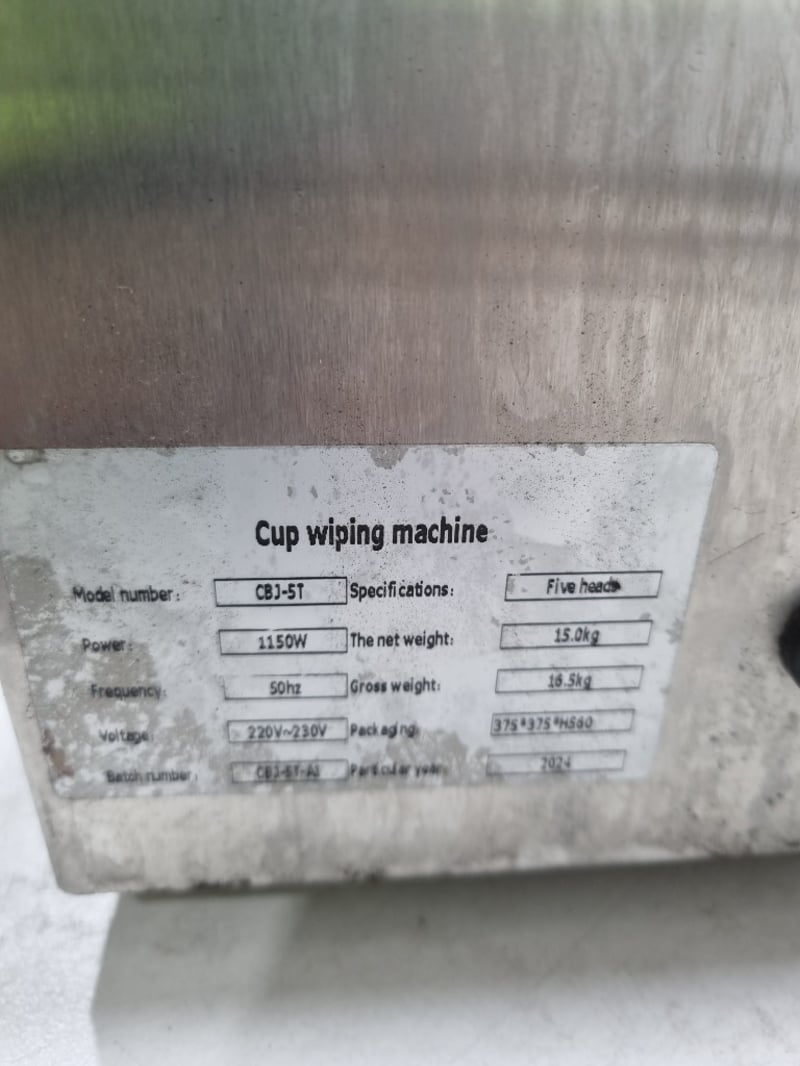 Professional commercial cup wiping machine model CBJ-5T featuring five rotating stainless steel heads with natural fiber rope wipers. The unit is mounted on a concrete base platform with stainless steel construction.