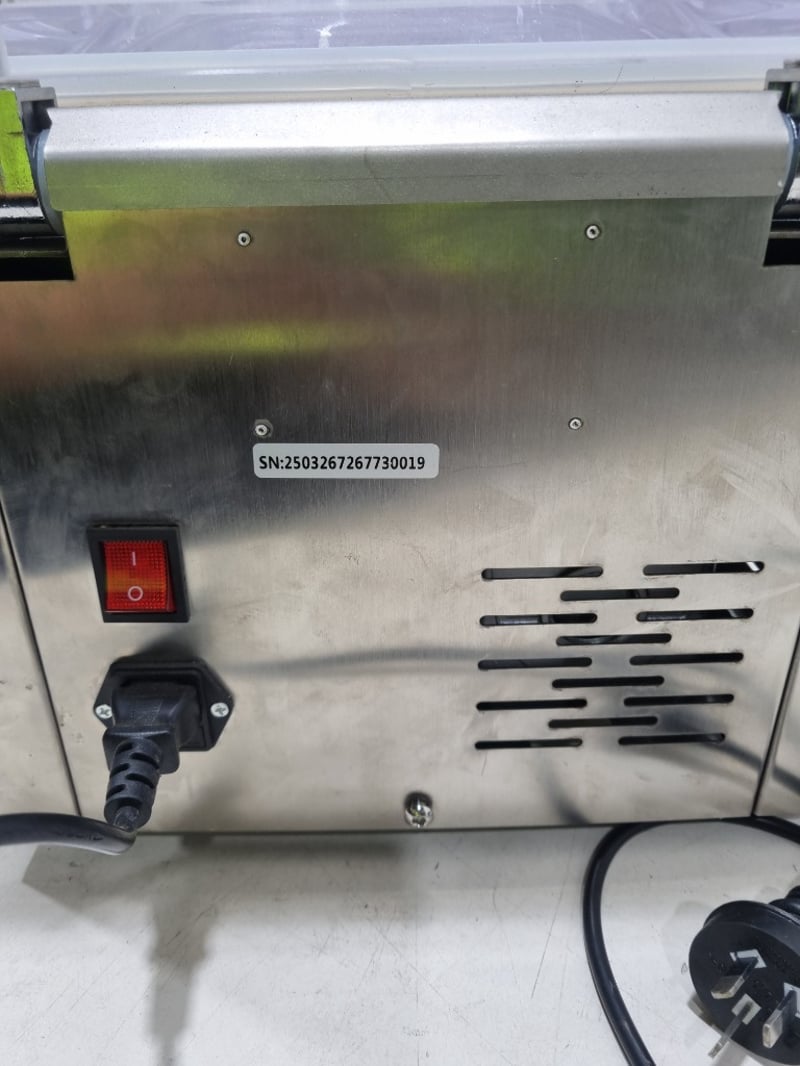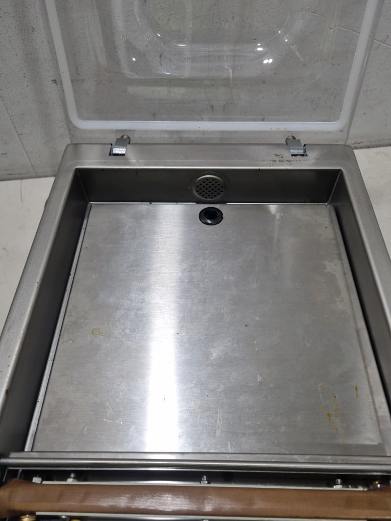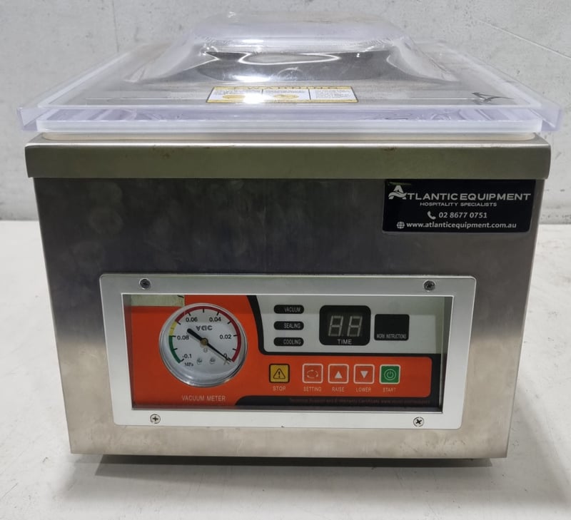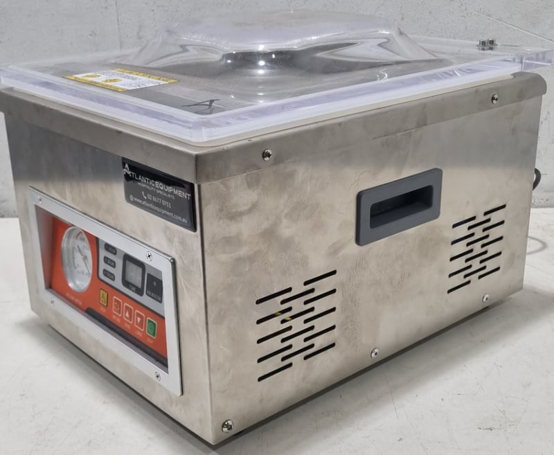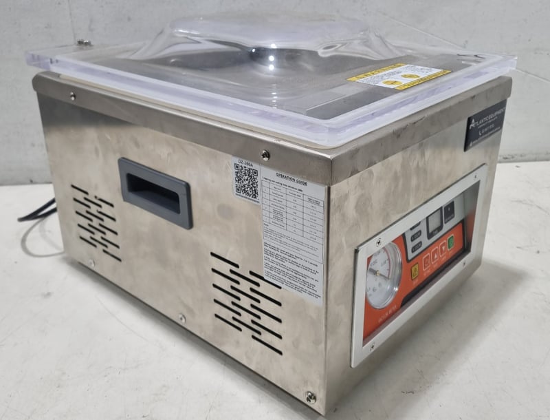Commercial vacuum sealing machine by Atlantic Equipment, featuring stainless steel construction with vacuum meter and digital controls.