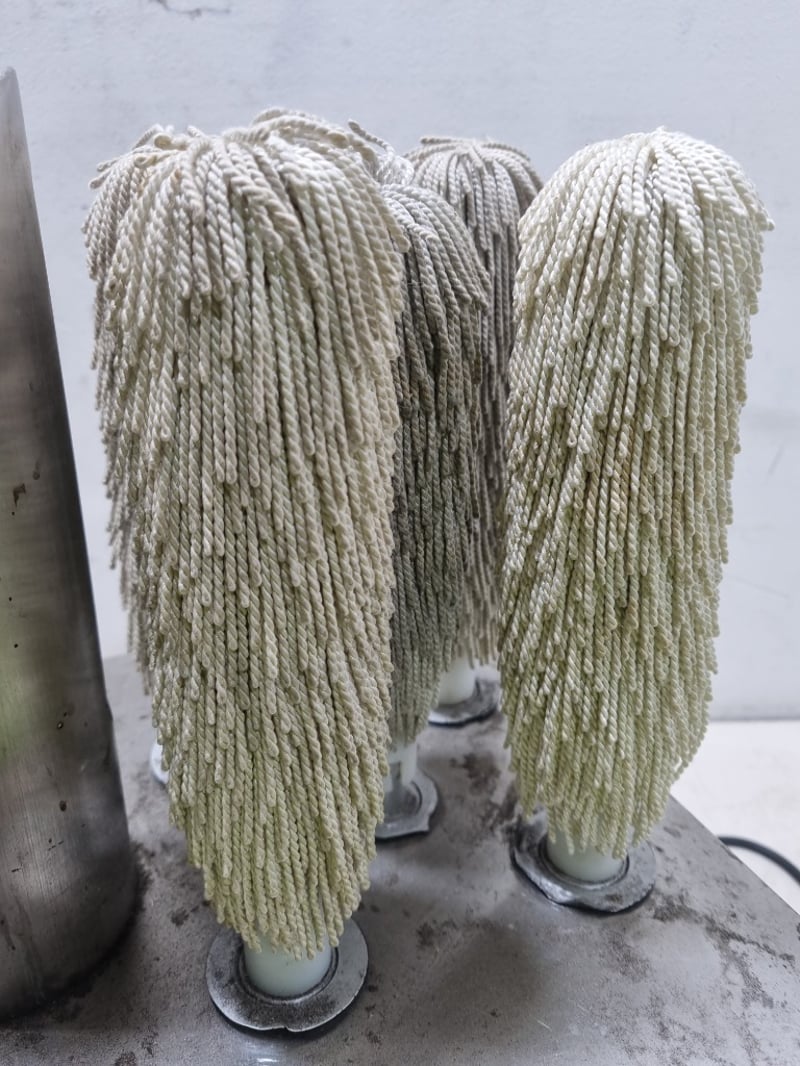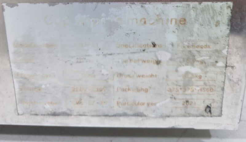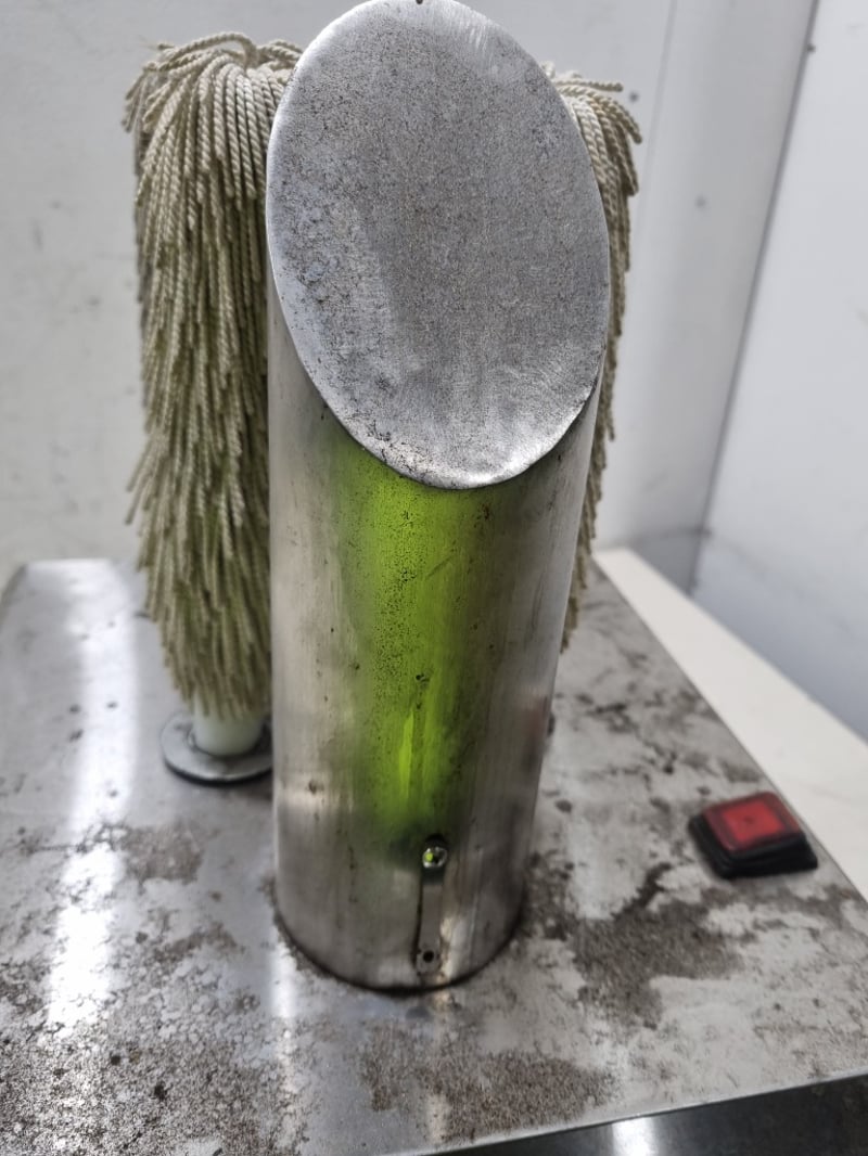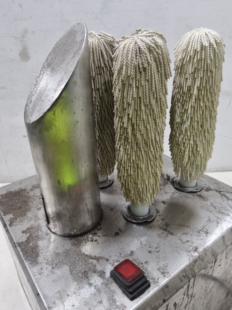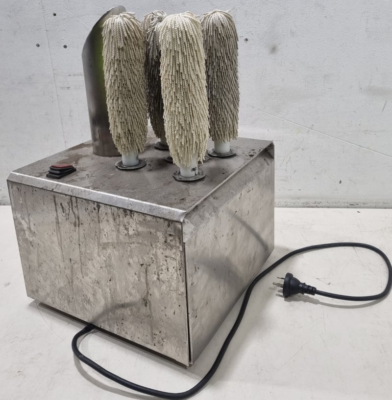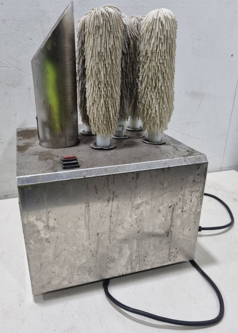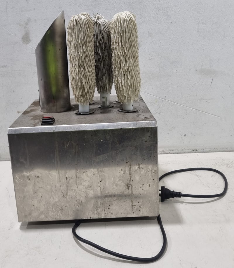 Industrial rotary brush cleaning machine mounted.. Features a metal cylindrical housing with operator control panel containing power switch (red button). Three rotating brush heads with natural bristle construction. Note: untested,signs of wear