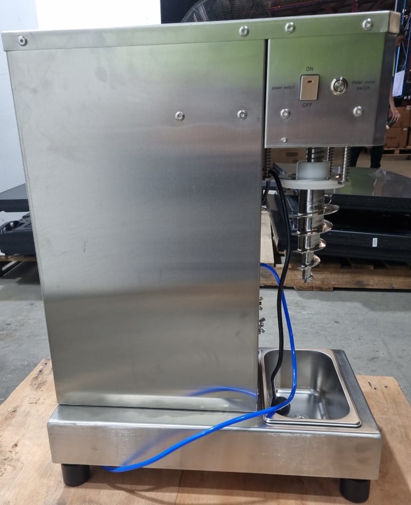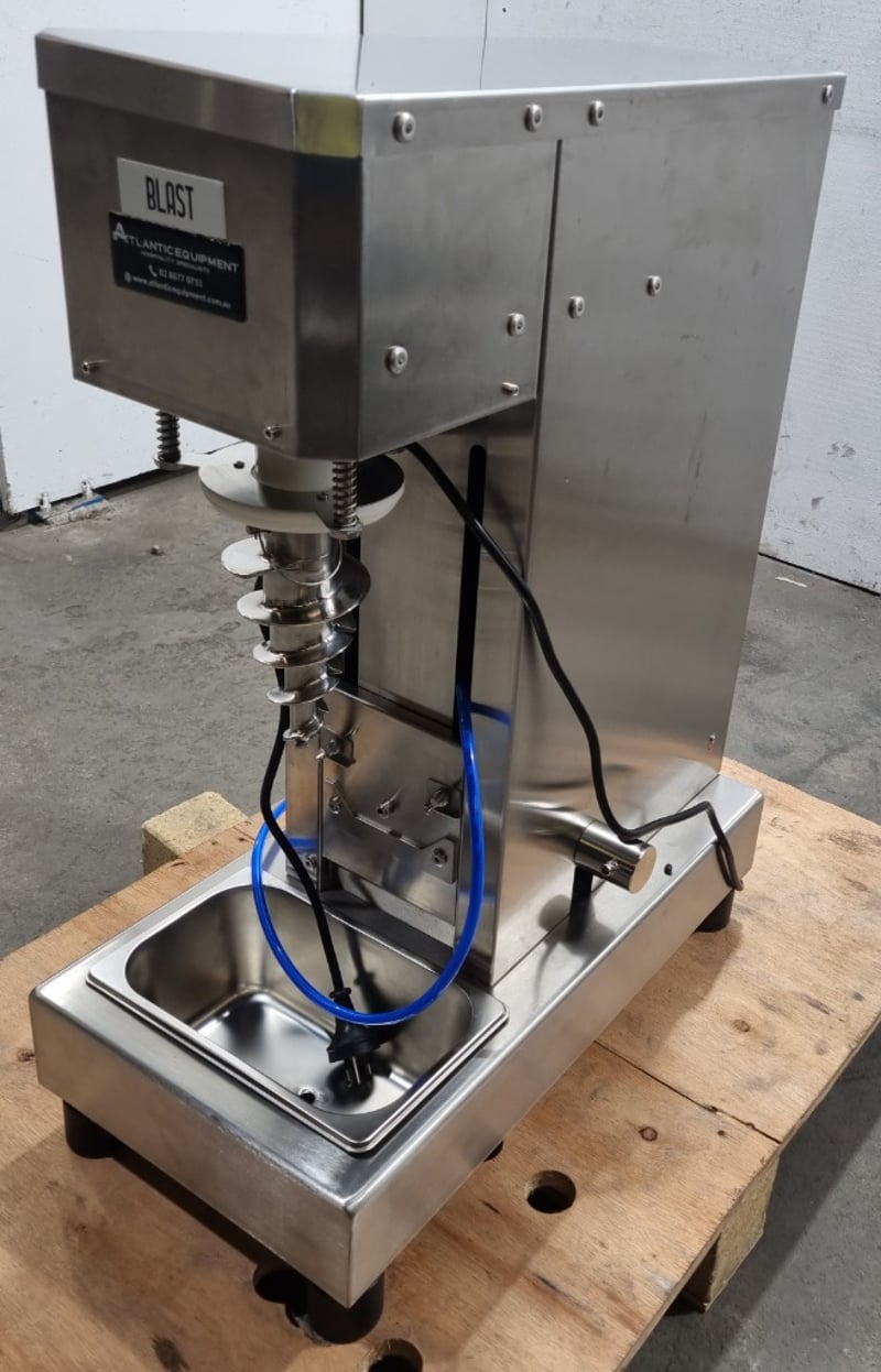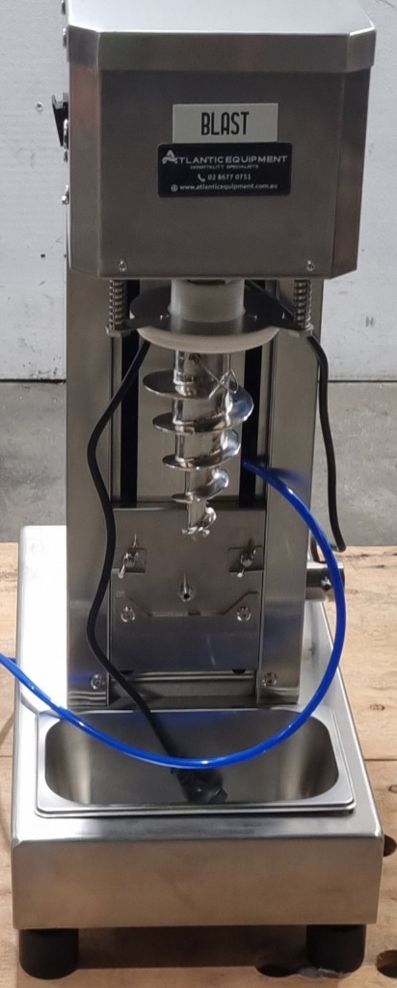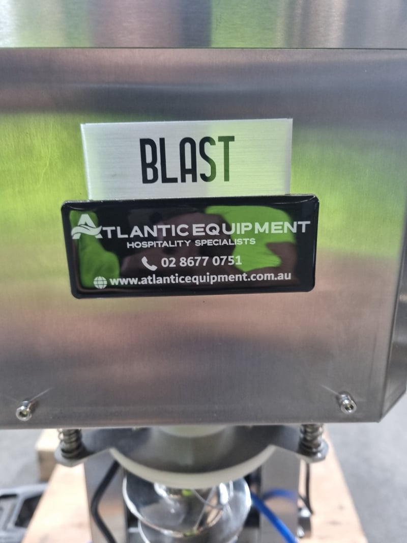 Atlantic Equipment "BLAST" commercial food processor/blender featuring heavy-duty stainless steel construction. Unit comprises a compact tabletop design with integrated mixing chamber housing a multi-tiered stainless steel auger/blade assembly. Note: untested, signs of wear