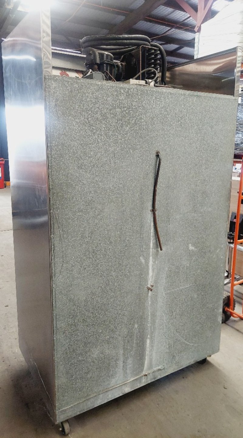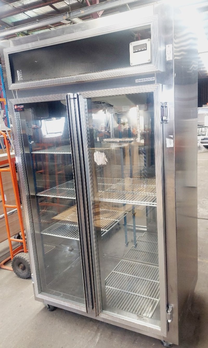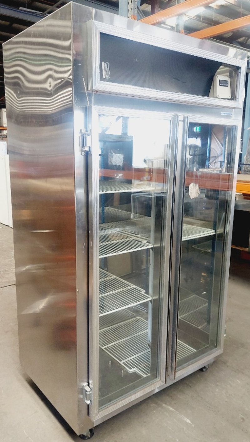Commercial double-door upright display refrigerator. Dimensions: 210cm H, 120cm L, 76cm W Note: item is untested, signs of wear.