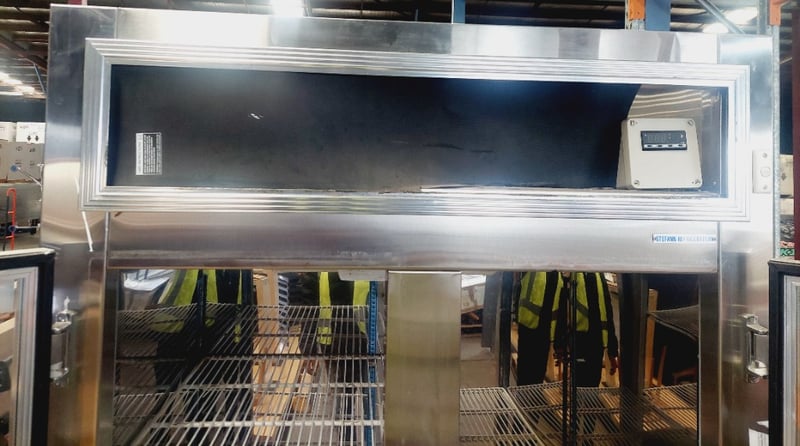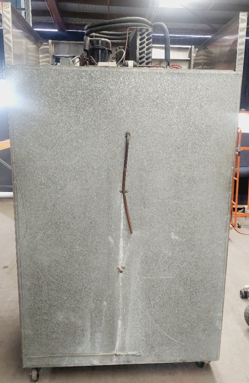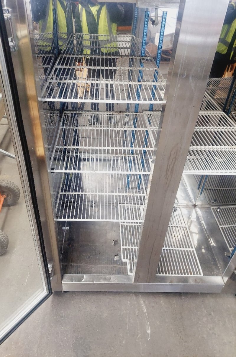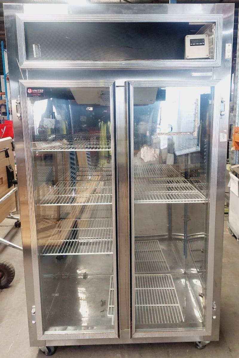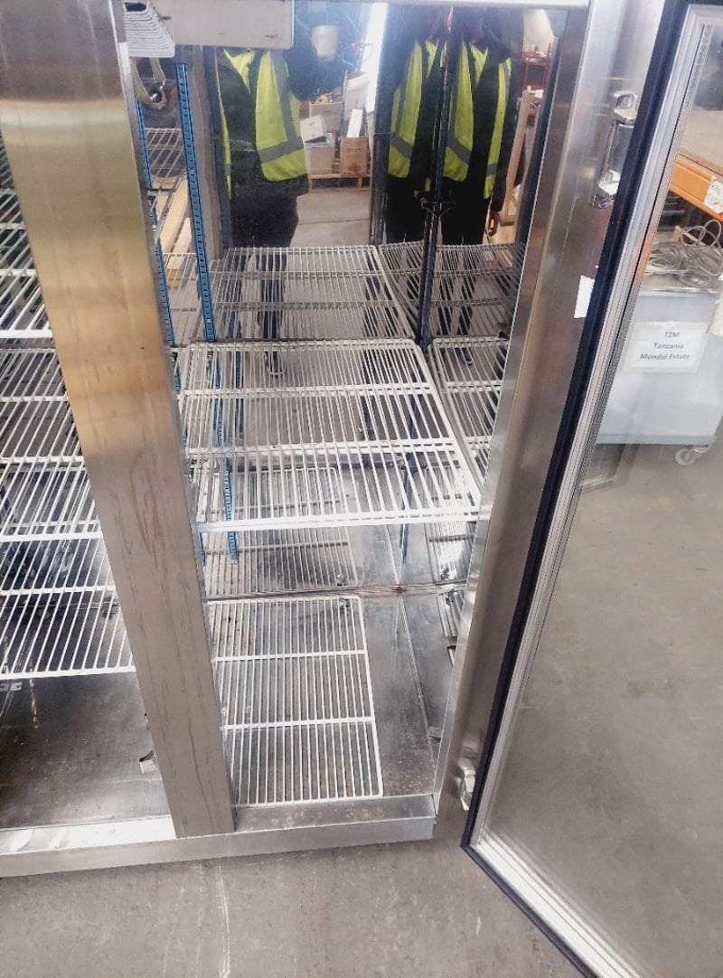 Commercial double-door upright display refrigerator. Dimensions: 210cm H, 120cm L, 76cm W Note: item is untested, signs of wear.