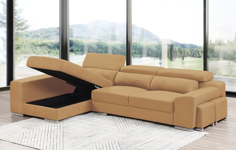 Illyria Lounge with Storage Chaise and Ottomans - CamelRRP: $7,120The Illyria is a modern lounge with two wide arms that can be used as end-tables, two independent ottomans which can be stored inside the right arm, and a spacious internal storage under the chaise.Combining versatility, practicality, and fresh looks, the Illyria seems to tick all the boxes. Its individually adjustable headrests, versatile ottomans, and the comfort of its wide comfy seats will surely bring extra joy to your leisure time at home.High quality wool and cotton blend upholsteryStorage compartment under the chaise2 matching ottomans 3 adjustable headrestsDecorative chrome feetRight arm docking for Ottomans - as on image Left Chaise - as on imageExternal measurements: Left Chaise 170cm x Back 265cm x Right 102cmColour: Camel