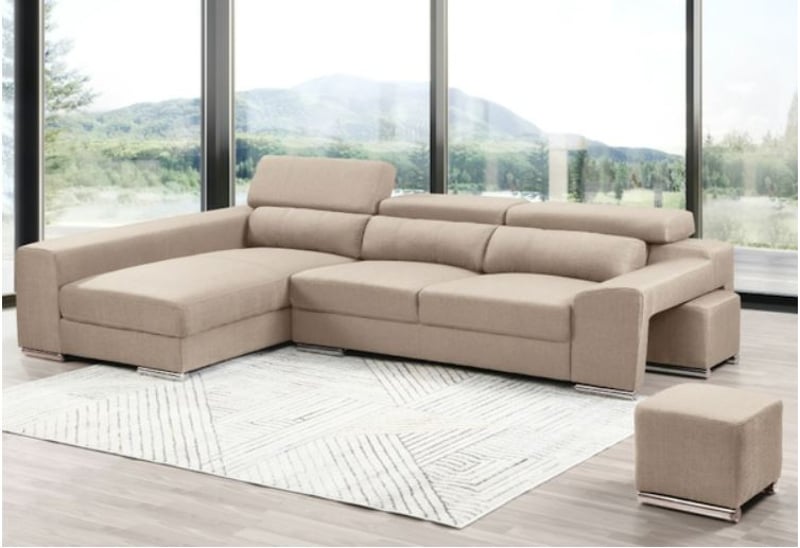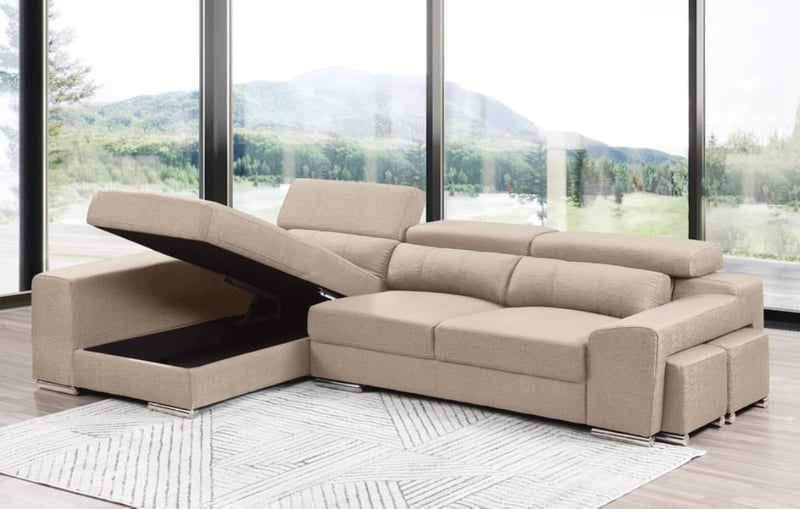 Illyria Lounge with Storage Chaise and Ottomans - BeigeRRP: $7,120The Illyria is a modern lounge with two wide arms that can be used as end-tables, two independent ottomans which can be stored inside the right arm, and a spacious internal storage under the chaise. Combining versatility, practicality, and fresh looks, the Illyria seems to tick all the boxes. Its individually adjustable headrests, versatile ottomans, and the comfort of its wide comfy seats will surely bring extra joy to your leisure time at home.High quality wool and cotton blend upholsteryStorage compartment under the chaise2 matching ottomans 3 adjustable headrestsDecorative chrome feetRight arm docking for Ottomans - as on image Left Chaise - as on imageExternal measurements: Left Chaise 170cm x Back 265cm x Right 102cmColour: Beige