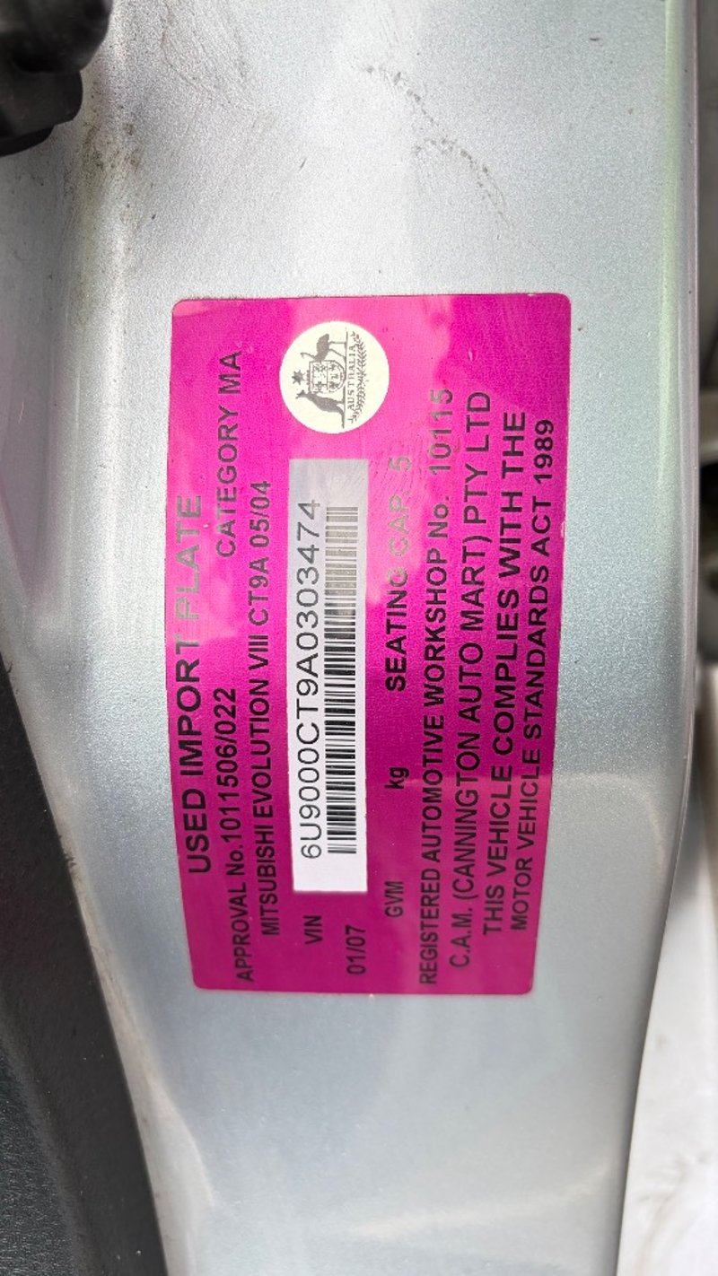 2004 Mitsubishi Evolution VIII MRYear: 2004Make: MitsubishiModel: EvolutionSeries: VIIIBadge: MR Body: 4-Door SedanDrive Type: All wheel driveOdometer: Indicating 264,436 KilometersEngine: 2.0 I4 Turbo PetrolTransmission: ManualColour: SilverSeats: 5Description/extras: Vendor advises: Standard turbo, 3 inch turbo back exhaust (x-force). ECU flash tune to 24 psi of boost. 210 awkward of power. Exert organic single plate , heavy duty clutch kit. Rear differential has been replaced. Project MU aftermarket rotors and brake pads. Evo X 18 x 8.5 inch rims. 4 x brand new tyres. drivers side door handle has been damaged, minor ware and tare throughout please inspect. VIN: 6U9000CT9A0303474ENG No: (Key #A30 Carrara)Lloyds stock #657404+1#PCV
