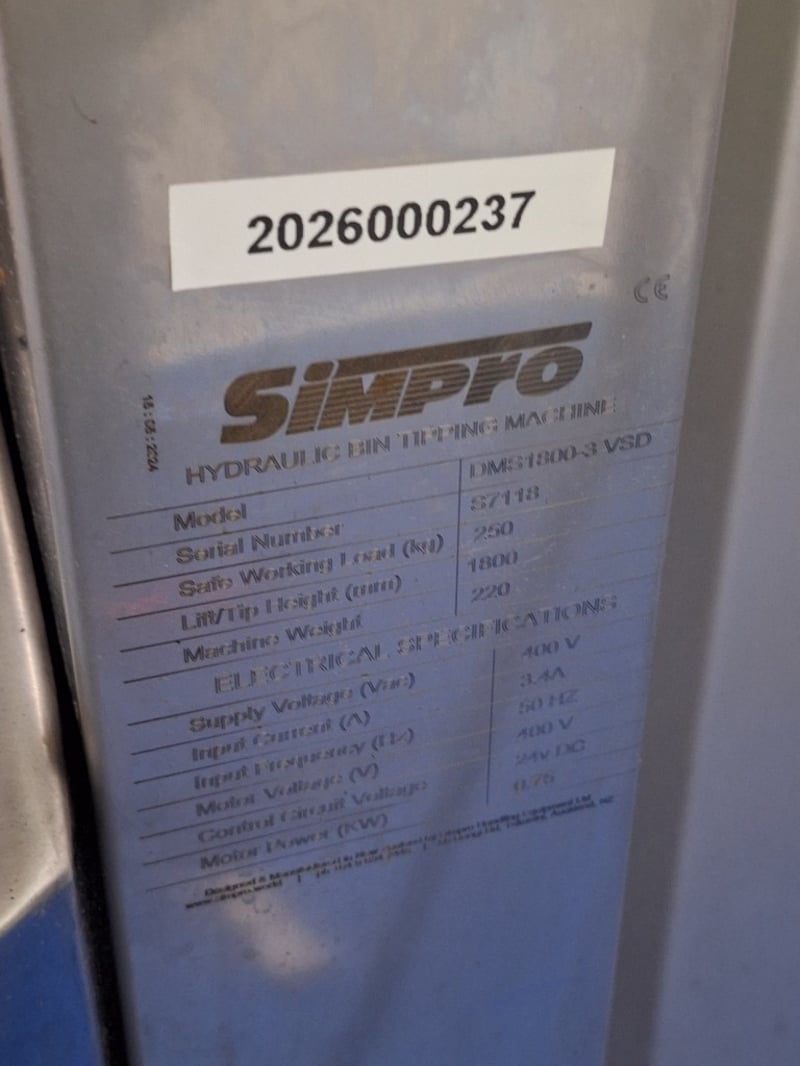 Simpro Hydraulic Bin-tipping Machine, Model: DMS1800-3 VSD, 3-phase, Stainless Steel Style