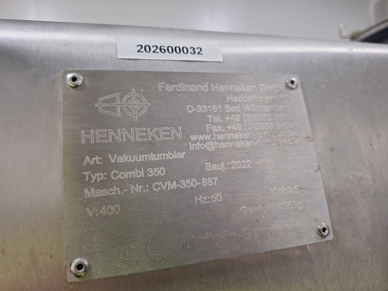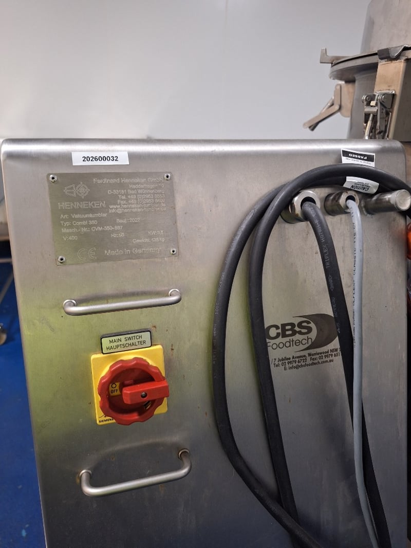 Henneken Combi 350 Vacuum Tumbler, Stainless Steel StyleDimensions Approx H:1680mm W:1550mm D:940mmNOTE: INSPECTIONS HIGHLY RECOMMENDED, BUYER TO PROVIDE OWN LABOUR AND TOOLS FOR SAFE REMOVAL OF ASSET